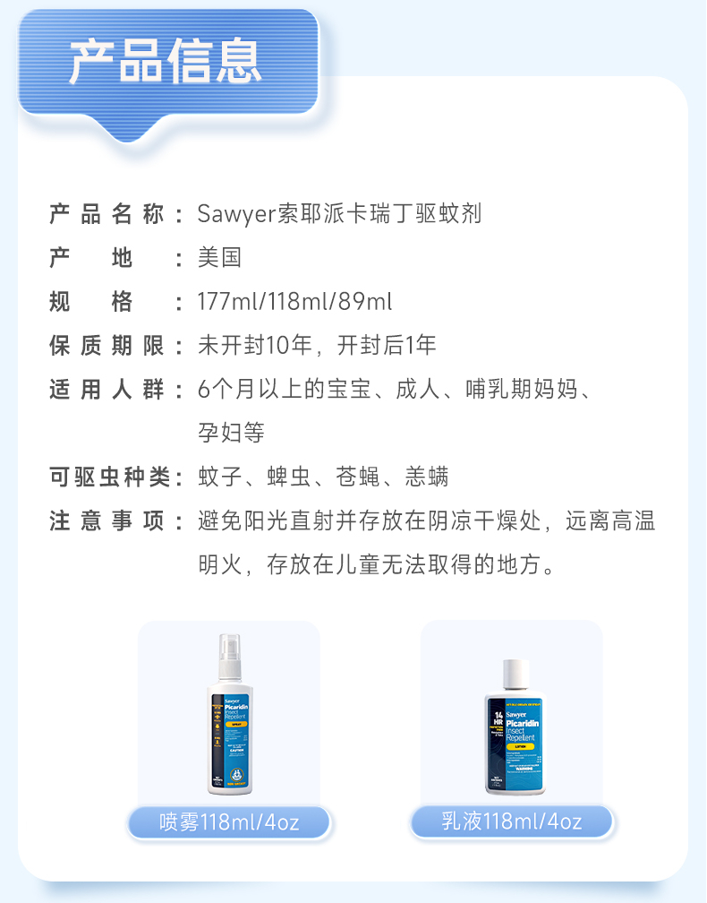 派卡瑞丁喷雾:喷雾质地,比乳液涂抹更方便,除了可以喷涂于皮肤,也可以喷涂于衣物。但含酒精,以及考虑到喷雾有吸入风险,不建议儿童首选这一款。实在要给儿童使用的话,也建议大人先喷在手心再涂抹于小朋友身上,大人自己喷涂时也需避头部。