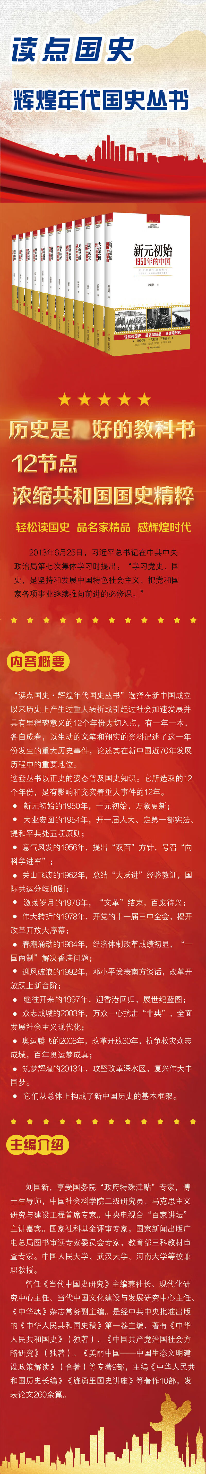 这套《读点国史:辉煌年代国史丛书》选择在共和国历史上产生过重大影响或者引起社会加速发展并充实着重大事件的12个年份为时间节点,一年一本,各自成卷,构成了共和国历史的基本框架。