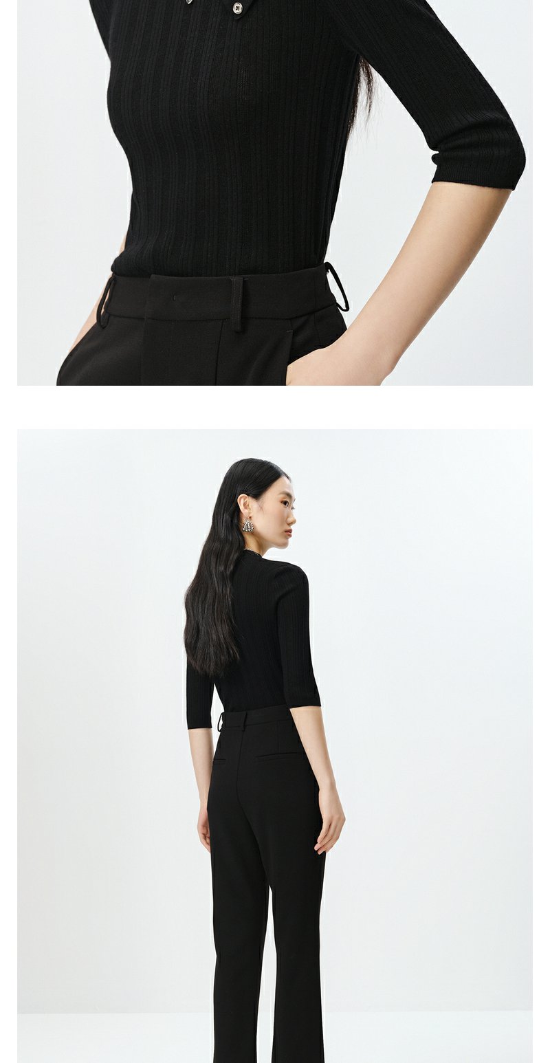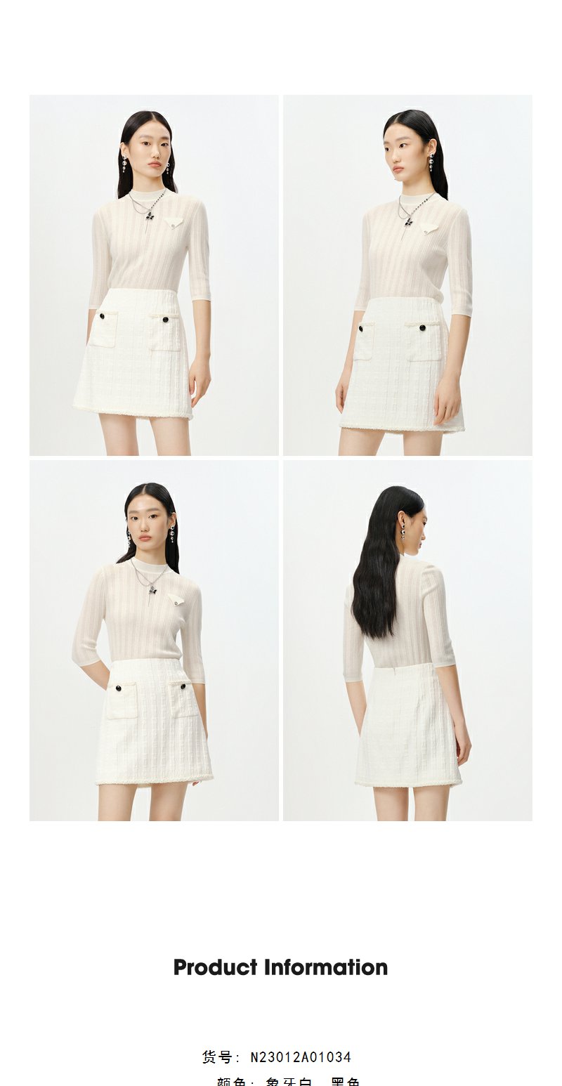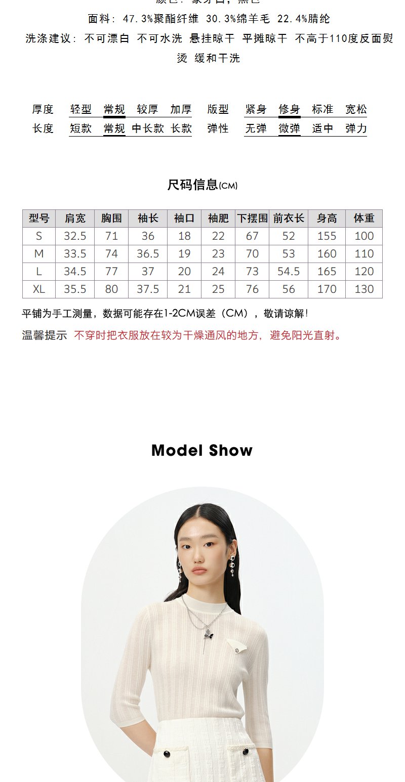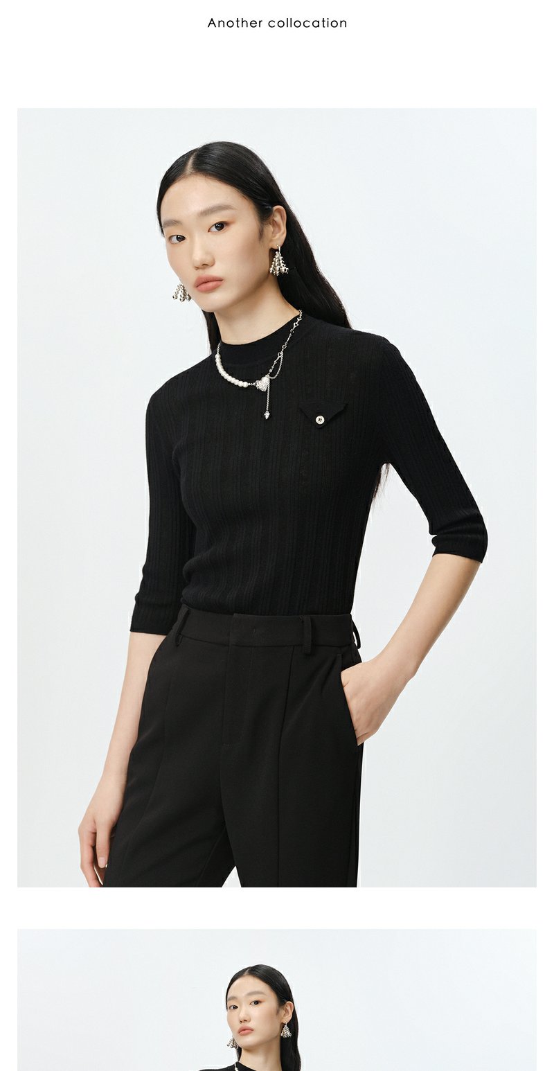 NEELLY纳俪商场同款半高领针织衫女竖坑条显瘦毛衣五分袖修身上衣