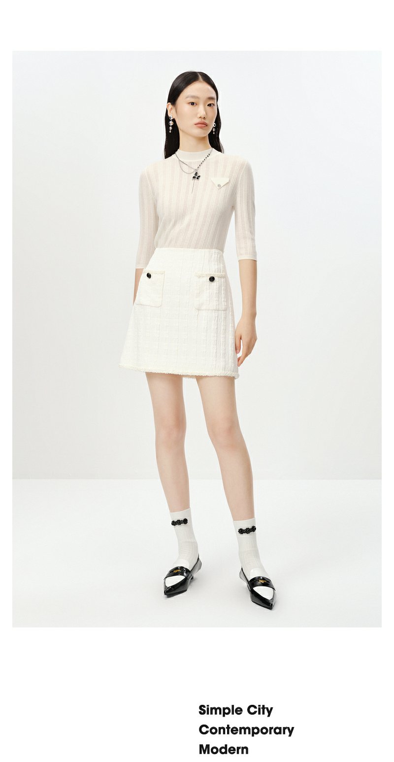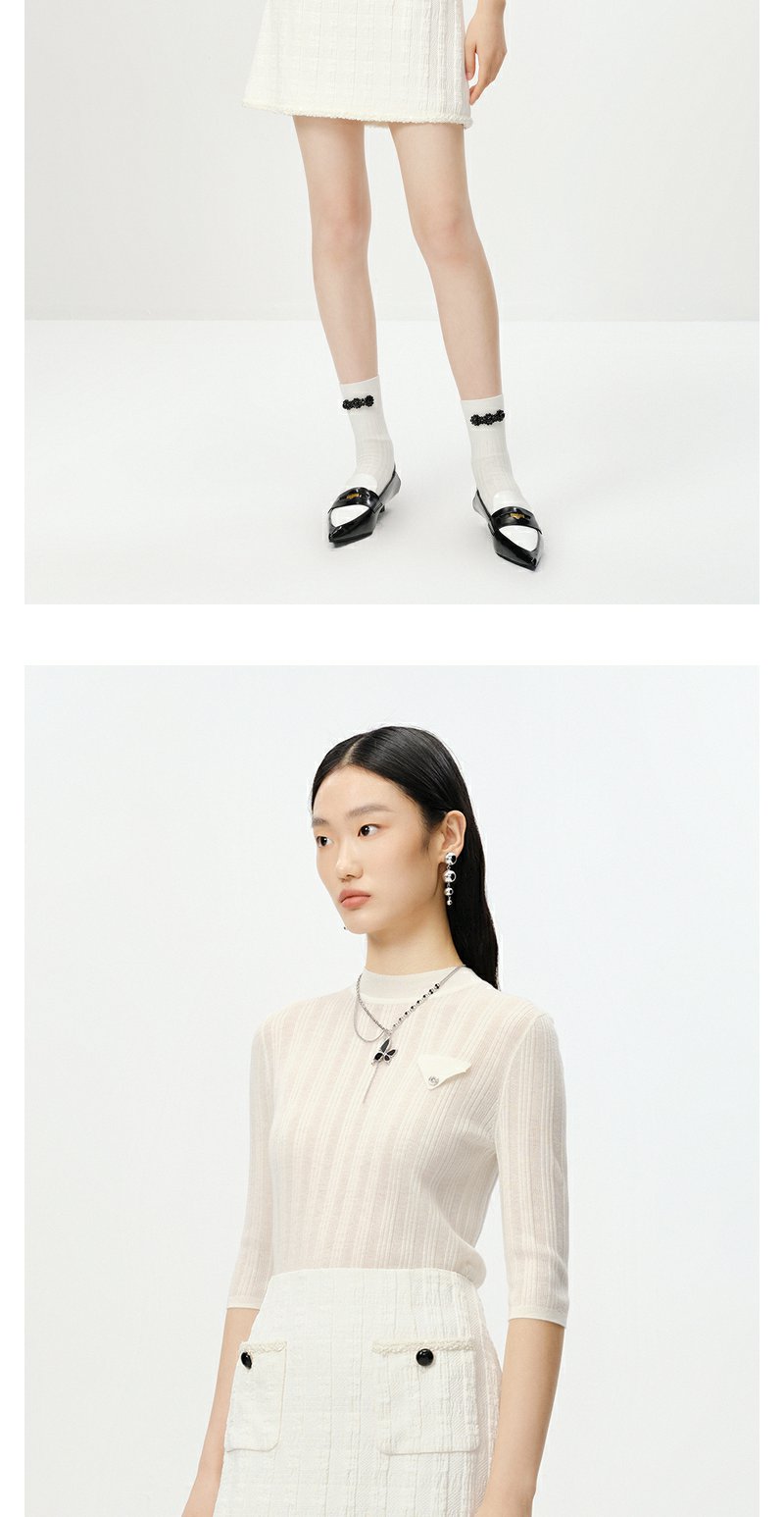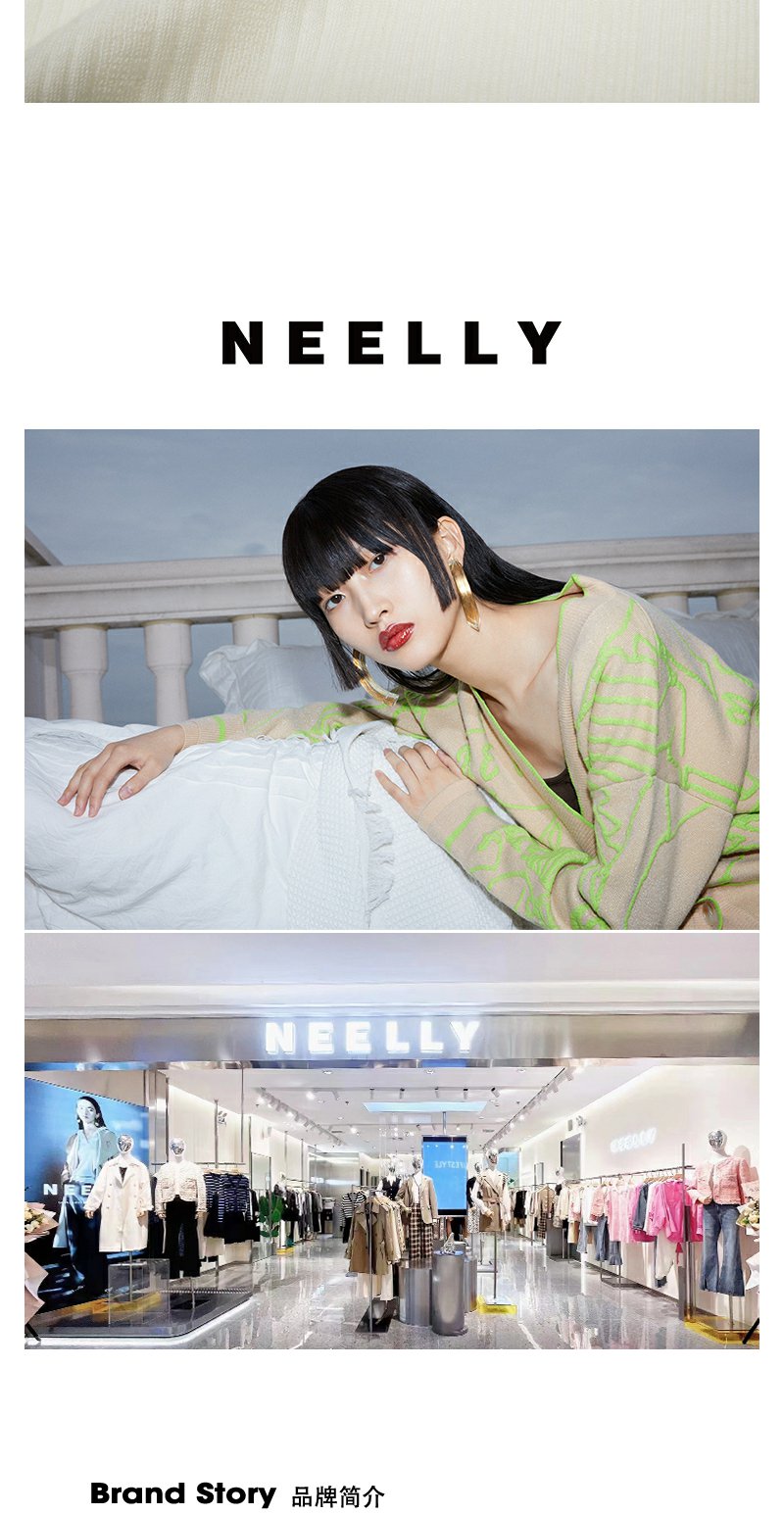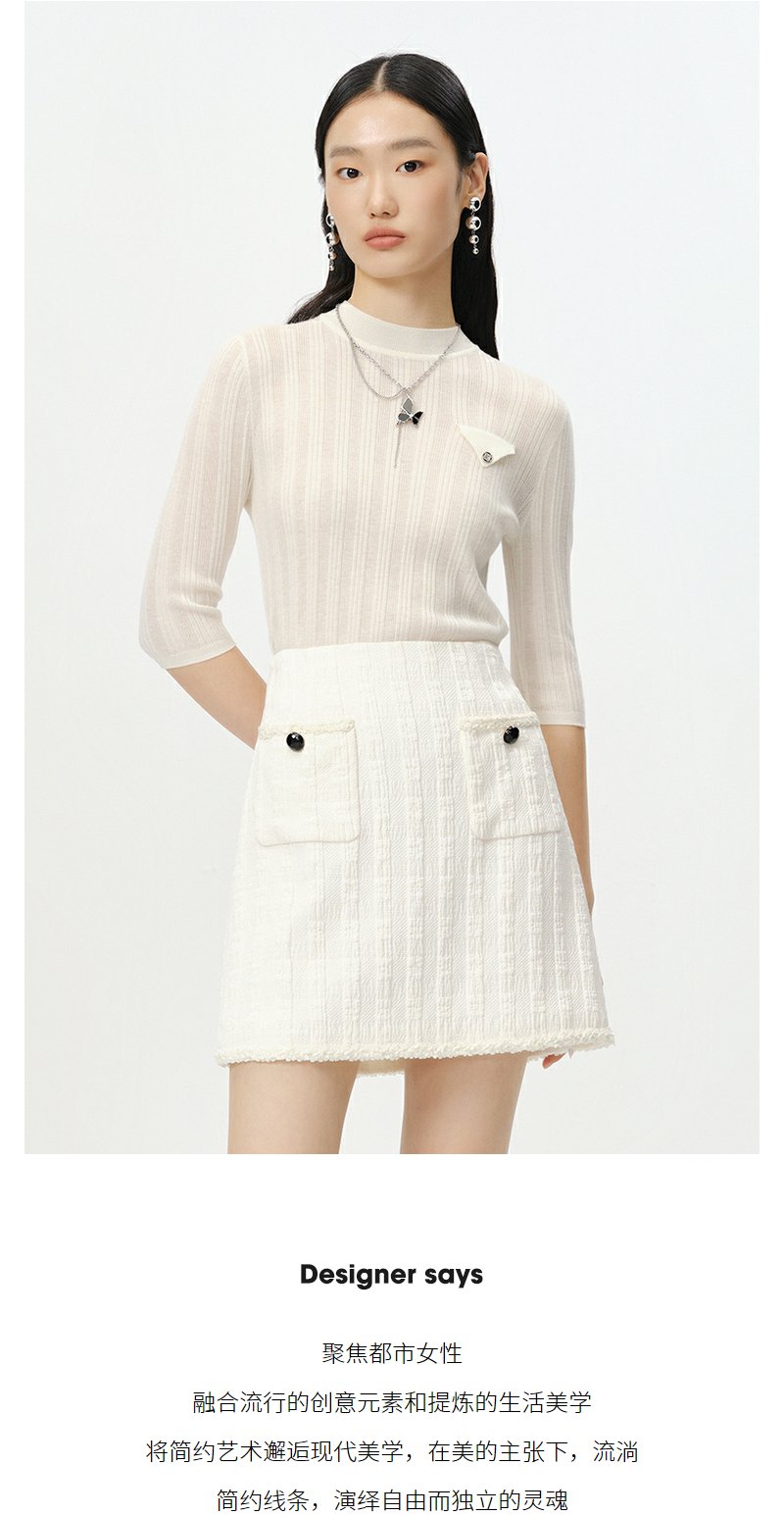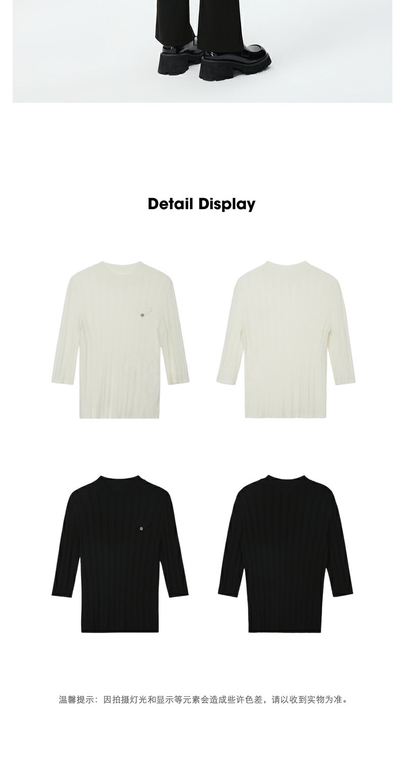 NEELLY纳俪商场同款半高领针织衫女竖坑条显瘦毛衣五分袖修身上衣
