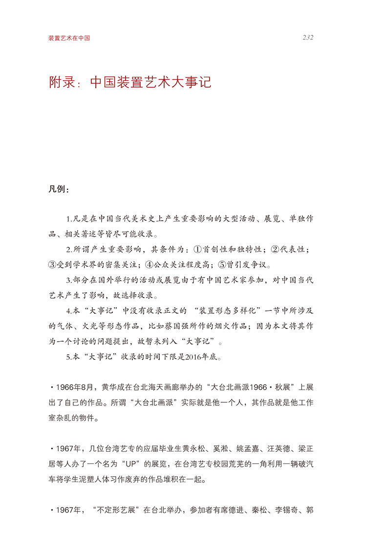 《装置艺术在中国》全书分五章,第一、二章探讨了装置的美学定位、装置的修辞语言、装置的起源和在西方的发展过程;第三章追溯和记录了中国装置艺术发展的过程和现状;第四章探讨了装置艺术在现阶段面临的一些相关问题;第五章是中国台湾、香港装置艺术发展的简略描述。后附装置艺术大事记是首次详细地将中国装置艺术从上世纪八十年代到2016年重要事件以编年方式加以记录整理。