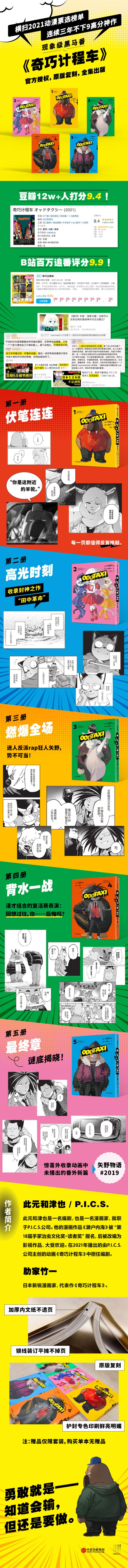 ·2021黑马神番《奇巧计程车》漫画化作品·横扫2021二次元票选榜单,连续三年不下9.0高分神作计程车司机小户川是一只性格孤僻、话不多的海象,他的生活看似平静,却被意外卷入一宗女高中生失踪案,他在寻找真相的过程中,遇到了形形色色的乘客:和混账前任剪不断关联的护士羊驼、想在社交媒体出名的河马、想成为大明星的贵宾犬、身为黑帮却心怀道义的狒狒……无力改变现实的你我,只能选择一副适合自己的面具。他们因小小愿望被践踏而走火入魔,在计程车这个特殊的移动空间奇妙地相遇了。