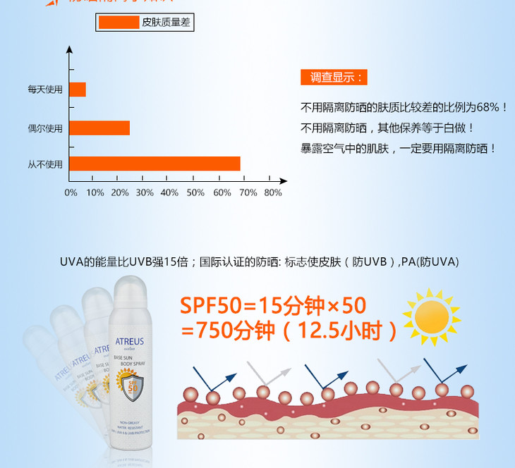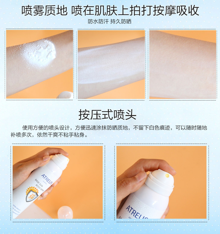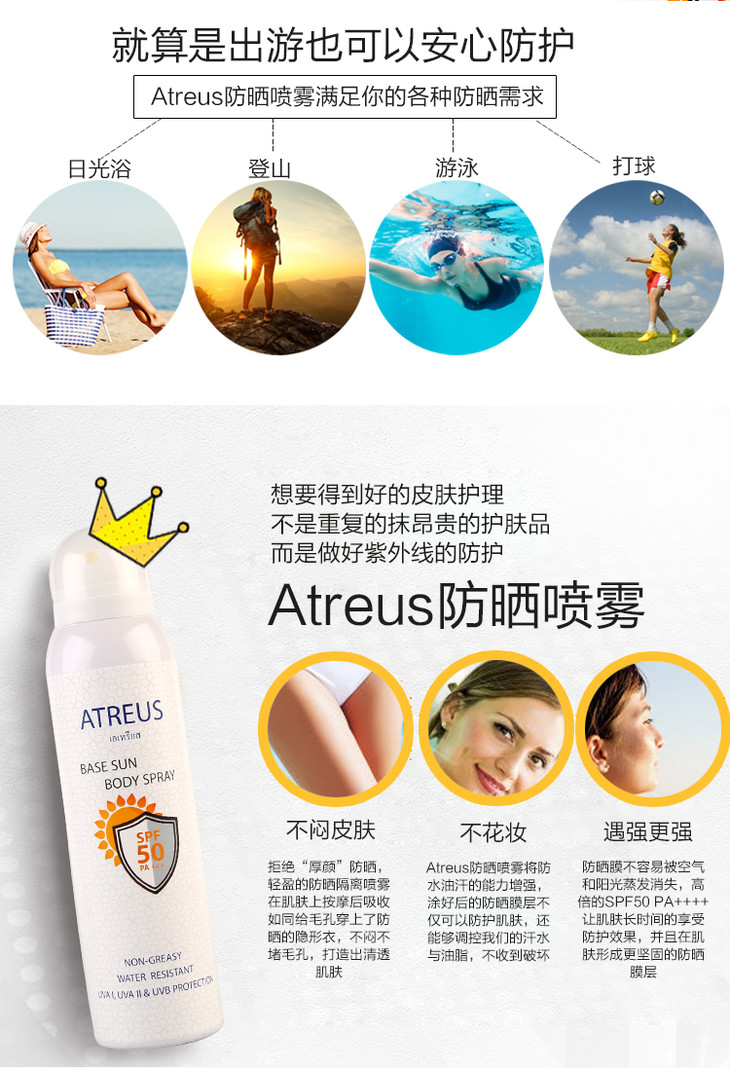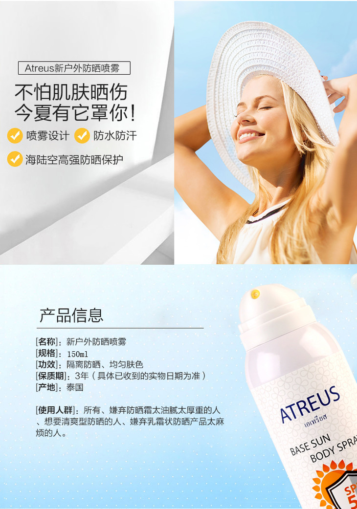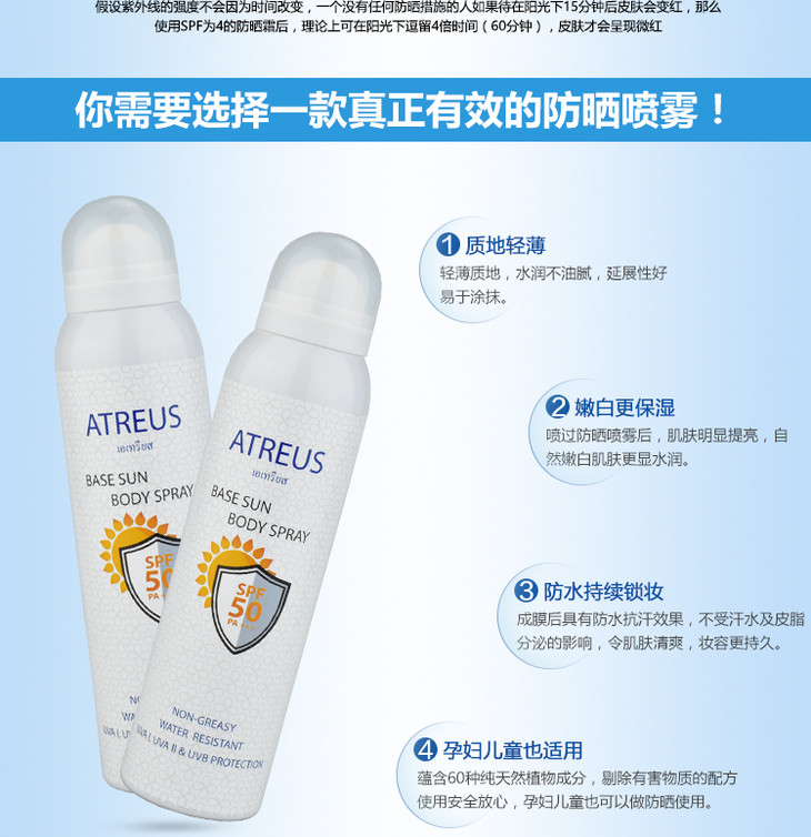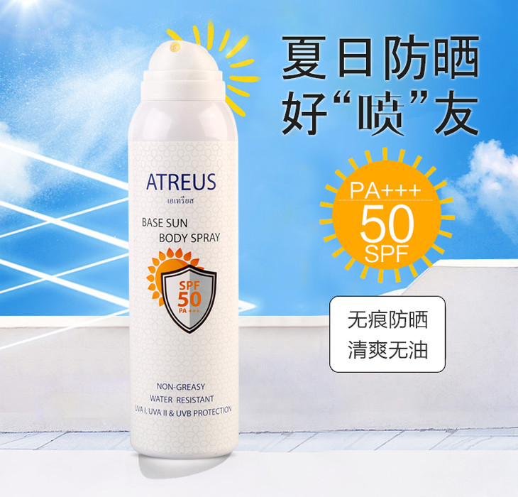 【现货】泰国防晒喷雾 Atreus SPF50+ 牛奶嫩白清爽无油防水防汗身体素颜霜