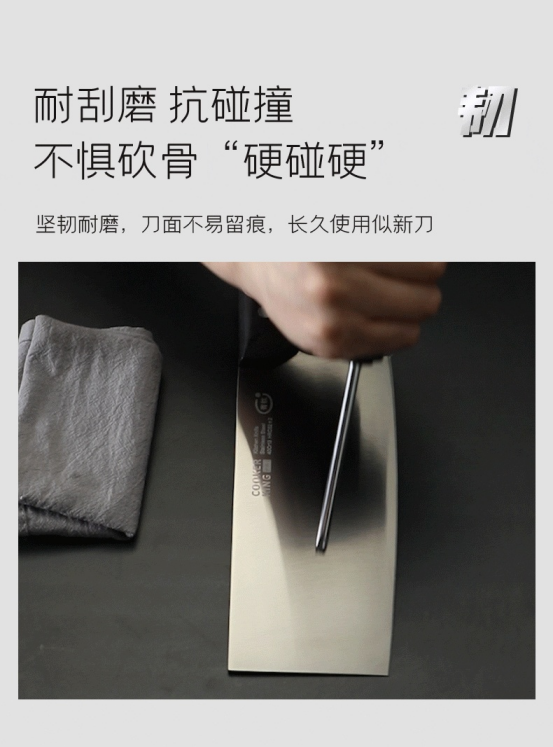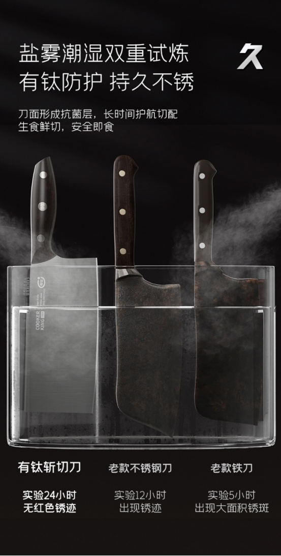 经常做饭的朋友们知道~刀具生锈真的让人很头疼 一股子铁锈味,还会掺杂到吃的食品上❌很不卫生 炊大皇极钛斩切刀,完全不用担心这个问题 ✅采用盐雾双重试炼技术, 防锈膜能够有效的将水分与钢材隔离开 达到抗腐蚀,长久不锈的效果! 防腐防锈,非常耐用,用个十年都不成问题👀