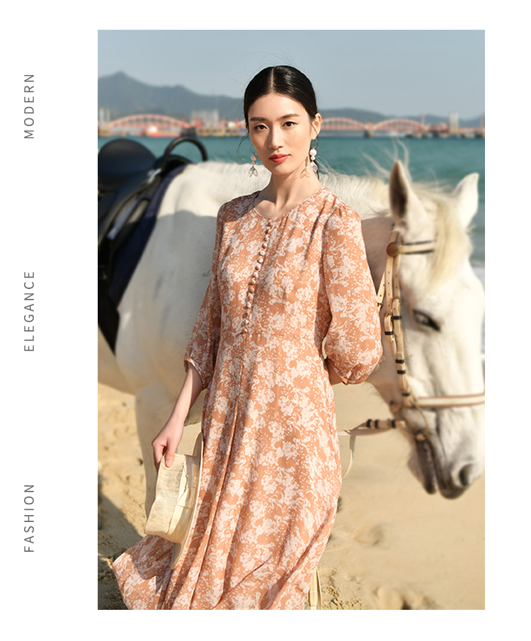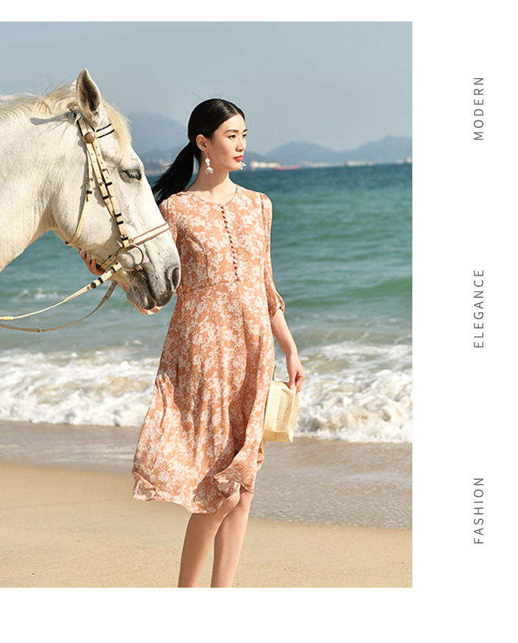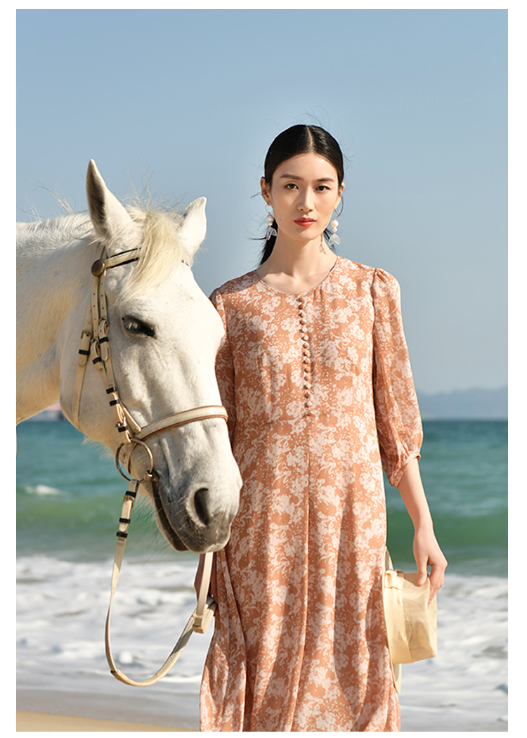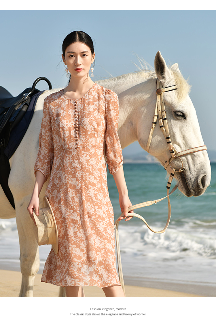 佐尔美夏季新款 真丝乔其印花中袖茶歇裙连衣裙女E32LS01