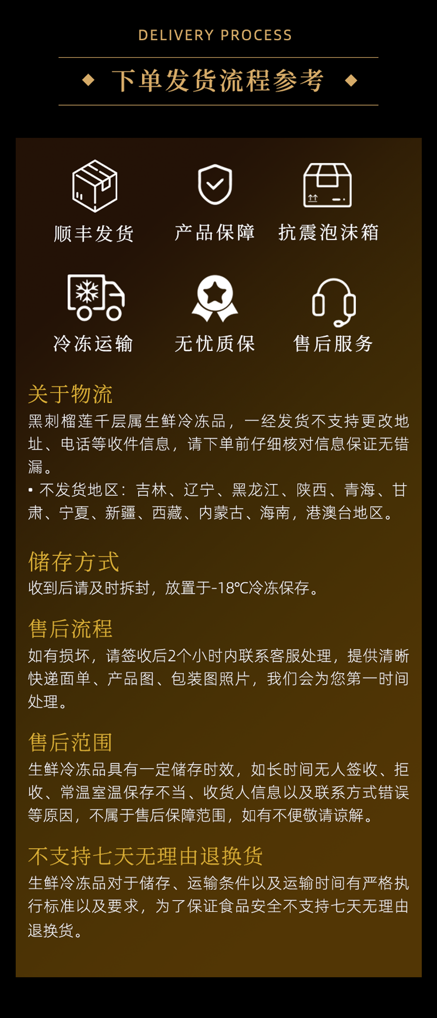 5、生鲜冷冻品具有一定保存时效,如长时间无人签收、拒收、常温室温保存不当、收货人信息以及联系方式错误等原因,不属于售后保障范围,如有不便敬请谅解。温馨提示:因食品特殊性,下单后不支持拦截、拒收、退货退款。一经下单不接受任何拦截和退换货服务。