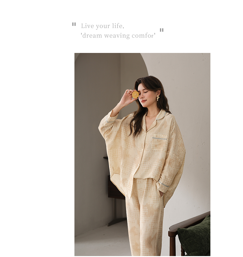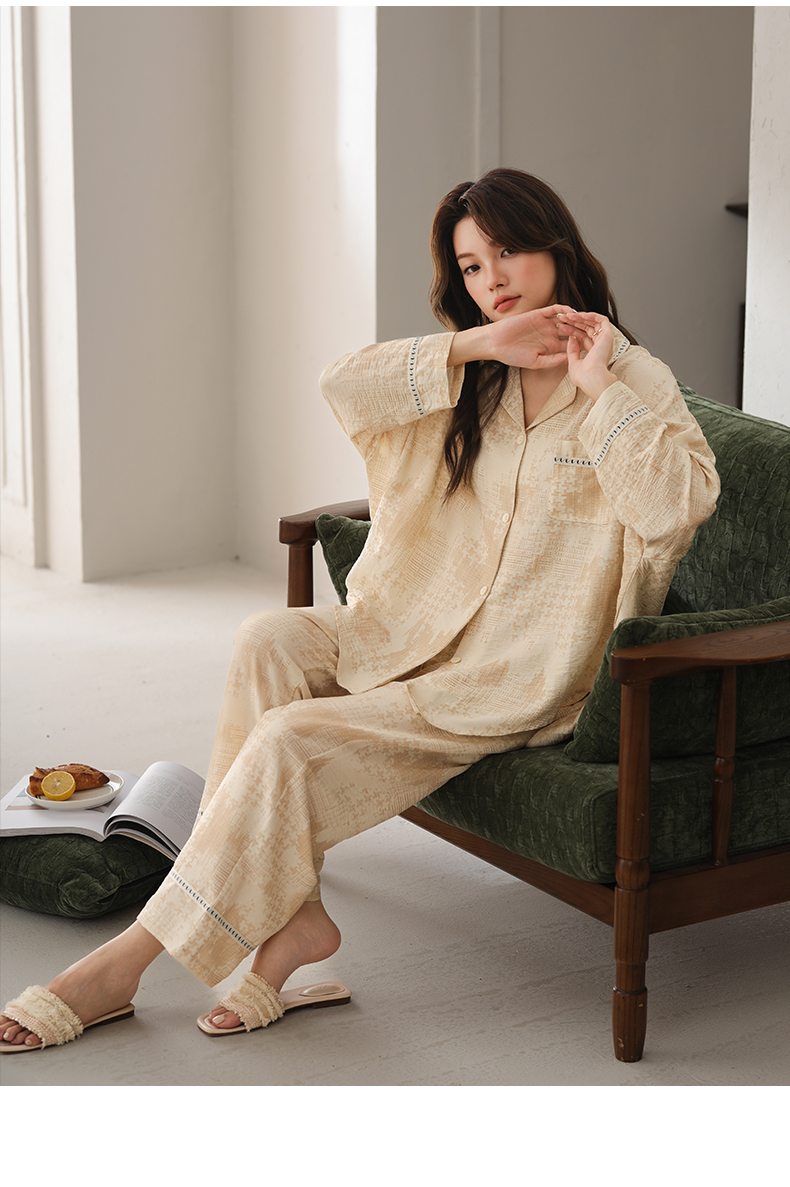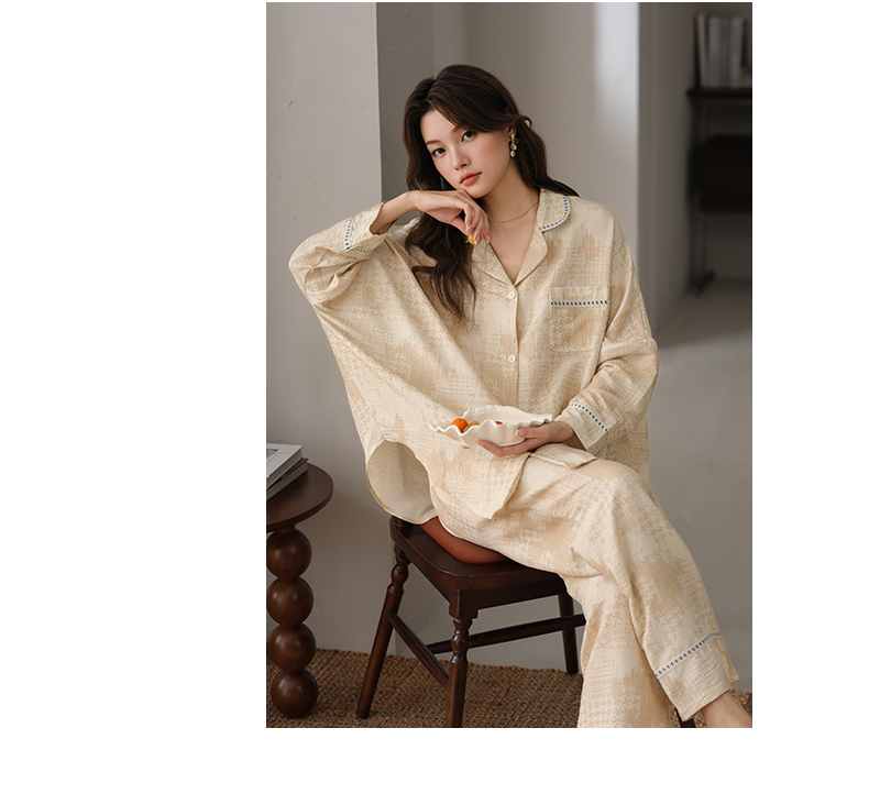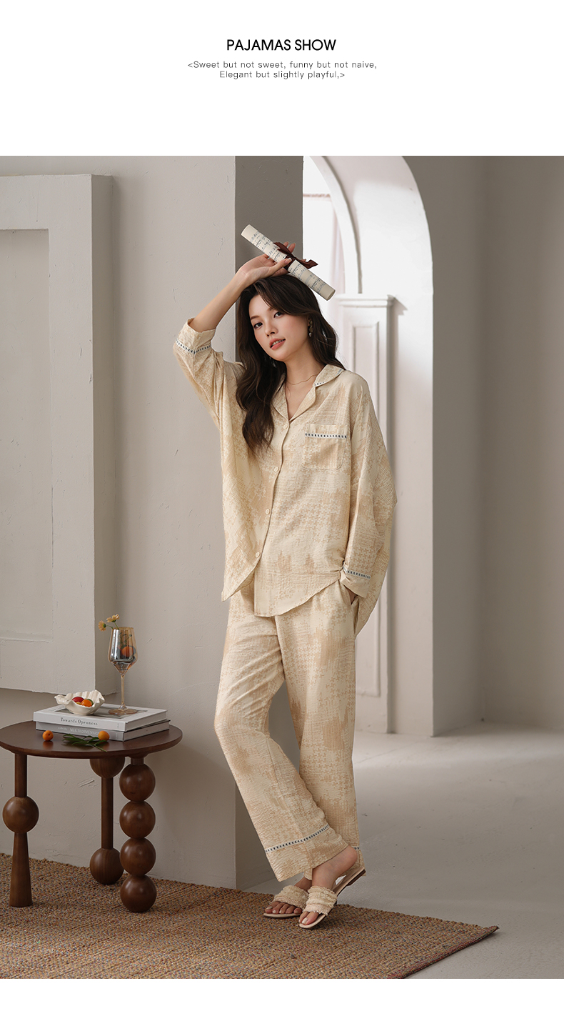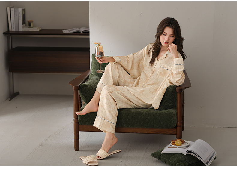 可人儿春秋季带胸垫泡泡绵女士长袖长裤睡衣可外出小众家居服套装