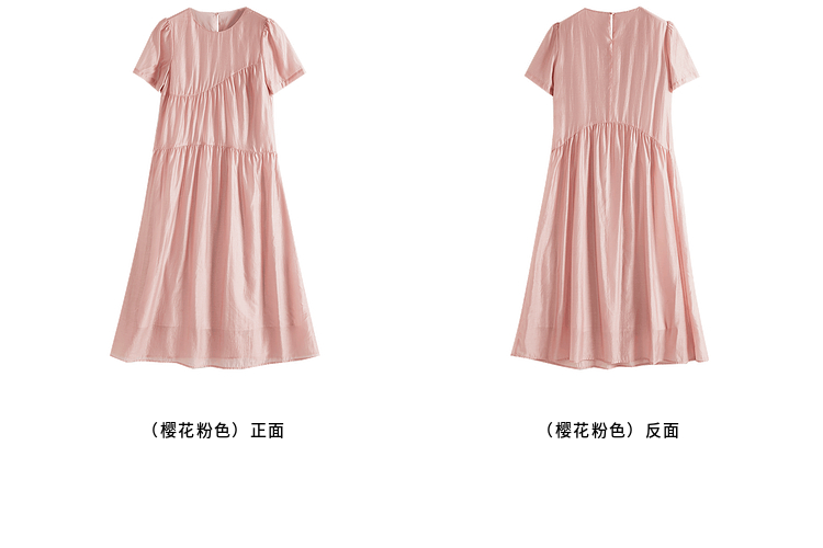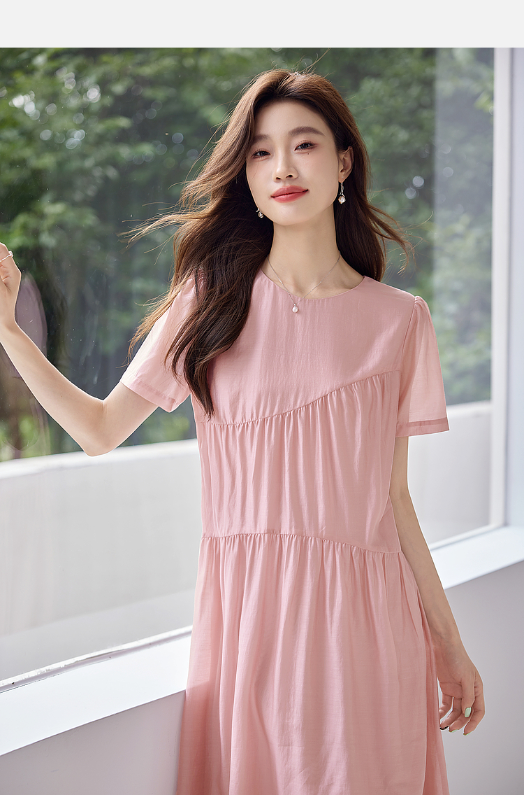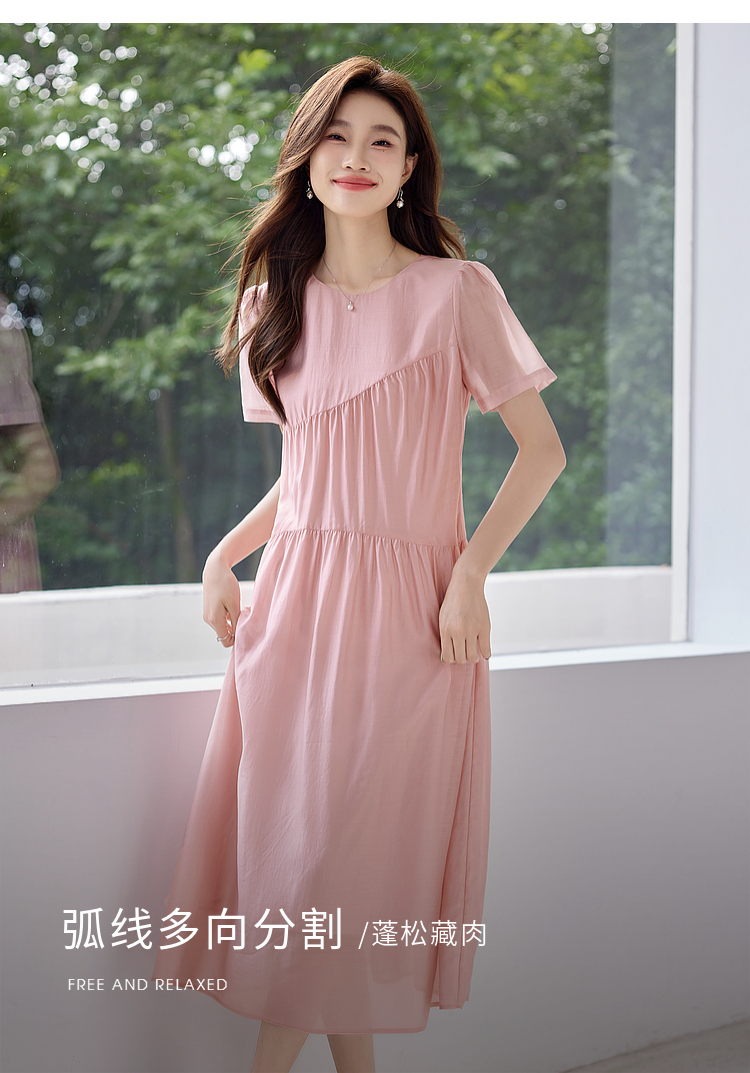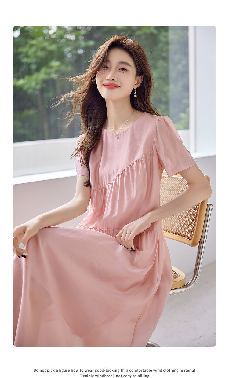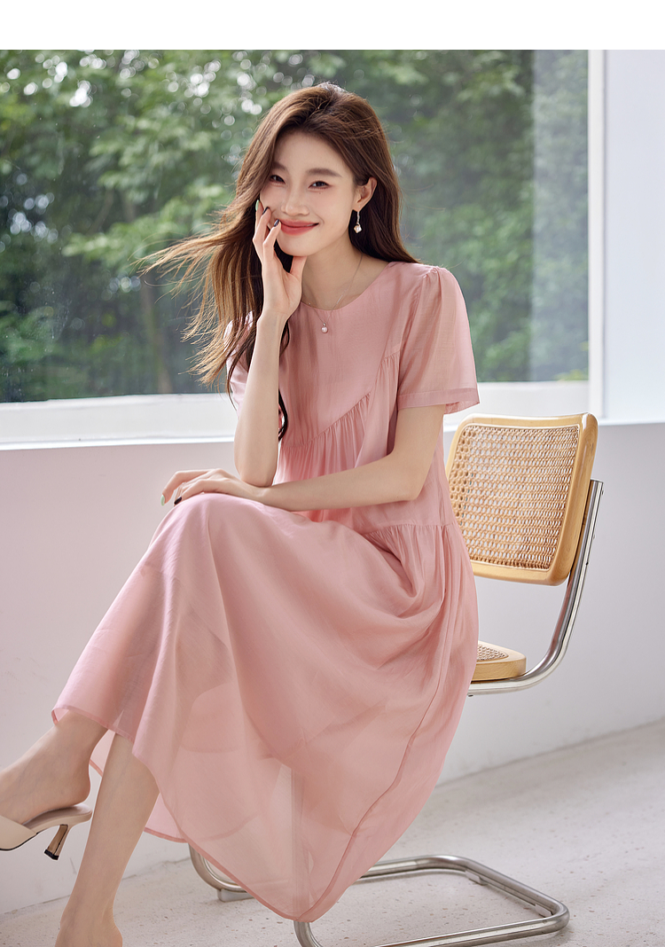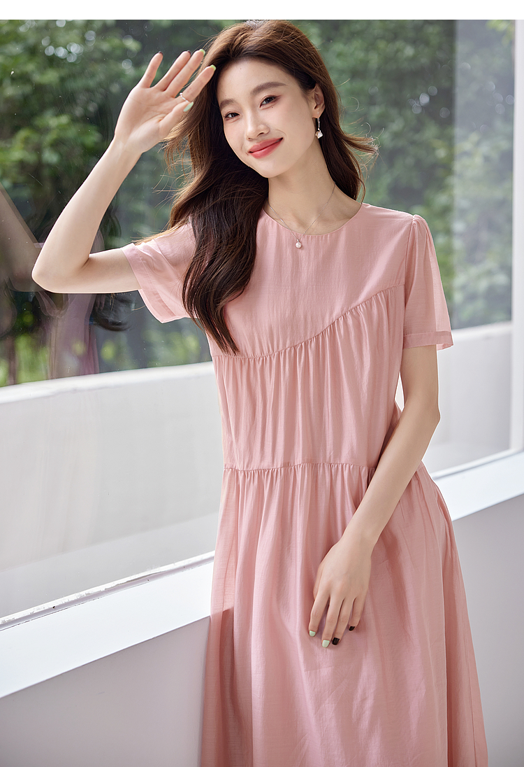 【五折购】熙世界薄荷曼波粉色天丝连衣裙宽松遮肉圆领初恋裙子2025夏新款