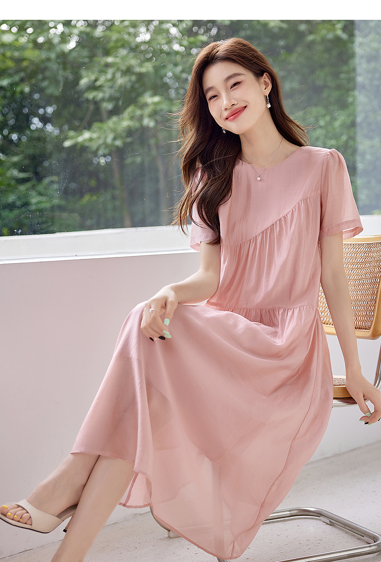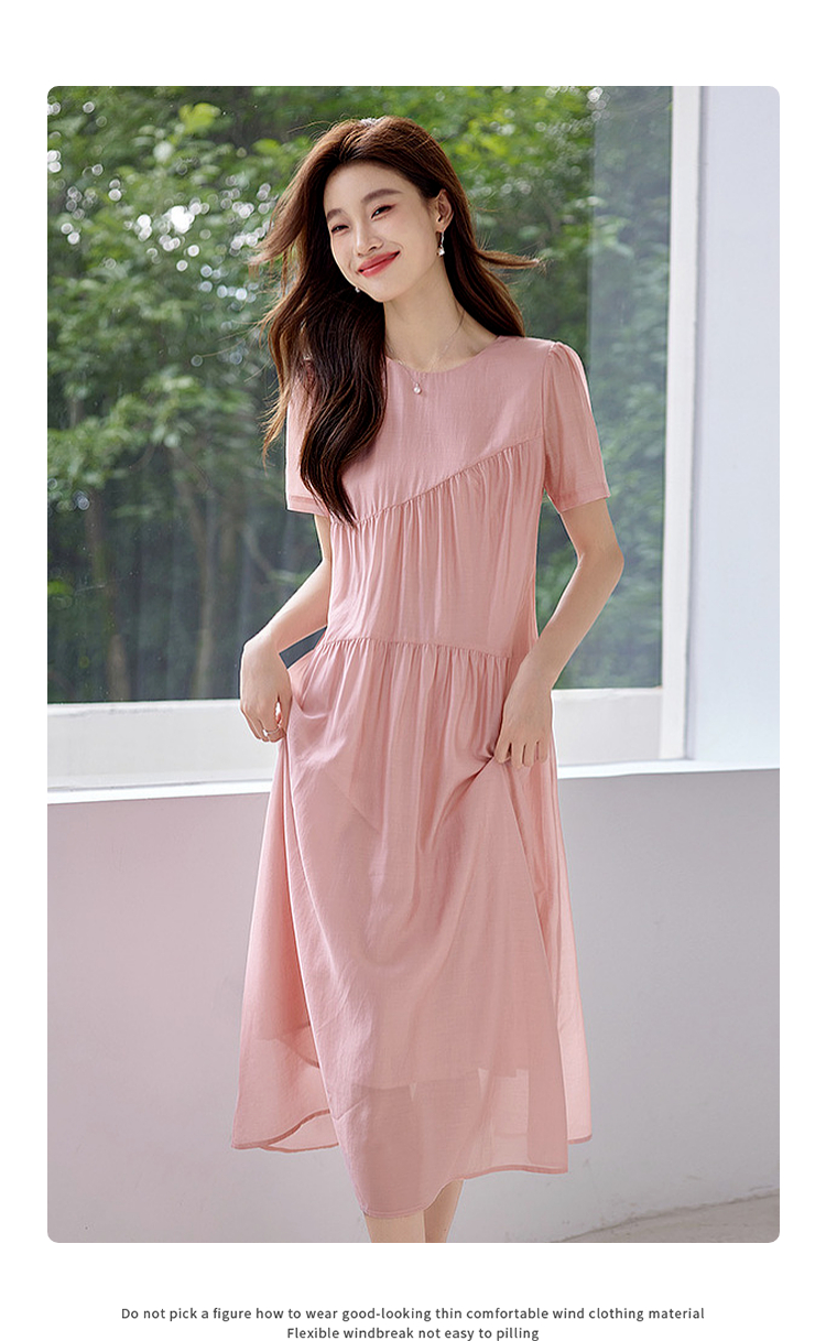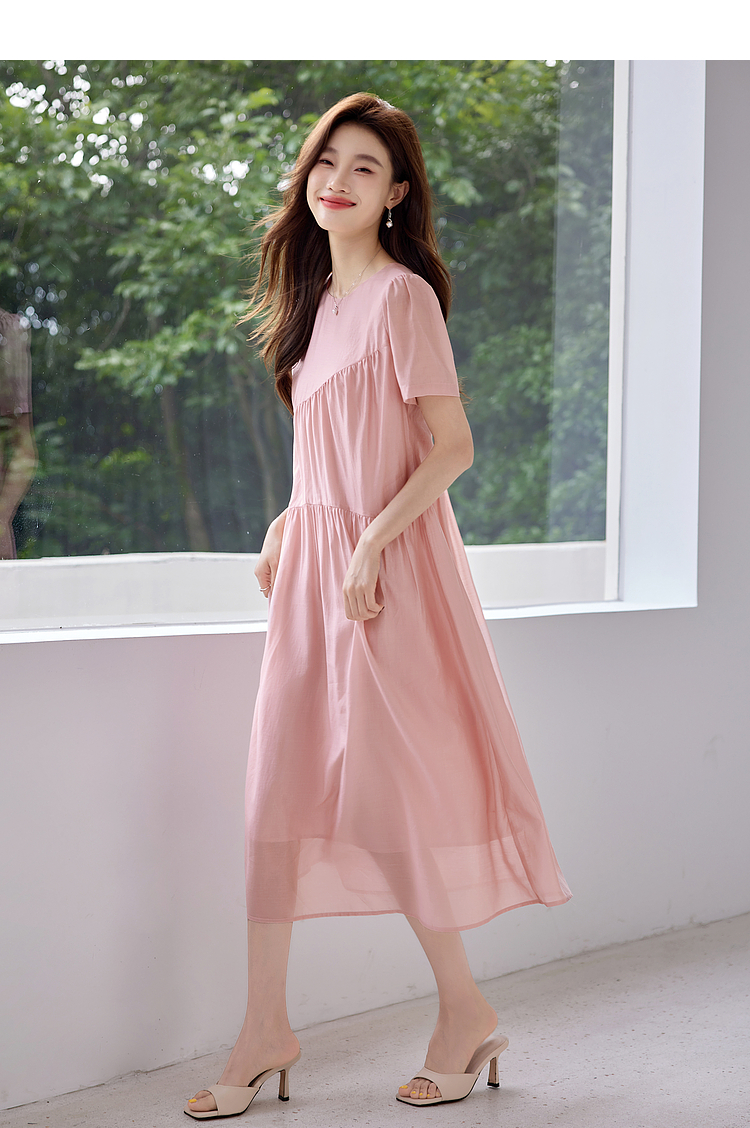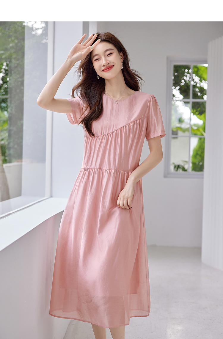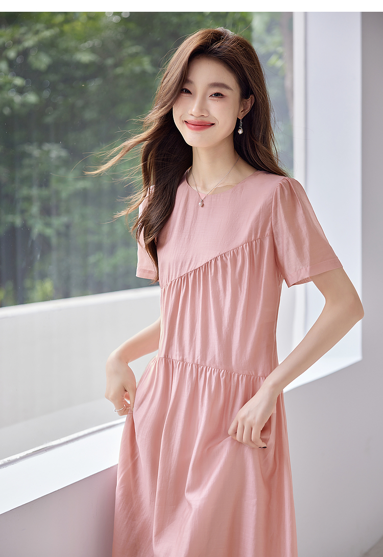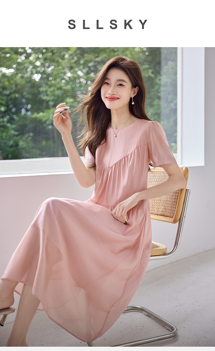 【五折购】熙世界薄荷曼波粉色天丝连衣裙宽松遮肉圆领初恋裙子2025夏新款