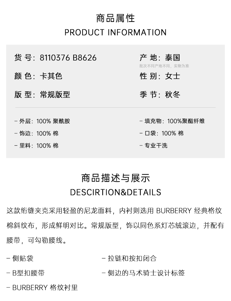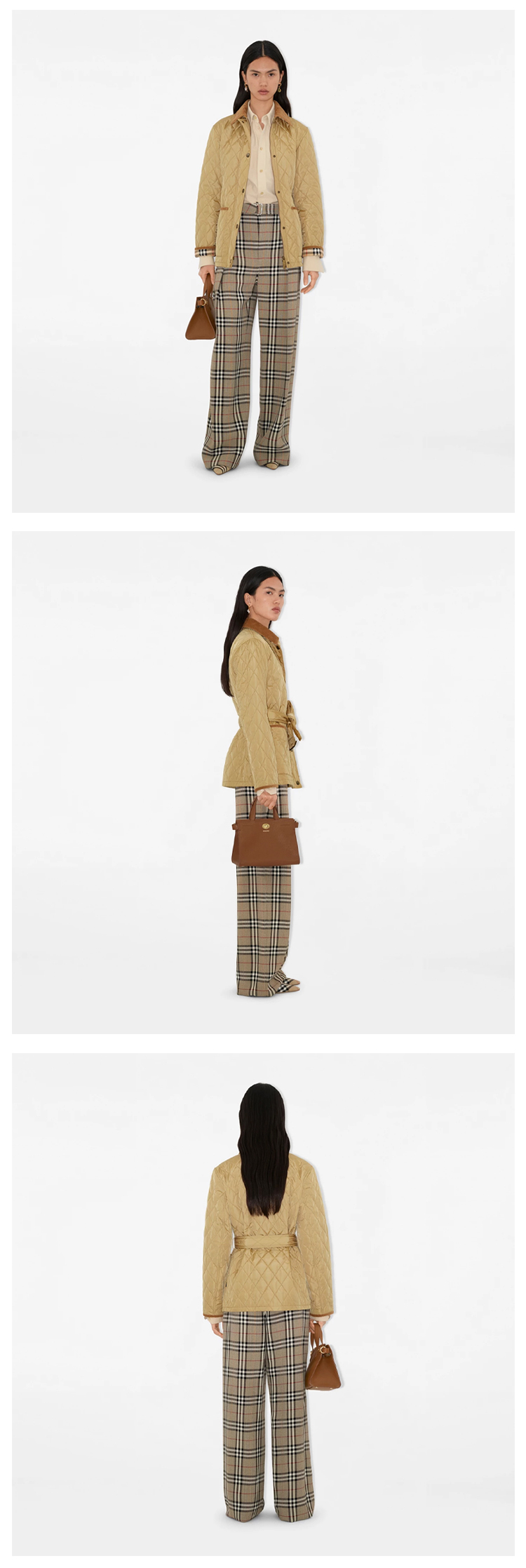BURBERRY 巴宝莉 女士马术骑士设计标签绗缝尼龙夹克棉服 卡其色 8110376 B8626