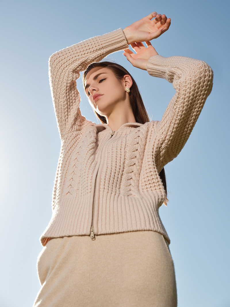 【大翻领绞花羊绒开衫】羊绒世家秋冬新品100%山羊绒粗棒针绞花毛衣外套