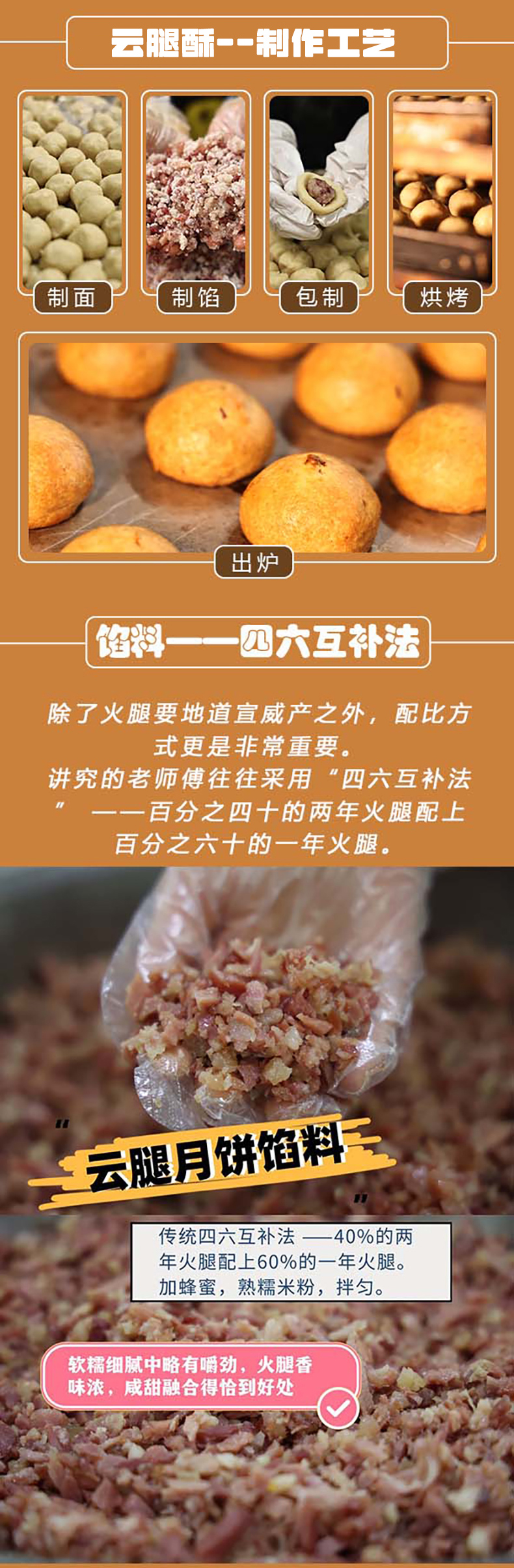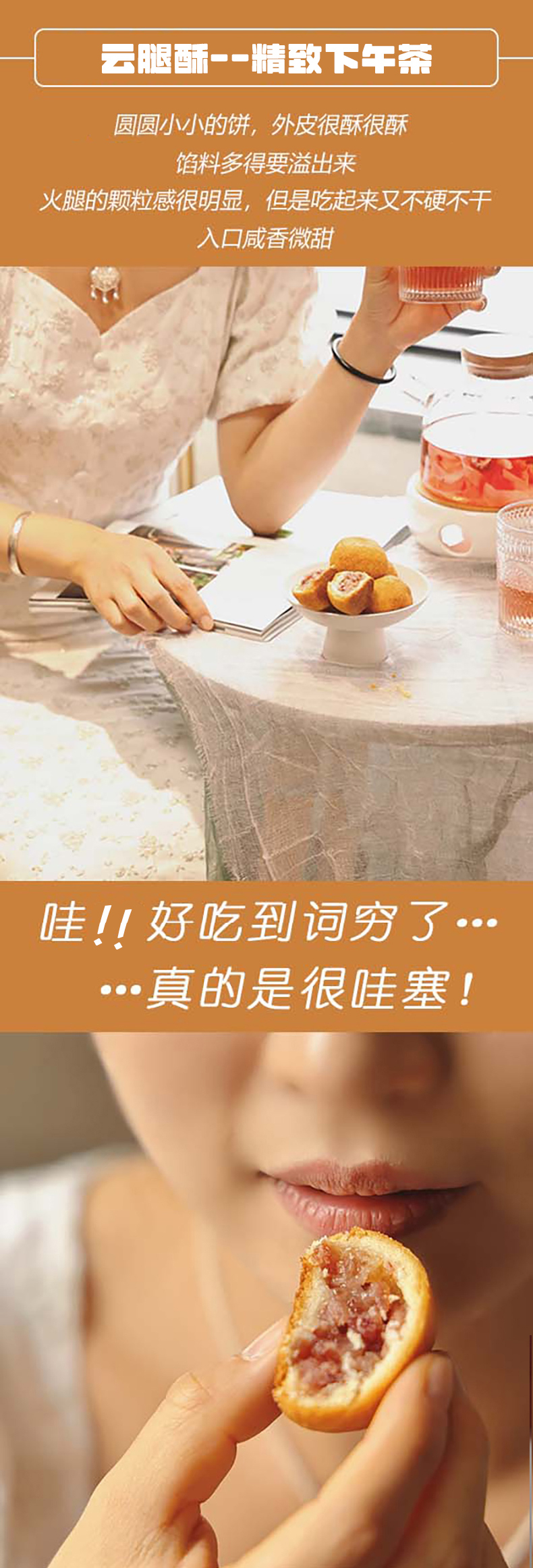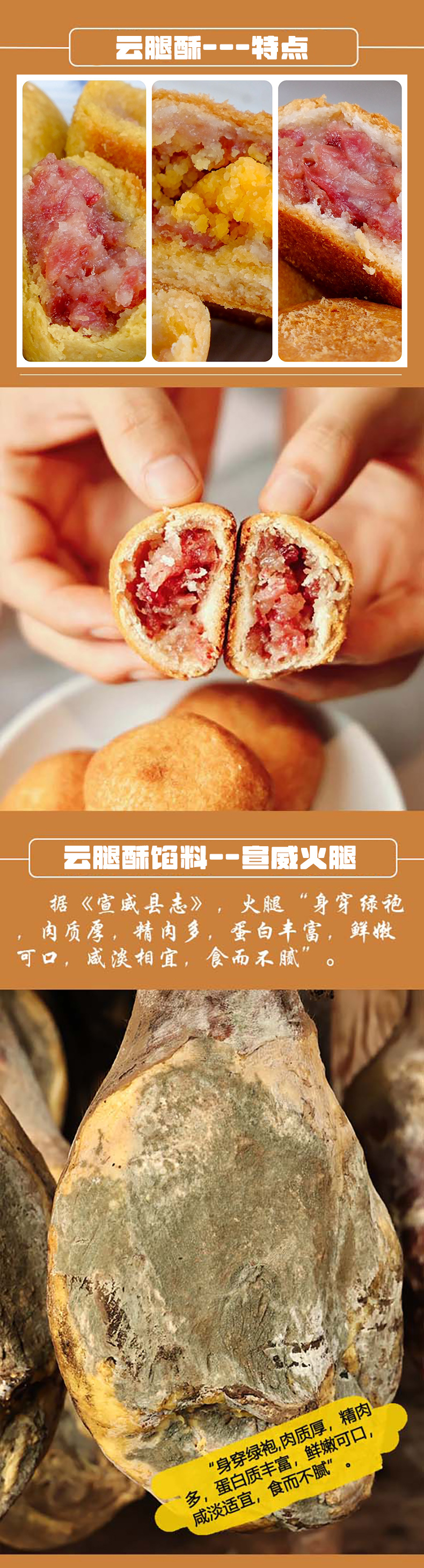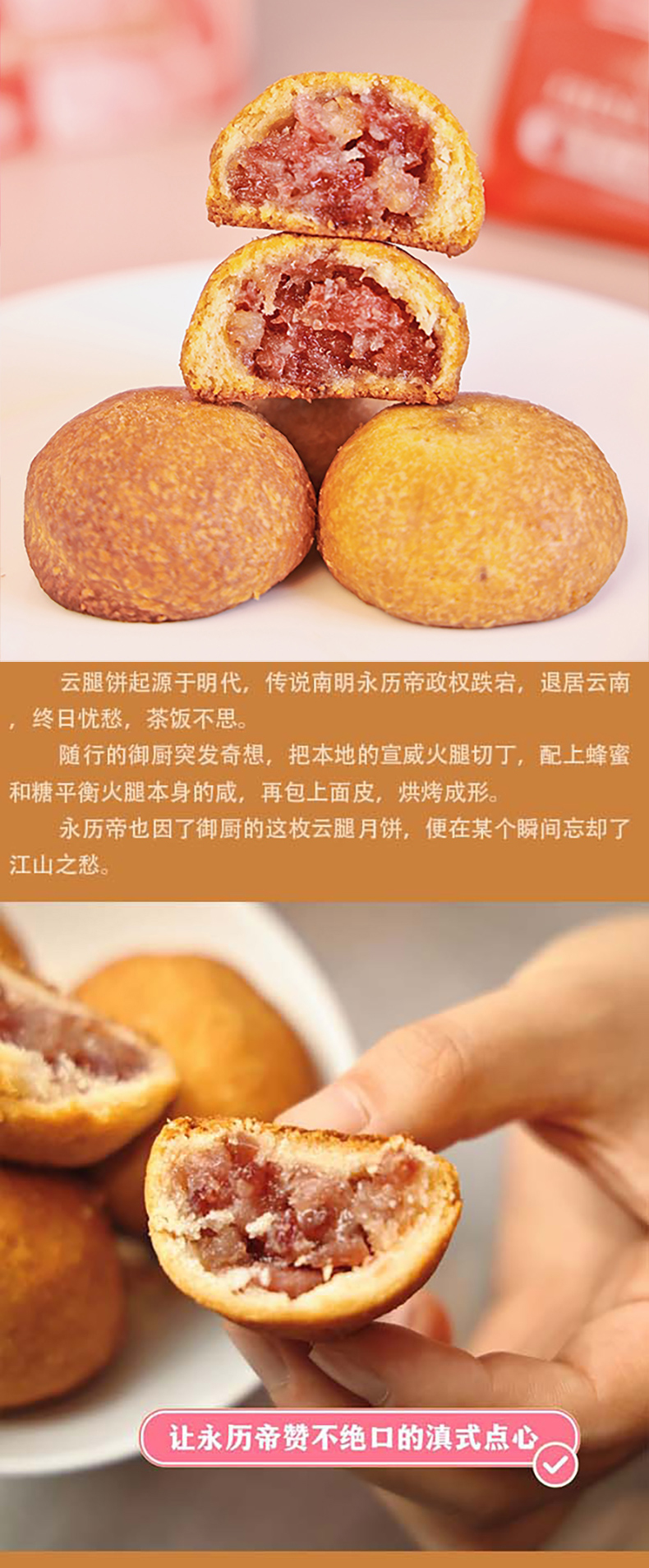 【产品口味】:饼皮外脆内软,入口酥而不散,层次分明!馅料鲜甜带咸,油而不腻,火腿肉香浓郁,又粒粒分明。云南经典小食!
