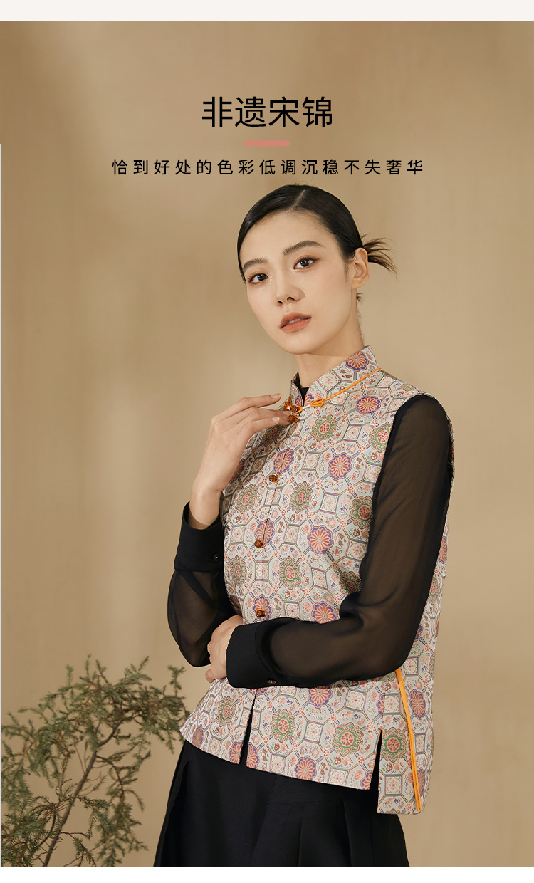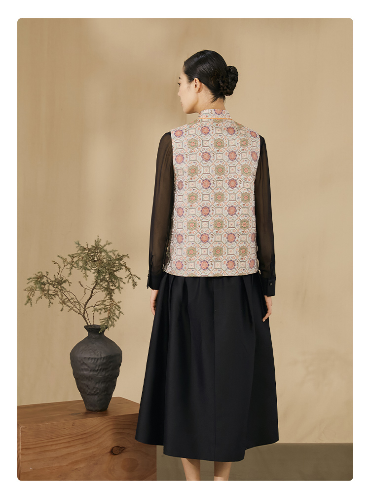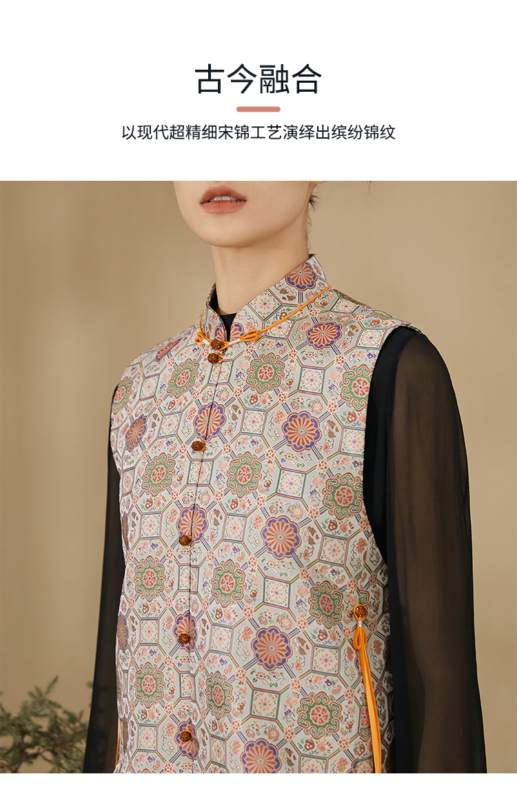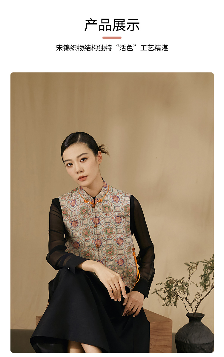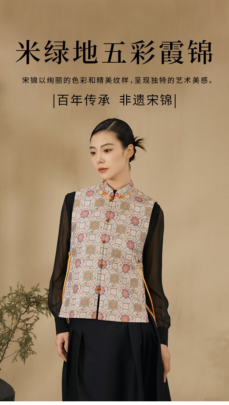 SAINTJOY/上久楷宋锦女士马甲 米绿地五彩霞锦 复古 新中式 马夹 DWS24001
