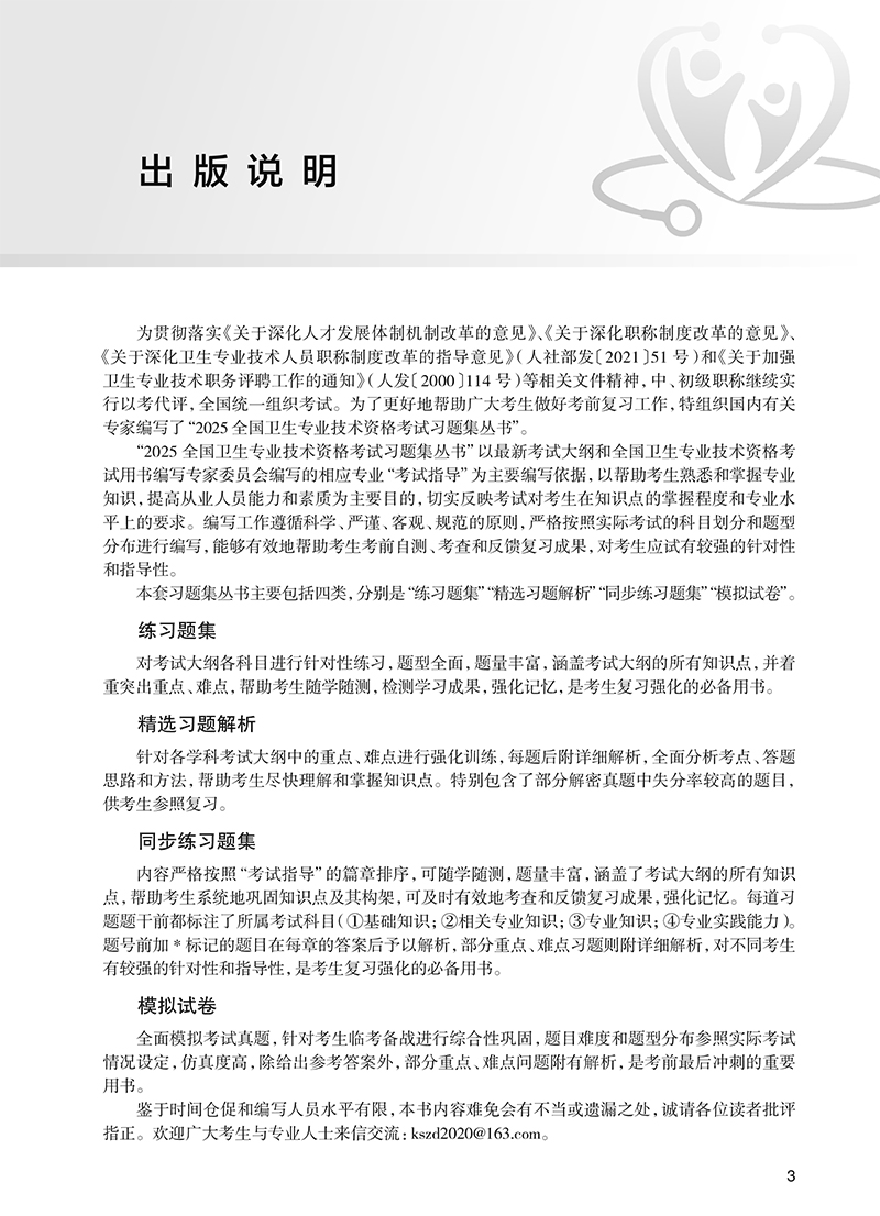 由国家卫生健康委人才交流服务中心特组织国内有关专家、教授编写的“卫生专业技术资格考试指导”系列图书,紧跟考试大纲,按照考试指导用书、要点精编、练习题集、同步练习题集、精选习题解析、模拟试卷6本书进行编写,形成了考点讲解、习题演练和考前冲刺模拟的完整备考体系。内容重在考查大纲中要求的临床常见病、多发病的病因、发病机制、临床表现、辅助检查、治疗要点、护理措施,以及护理学基础的有关理论和操作技术。本书对考试大纲各科目进行针对性练习,题型全面,题量丰富,涵盖考试大纲的所有知识点,并着重突出重点、难点,帮助考生随学随测,检测学习成果,强化记忆,是考生复习强化的必bei用书。
