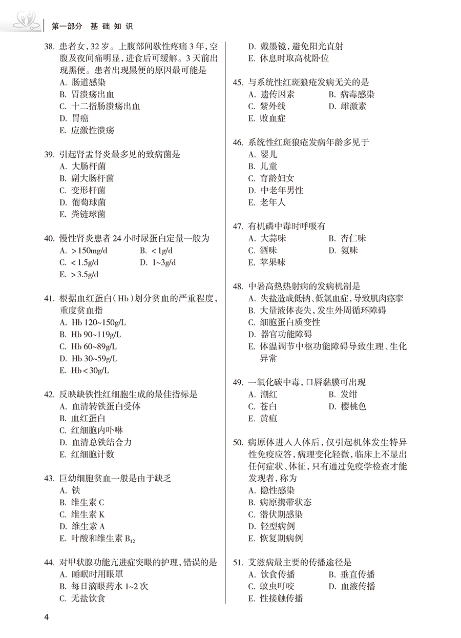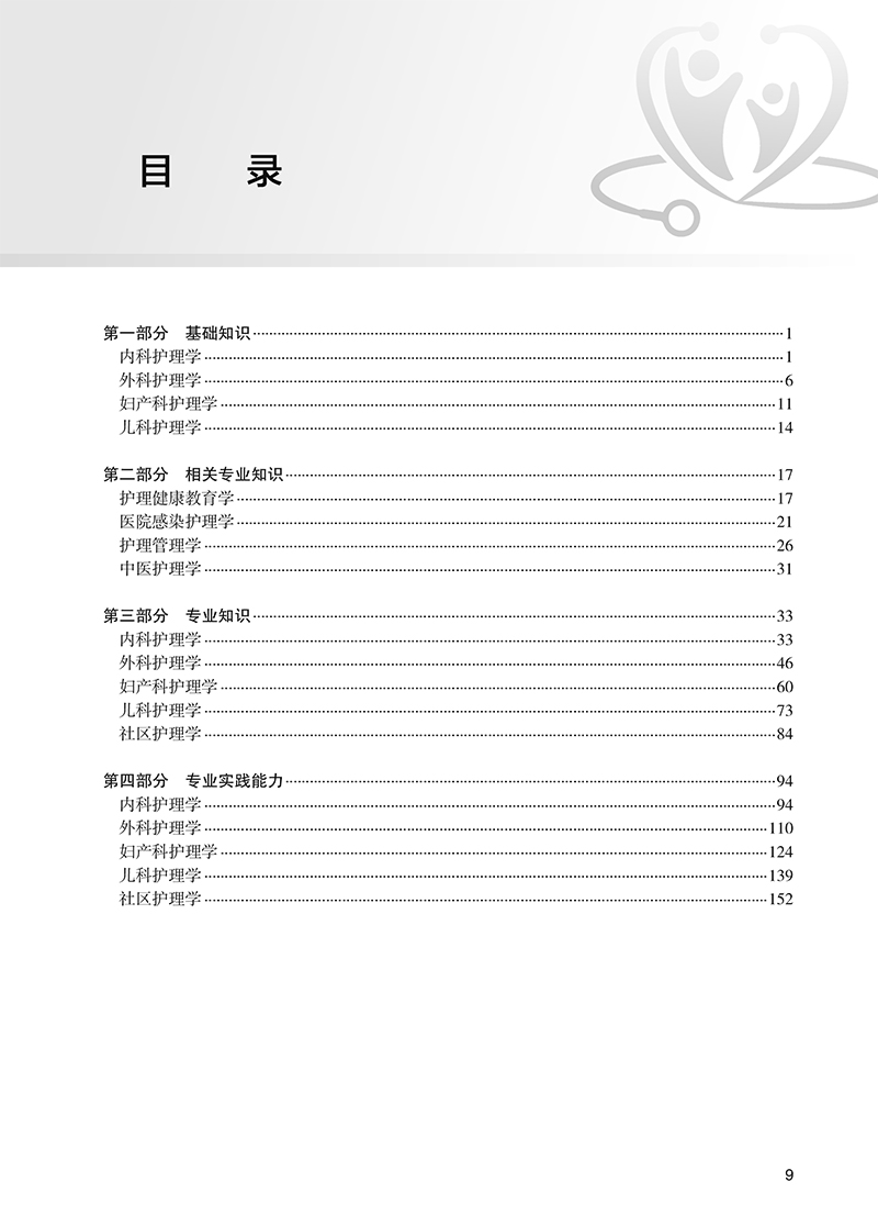 第一部分 基础知识/1 内科护理学/1 外科护理学/6 妇产科护理学/11 儿科护理学/14 第二部分 相关专业知识/17 护理健康教育学/17 医院感染护理学/21 护理管理学/26 中医护理学/31 第三部分 专业知识/33 内科护理学/33 外科护理学/46 妇产科护理学/60 儿科护理学/73 社区护理学/84 第四部分 专业实践能力/94 内科护理学/94 外科护理学/110 妇产科护理学/124 儿科护理学/139 社区护理学/152