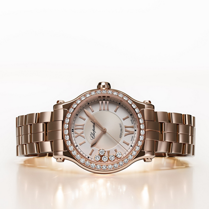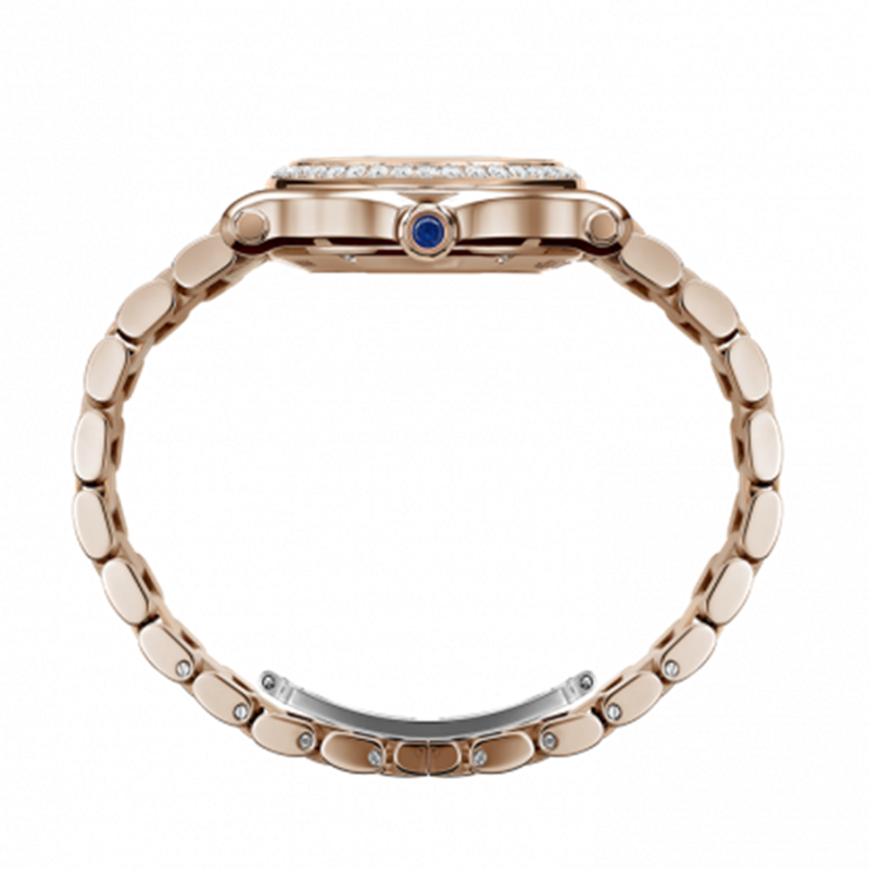 镜面 材质 | 蓝宝石水晶玻璃 | 表盘 | 18k玫瑰金表壳 镶钻表圈 银色中央饰有玑镂雕纹表盘,海蓝色移印元件,5颗灵动钻石,金色罗马数字时标和海蓝色铁轨式分钟圈,镀金锥形时针和分针,镀金棒形秒针 钻石1.49克拉 背透 |