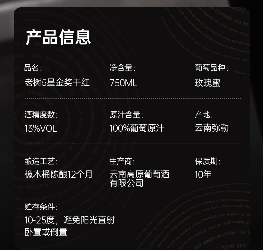 云南红金奖老树5星干红葡萄酒13度750ml弥勒酒庄(选两箱更划算!)