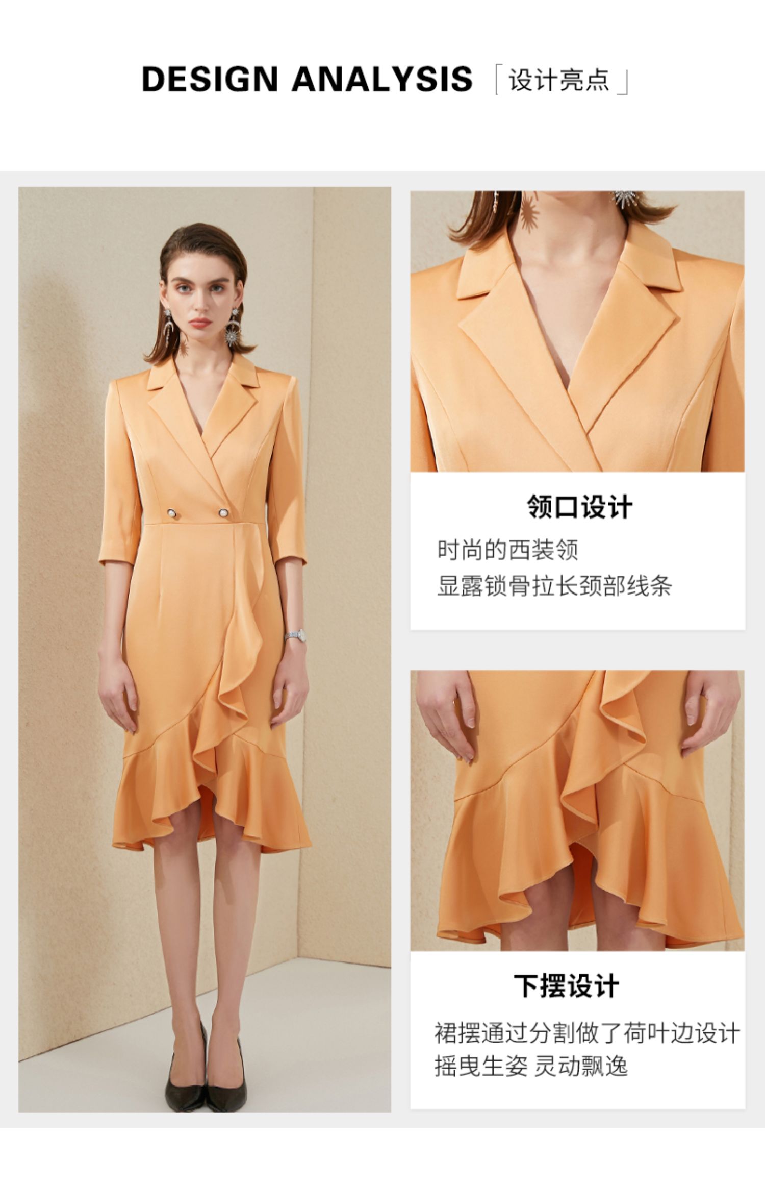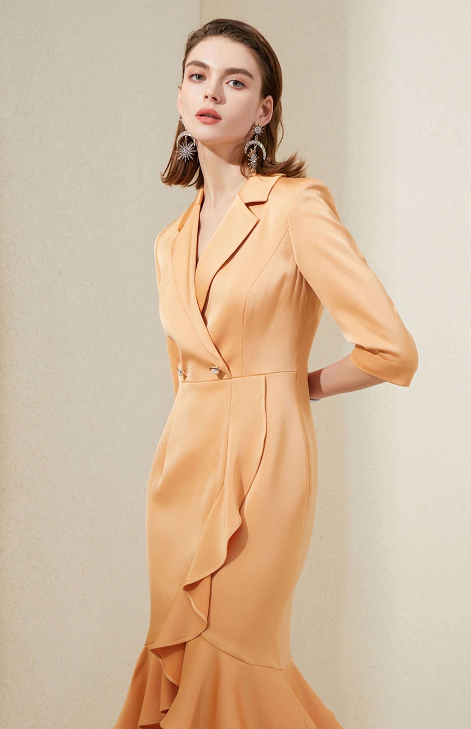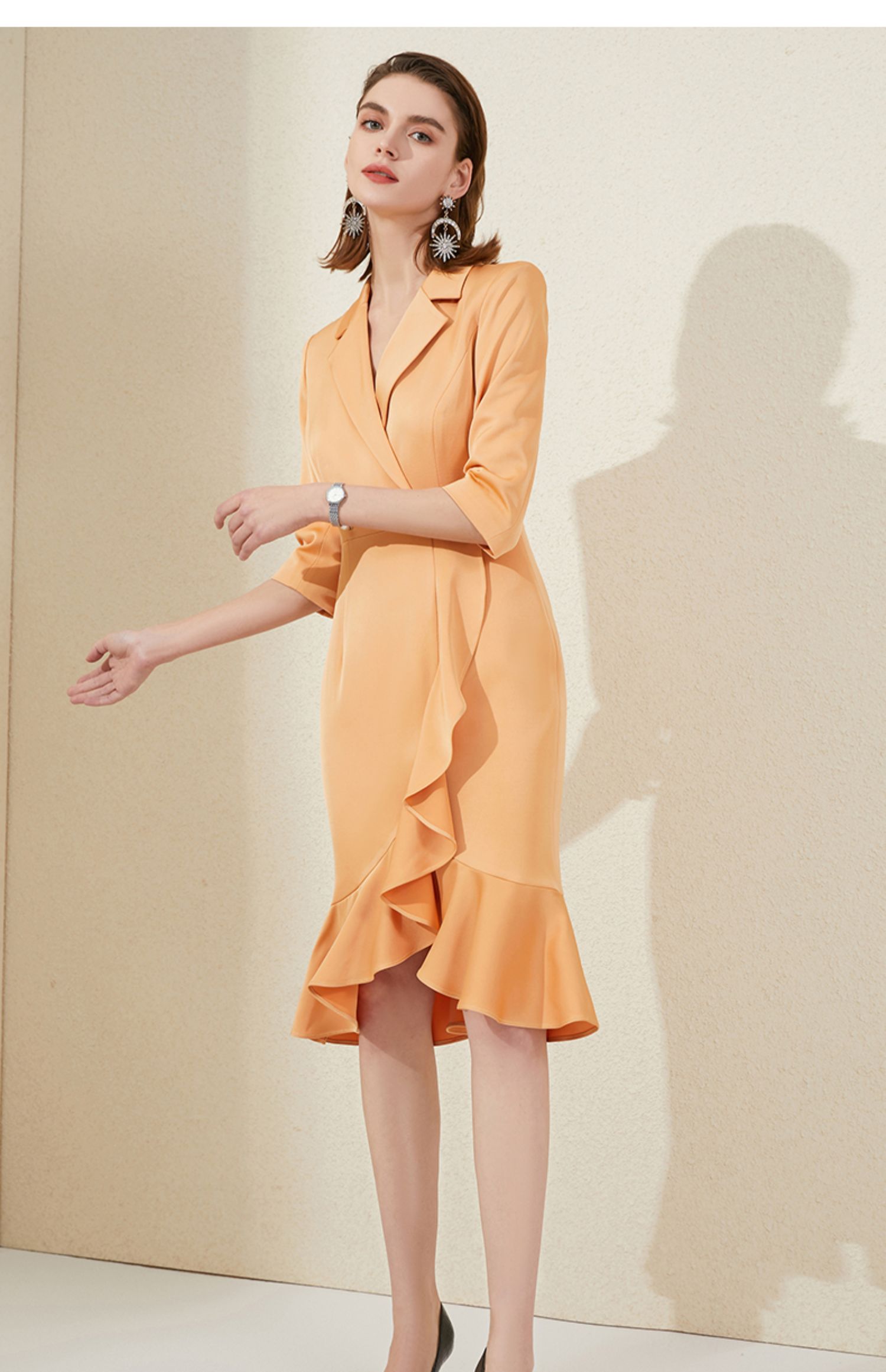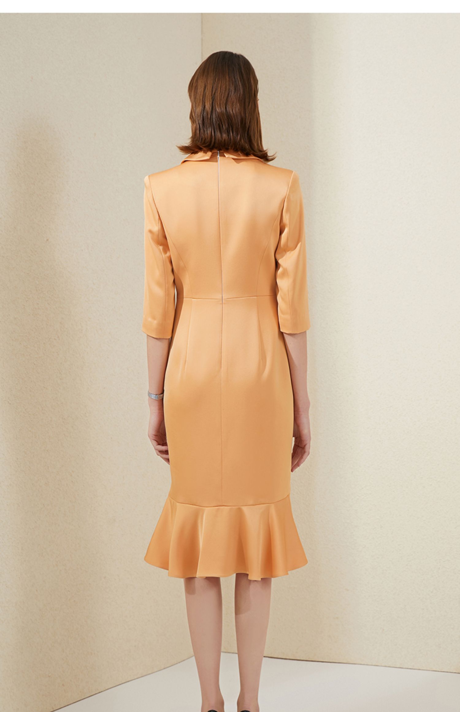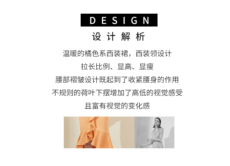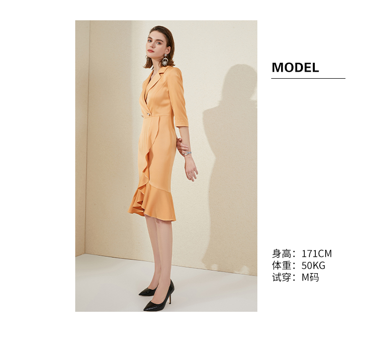IWY/橘色西装连衣裙七分袖连衣裙V领高端时尚名媛修身气质鱼尾裙 213177Q1