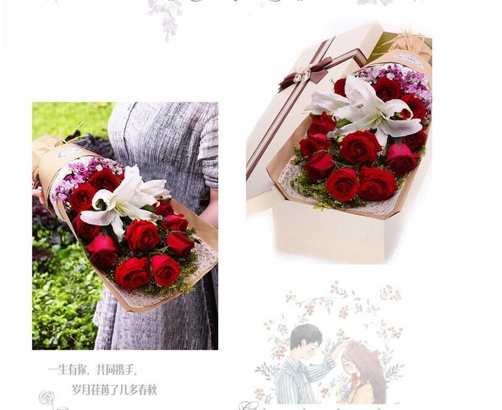 花材:11支红色玫瑰,1支白色多头香水百合,黄