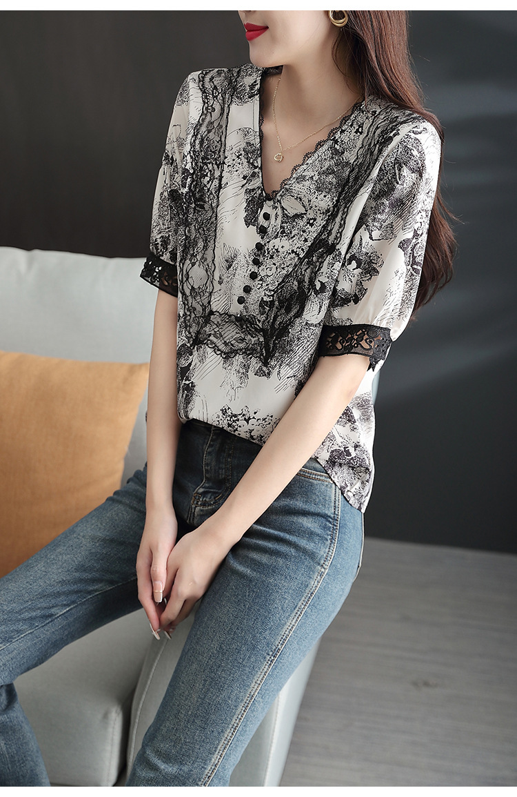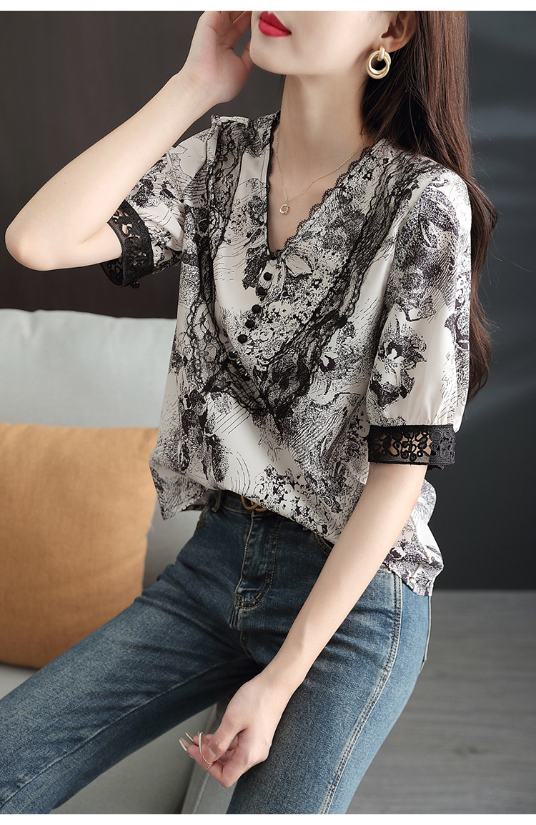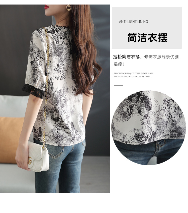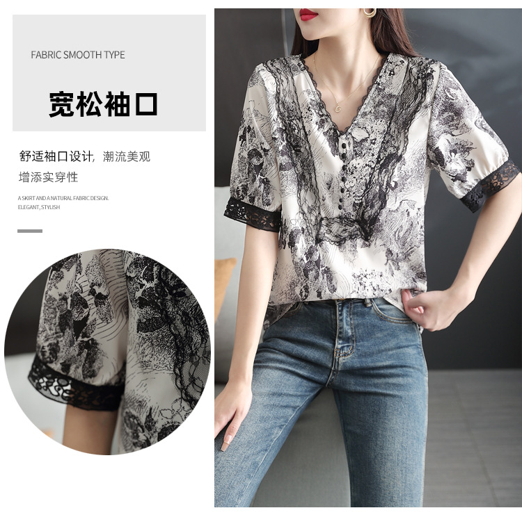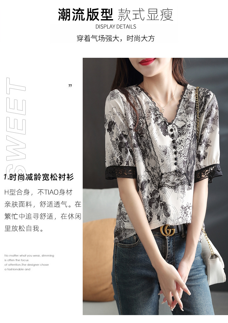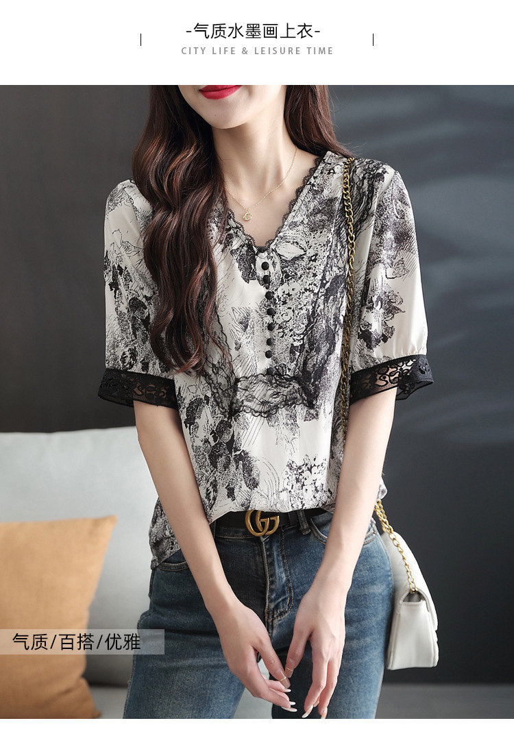 法式小众衬衫女2022新款夏季设计感水墨印花蕾丝v领别致半袖上衣 YX2082
