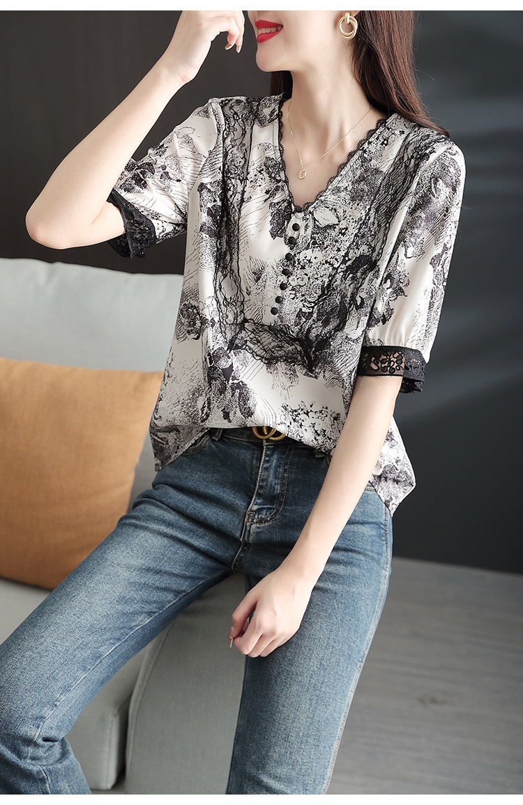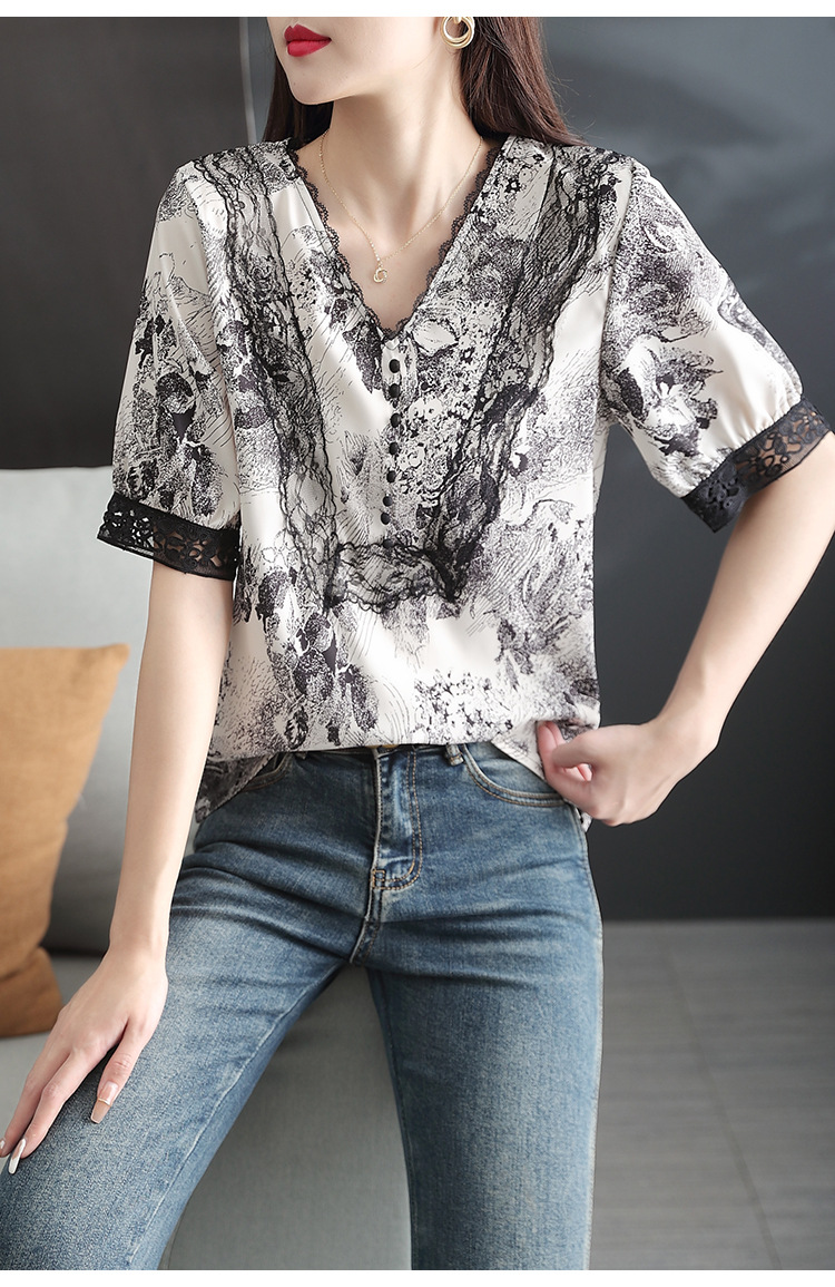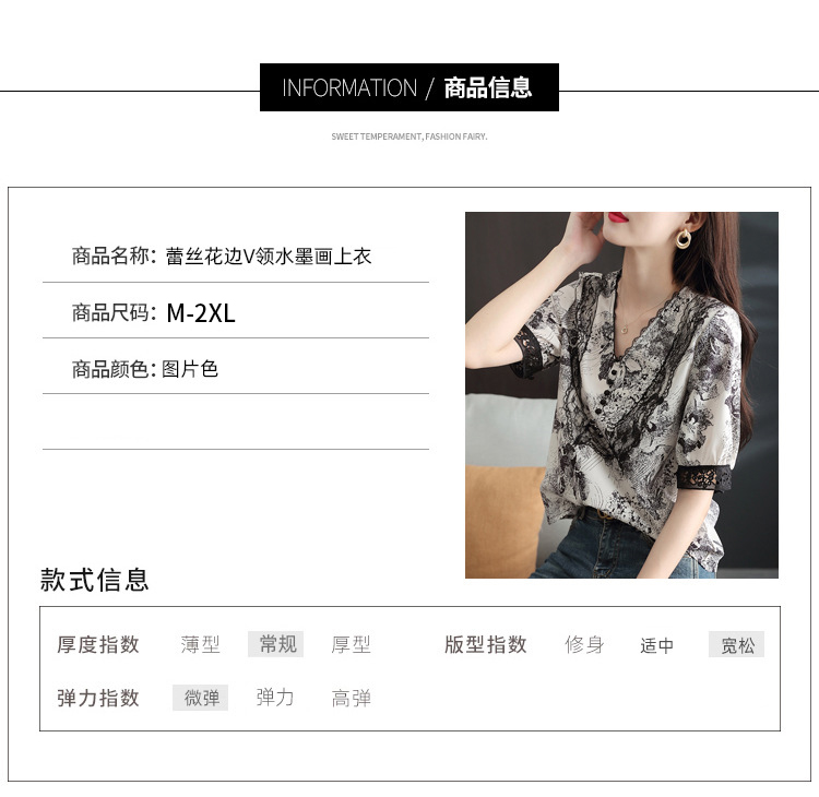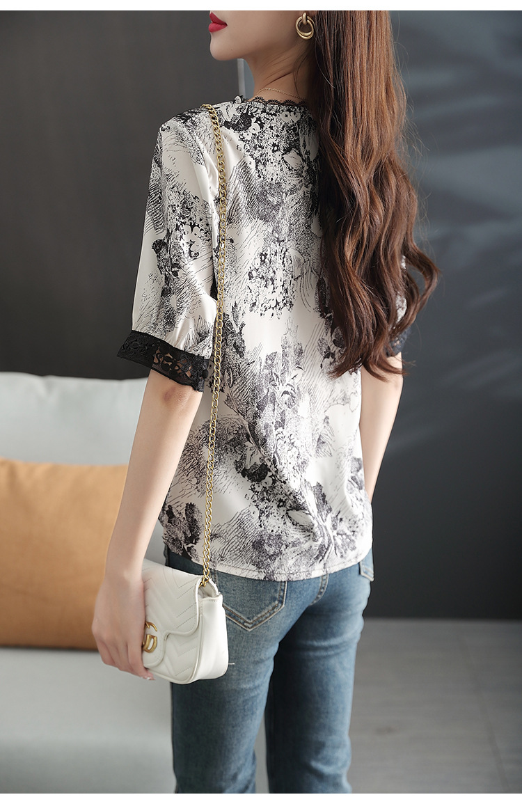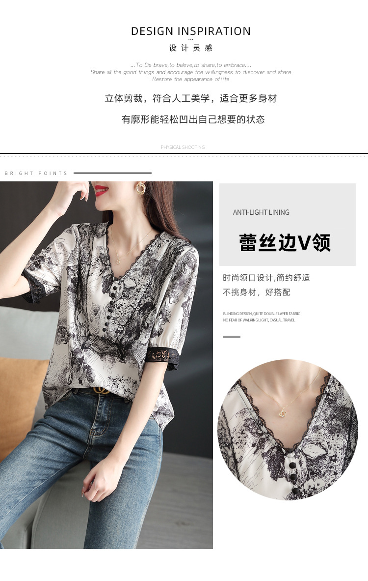 法式小众衬衫女2022新款夏季设计感水墨印花蕾丝v领别致半袖上衣 YX2082