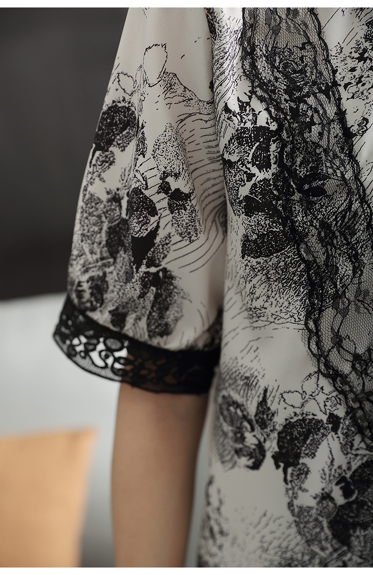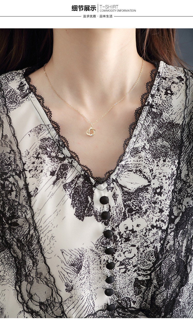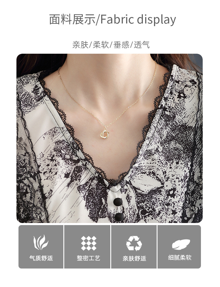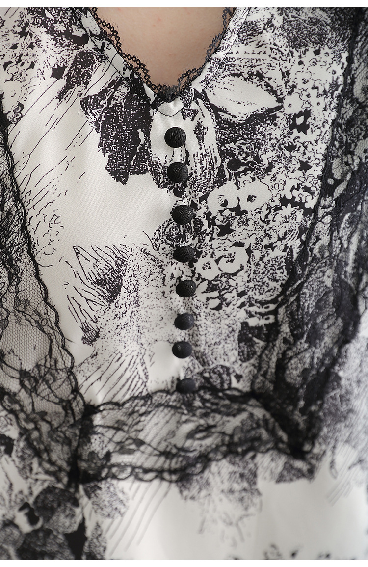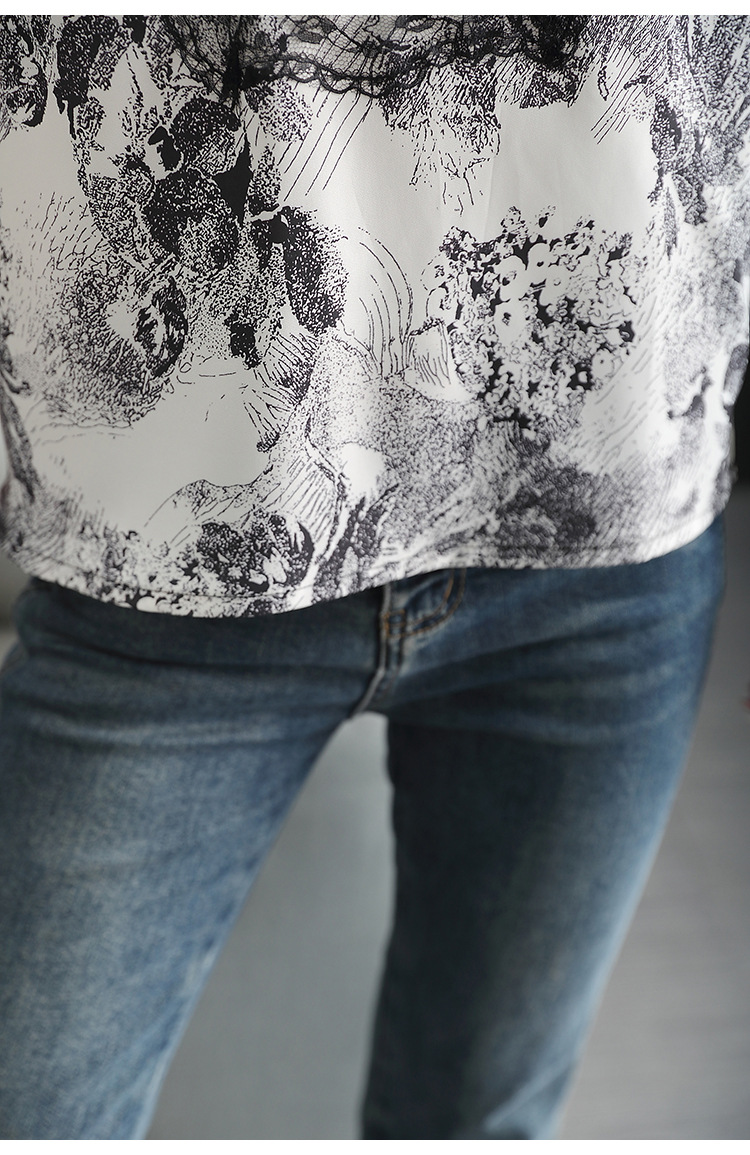 法式小众衬衫女2022新款夏季设计感水墨印花蕾丝v领别致半袖上衣 YX2082