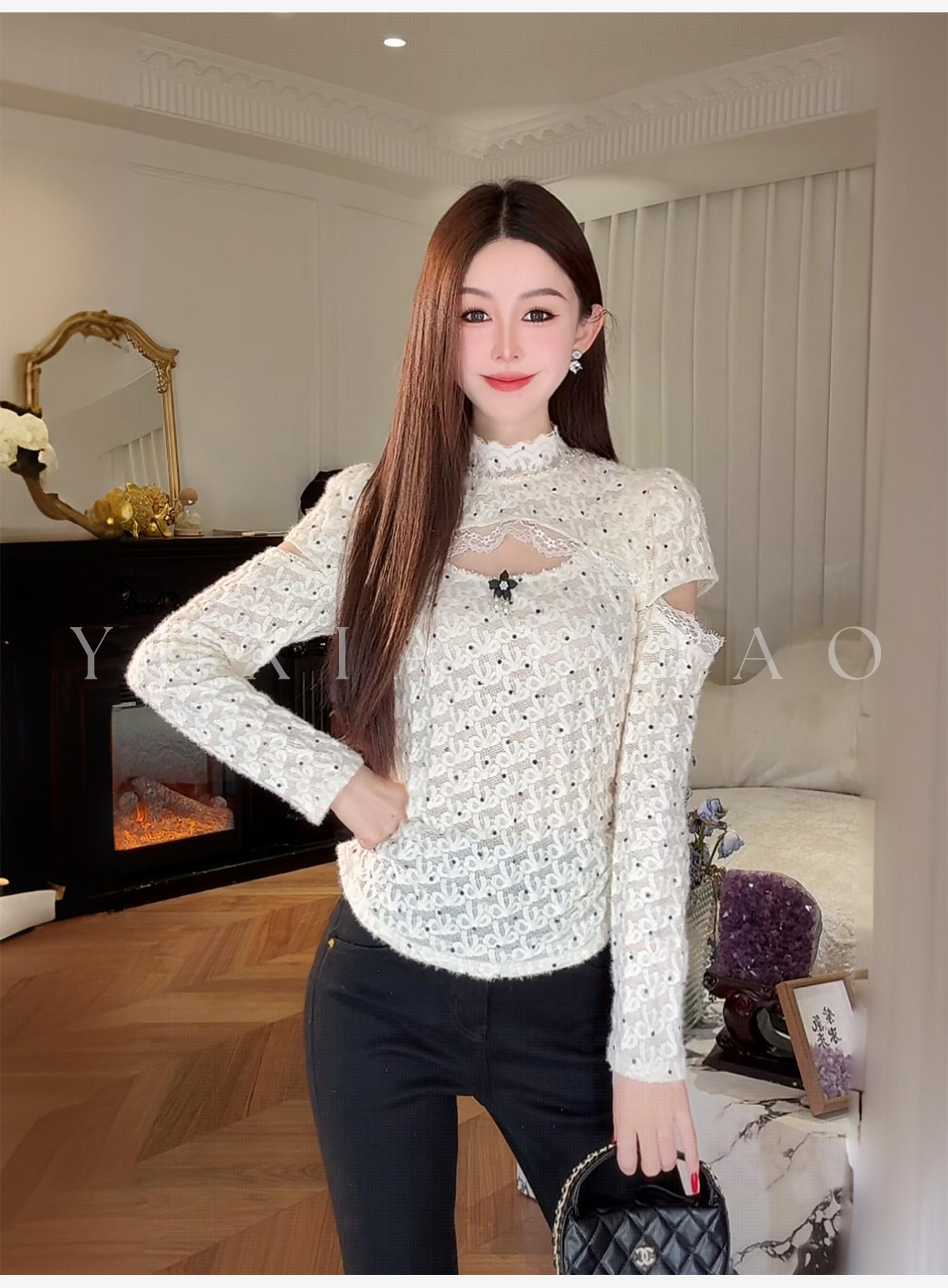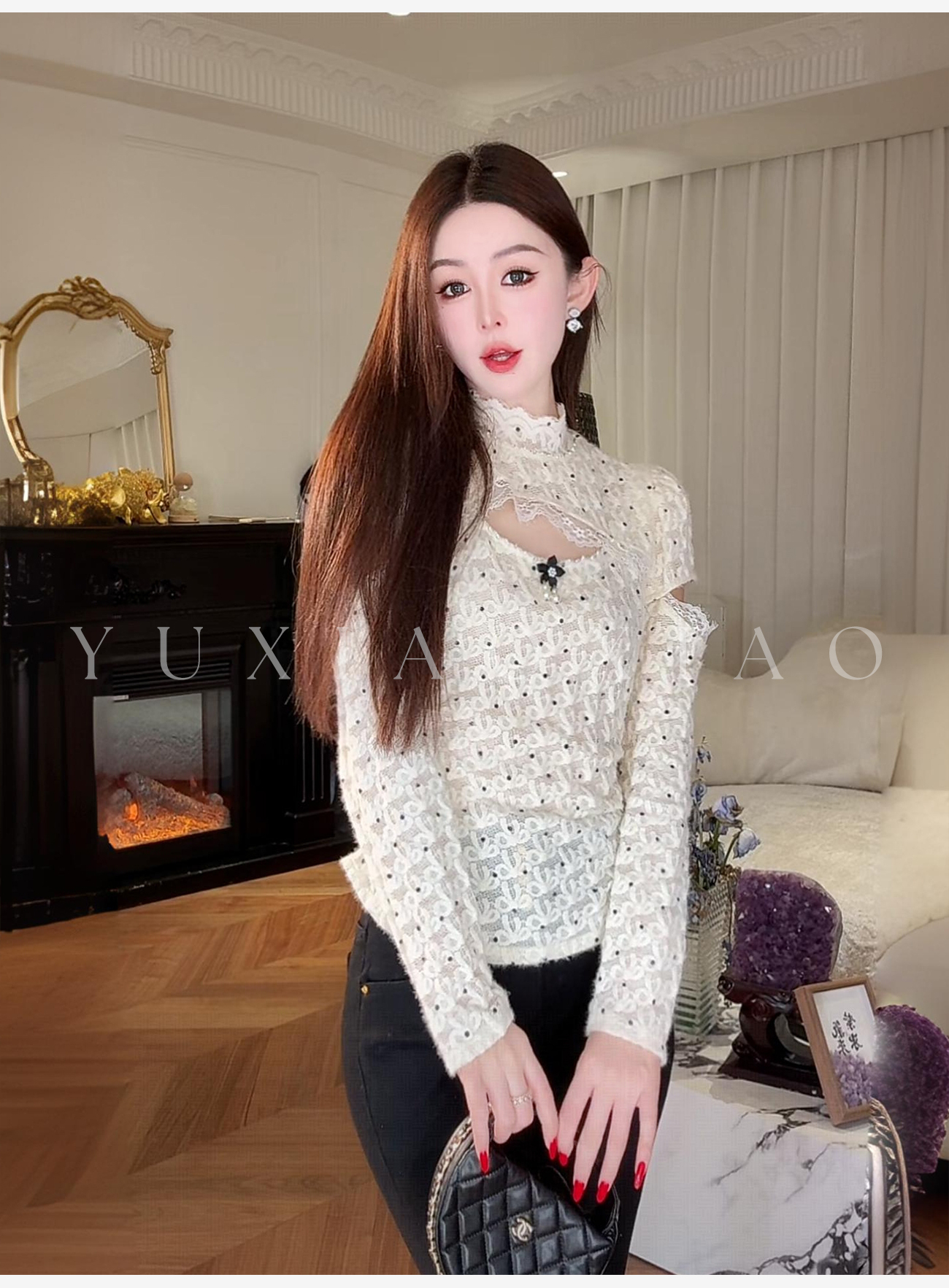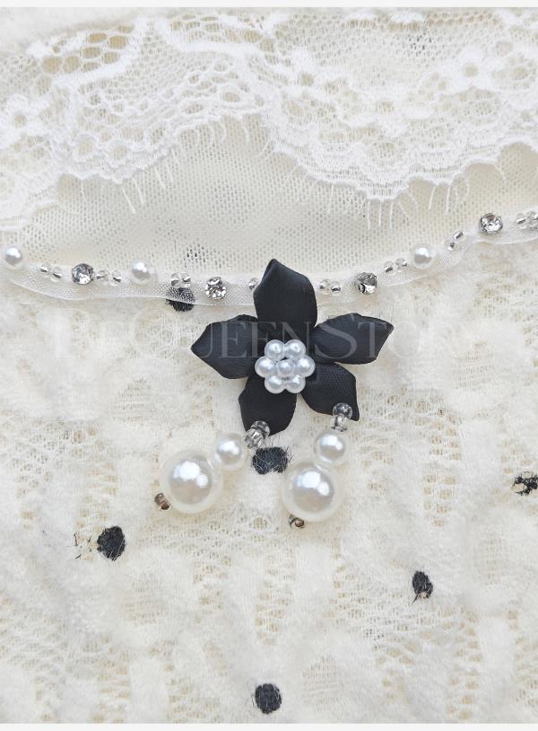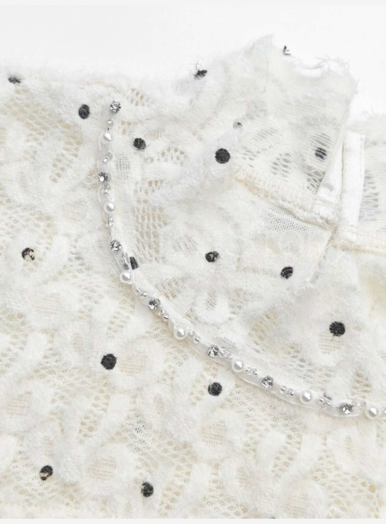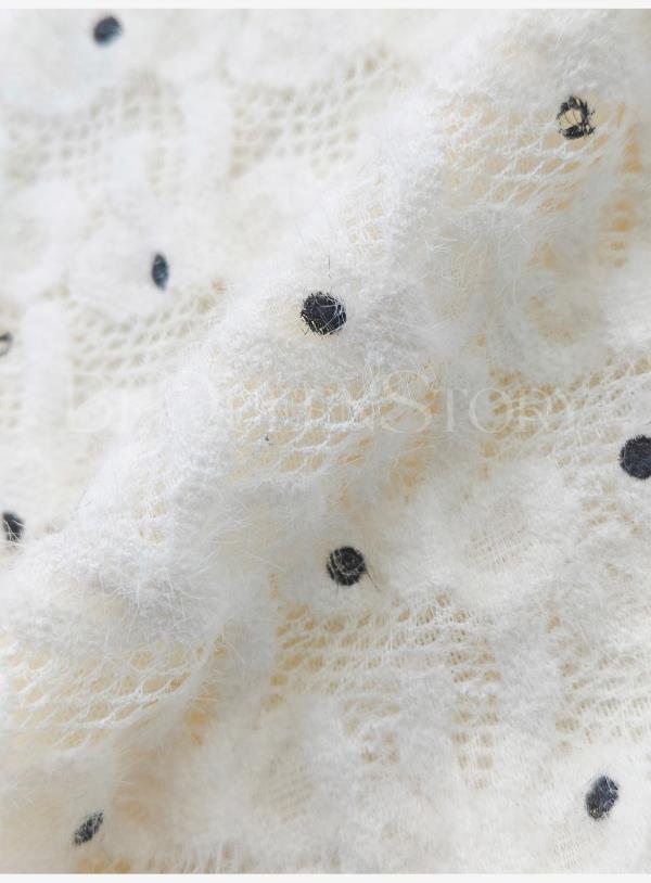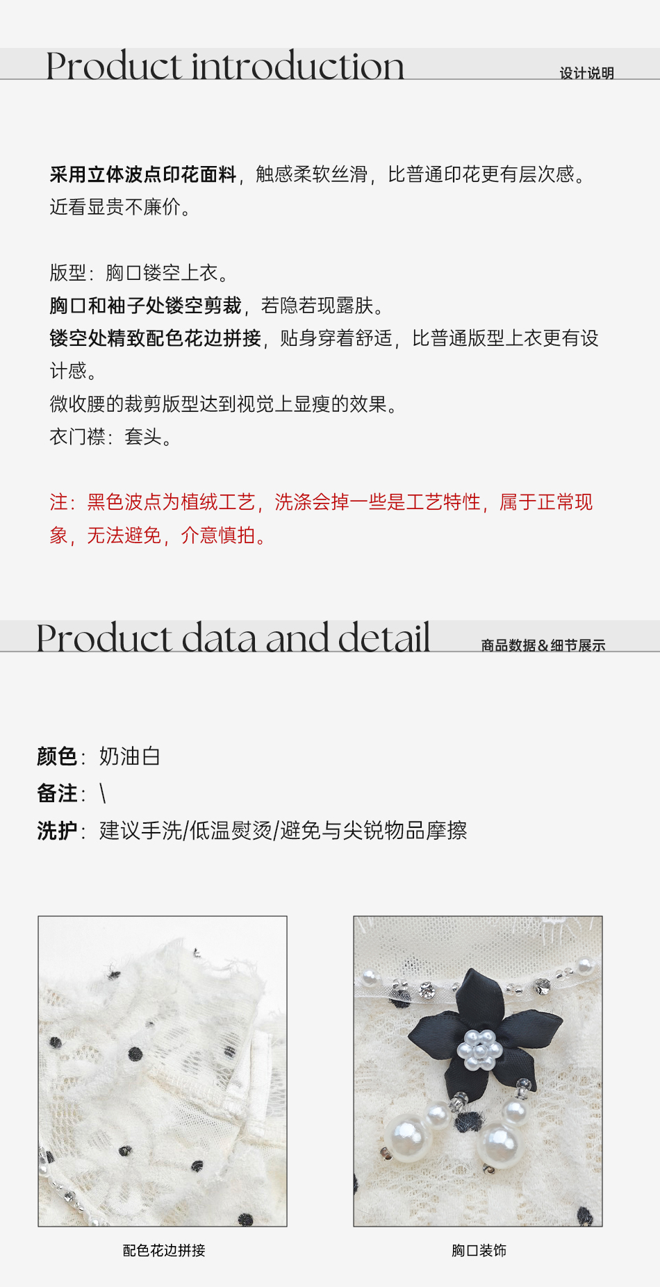 余潇潇【玛德琳茶会】设计感立体波点印花胸口花边镂空弹力显瘦上衣