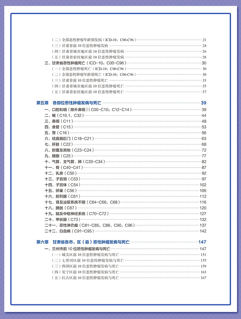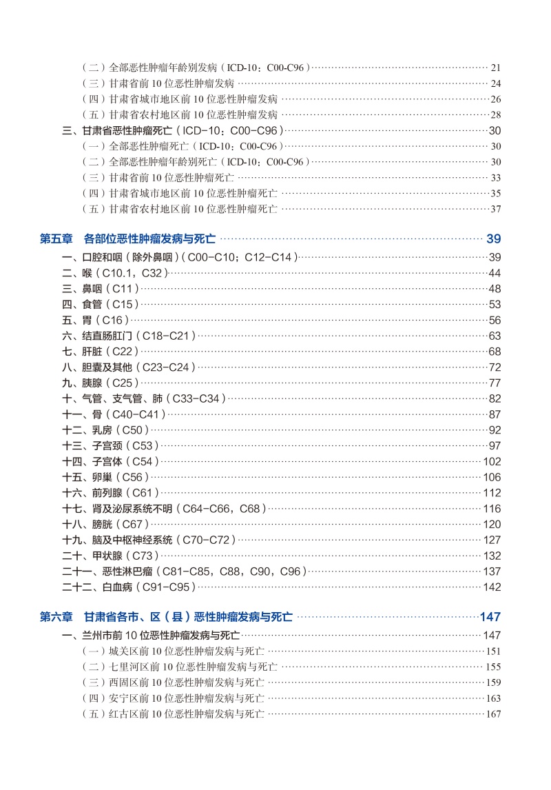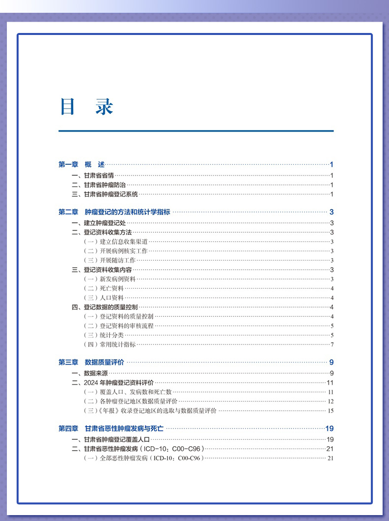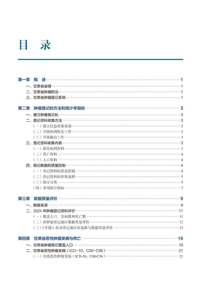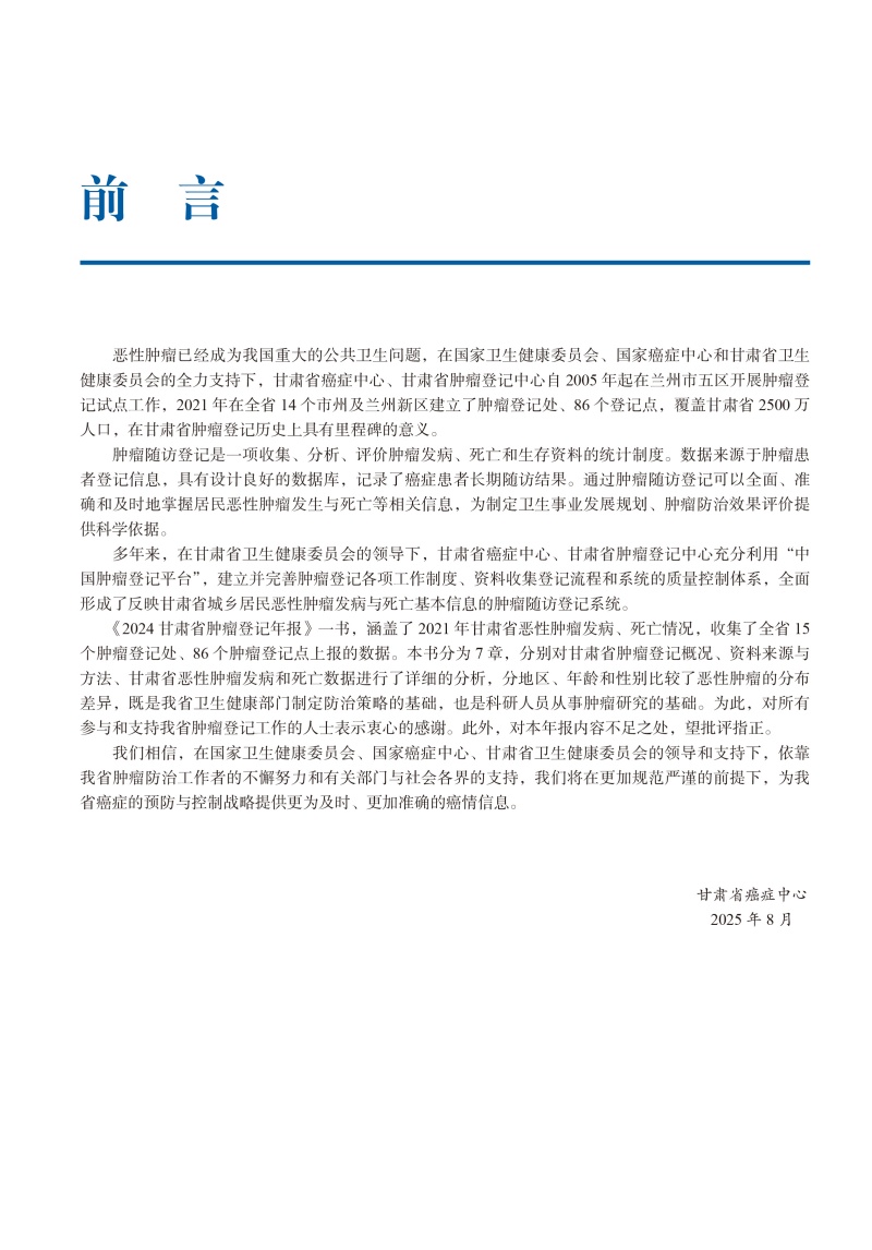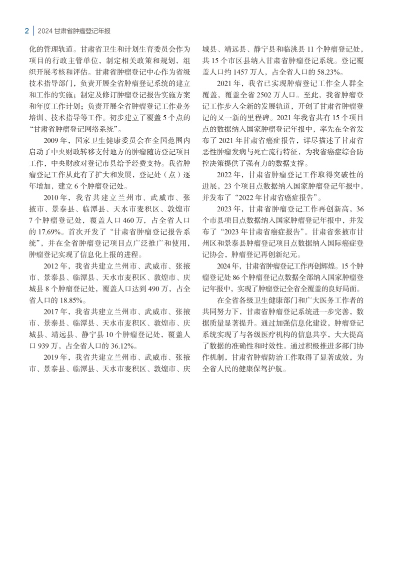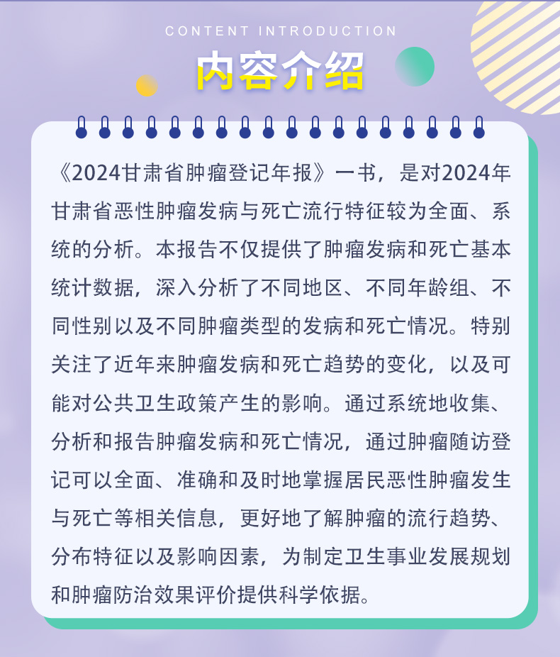《2024甘肃省肿瘤登记年报》一书,是对2024年甘肃省恶性肿瘤发病与死亡流行特征较为全面、系统的分析。本报告不仅提供了肿瘤发病和死亡基本统计数据,深入分析了不同地区、不同年龄组、不同性别以及不同肿瘤类型的发病和死亡情况。特别关注了近年来肿瘤发病和死亡趋势的变化,以及可能对公共卫生政策产生的影响。通过系统地收集、分析和报告肿瘤发病和死亡情况,通过肿瘤随访登记可以全面、准确和及时地掌握居民恶性肿瘤发生与死亡等相关信息,更好地了解肿瘤的流行趋势、分布特征以及影响因素,为制定卫生事业发展规划和肿瘤防治效果评价提供科学依据。