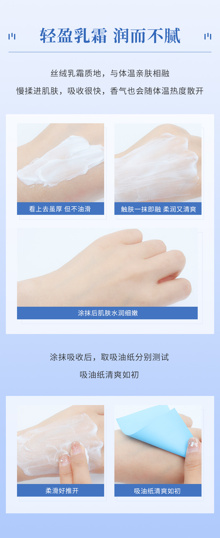 吸收快、 保湿滋润、 清爽不油腻、