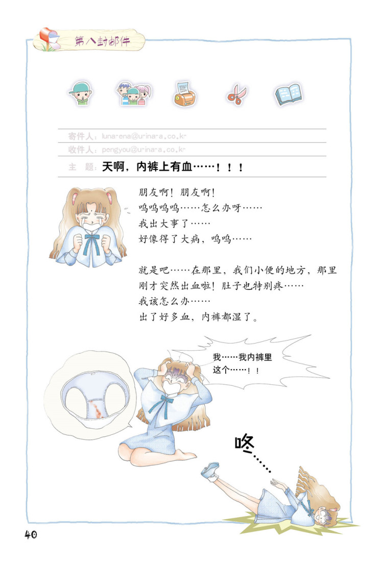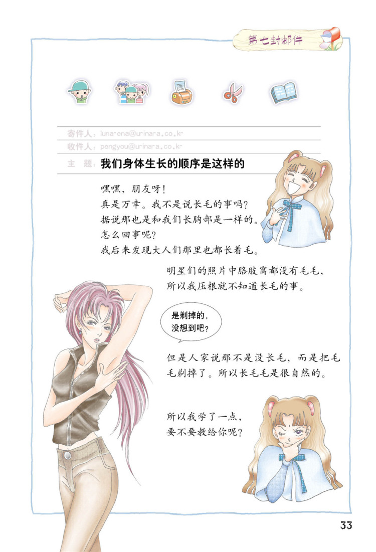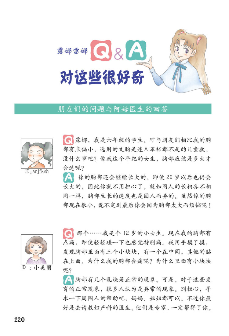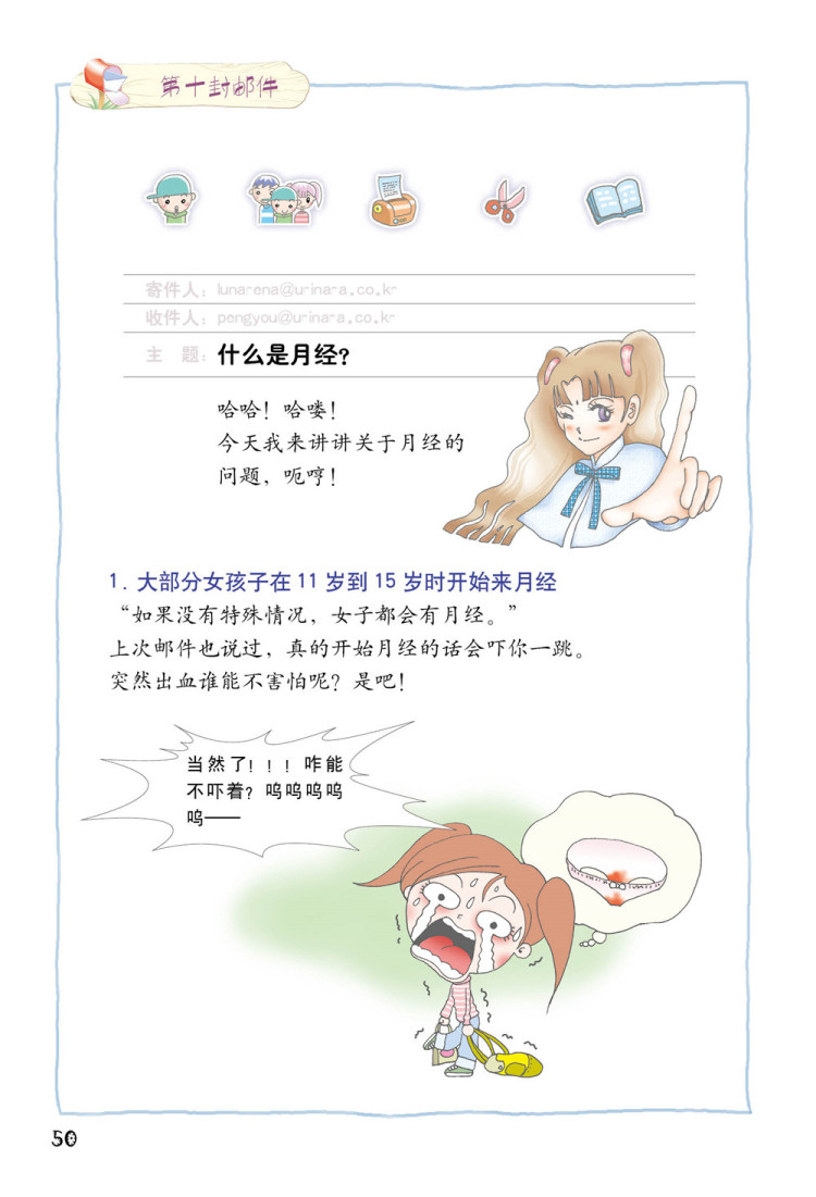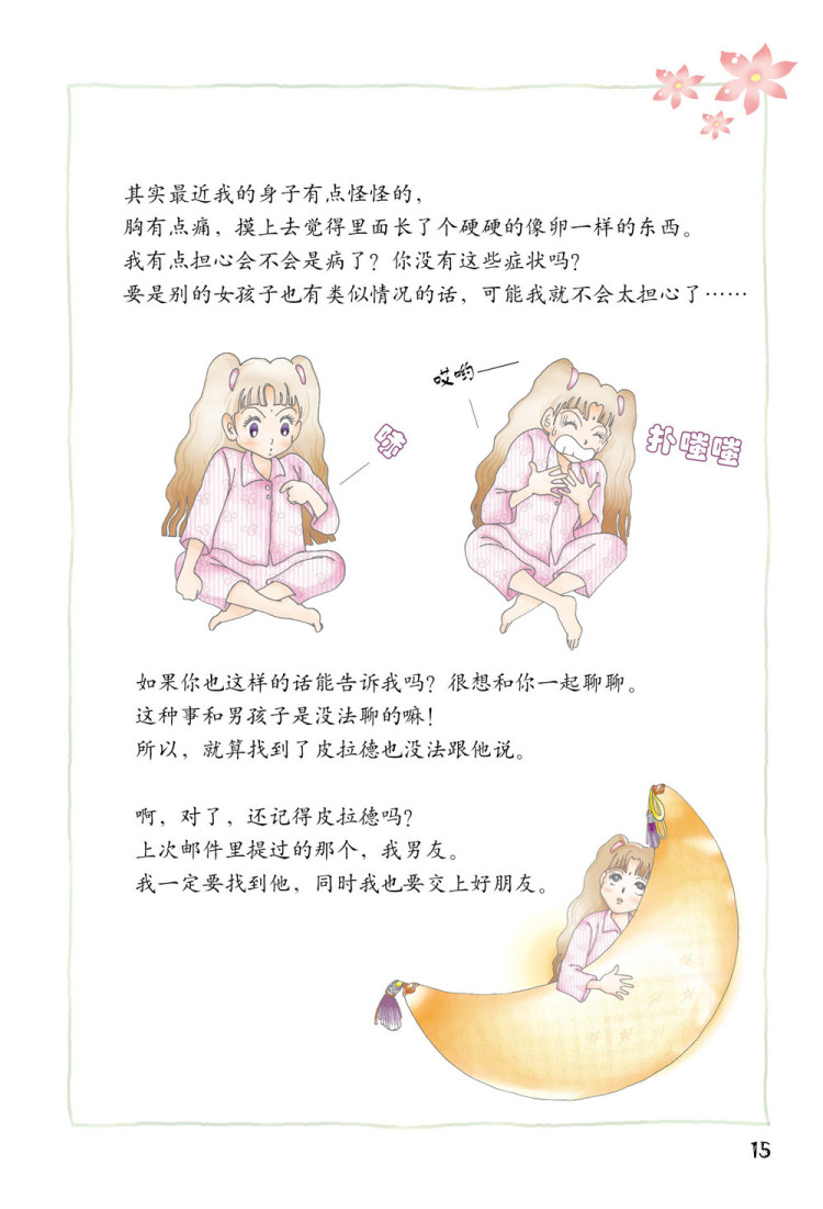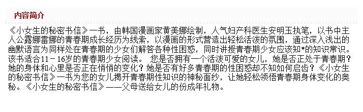 目录 封邮件 给我未知而想念的朋友 10 第二封邮件 需要可以聊天的朋友 13 第三封邮件 胸部长起了花苞 17 第四封邮件 胸部为什么会变大?21 第五封邮件 不穿文胸也可以,如果穿就选择运动型文胸 27 第六封邮件 哇呀呀,毛毛……!!! 30 第七封邮件我们身体生长的顺序是这样的 33 第八封邮件天啊,内裤上有血……!!!40 第九封邮件月经开始啦!42 第十封邮件什么是月经?50 1. 大部分女孩子在11 岁到15 岁时开始来月经 50 2. 初潮 52 3. 月经周期 53 4. 我们肚子里有这些东西 55 5. 排卵 58 6. 和的会合 60 7. 让宝宝的房子更结实、更有营养 61 8. 月经 62 9. 排卵期 65 10. **口要清洁干净 67 11. 偶尔看看那里 68 12. 各部分的名称 69 13. 坐浴 70 14. 擦拭那里时要从前向后!!!71 露娜雷娜的视频邮件 不可以直接坐在公共卫生间的坐便器上75 第十一封邮件 卫生巾选什么样的好呢?79 1. 卫生巾的种类 80 2. 用过的卫生巾要这样处理 82 第十二封邮件 我男友搬到隔壁啦! 88 第十三封邮件 在没有卫生巾的时代怎么办 89 第十四封邮件卫生巾的发明 91 第十五封邮件 月经量多时要这样! 94 第十六封邮件 经期要注意这些 96 露娜雷娜的视频邮件 经血会带有一点点腥味 98 第十七封邮件 护垫 111 第十八封邮件 内裤上有黄色的东西 114 第十九封邮件 白带 115 第二十封邮件肚子好痛啊,朋友 124 第二十一封邮件 痛经 125 露娜雷娜的视频邮件 痛经 126 第二十二封邮件 害怕检查 140 第二十三封邮件 妇科体验记 141 露娜的妇科医院体验记 142 第二十四封邮件 检查结果出来了 149 第二十五封邮件 月经前也痛噢! 156 第二十六封邮件 你月经前也痛啊! 157 第二十七封邮件 经前期综合征 158 第二十八封邮件 优雅携带卫生巾 160 第二十九封邮件 月经结束时变成褐色是自然现象 163 第三十封邮件 男孩子们取笑我!! 165 第三十一封邮件 可恶死了,那家伙…… 169 第三十二封邮件 妈妈说…… 170 第三十三封邮件我们真的很想知*的关于男人和女人的故事 171 露娜雷娜的视频邮件 真的很想知*的故事 177 第三十四封邮件 要不要给其他朋友们发邮件?180 第三十五封邮件 从别的朋友那里来了很多邮件 214 第三十六封邮件我的名字是月 217 露娜雷娜Q&A 对这些很好奇 朋友们的问题和阿姆医生的回答 220 |