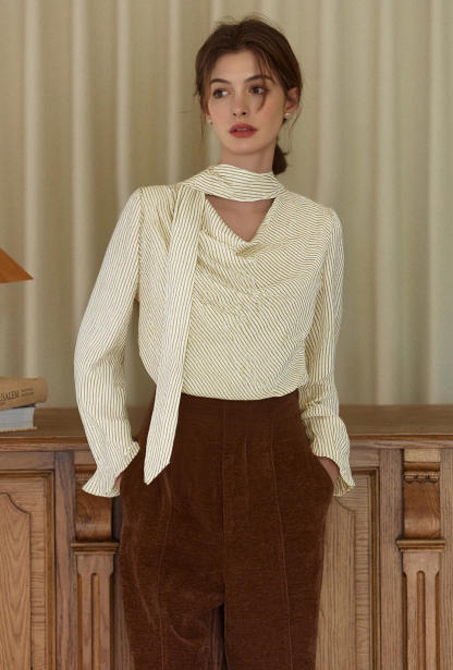 欧芮儿2026春新款条纹衬衣女优雅围脖通勤雪纺长袖衬衫