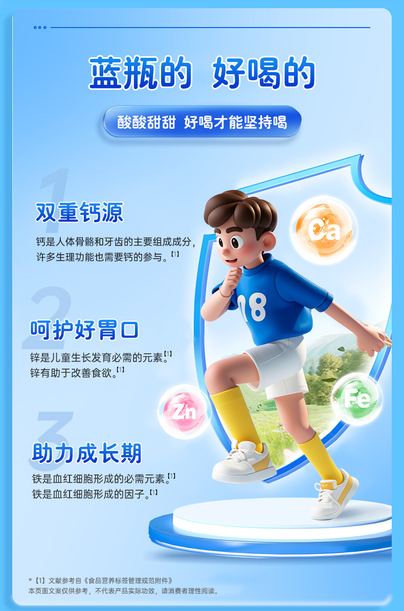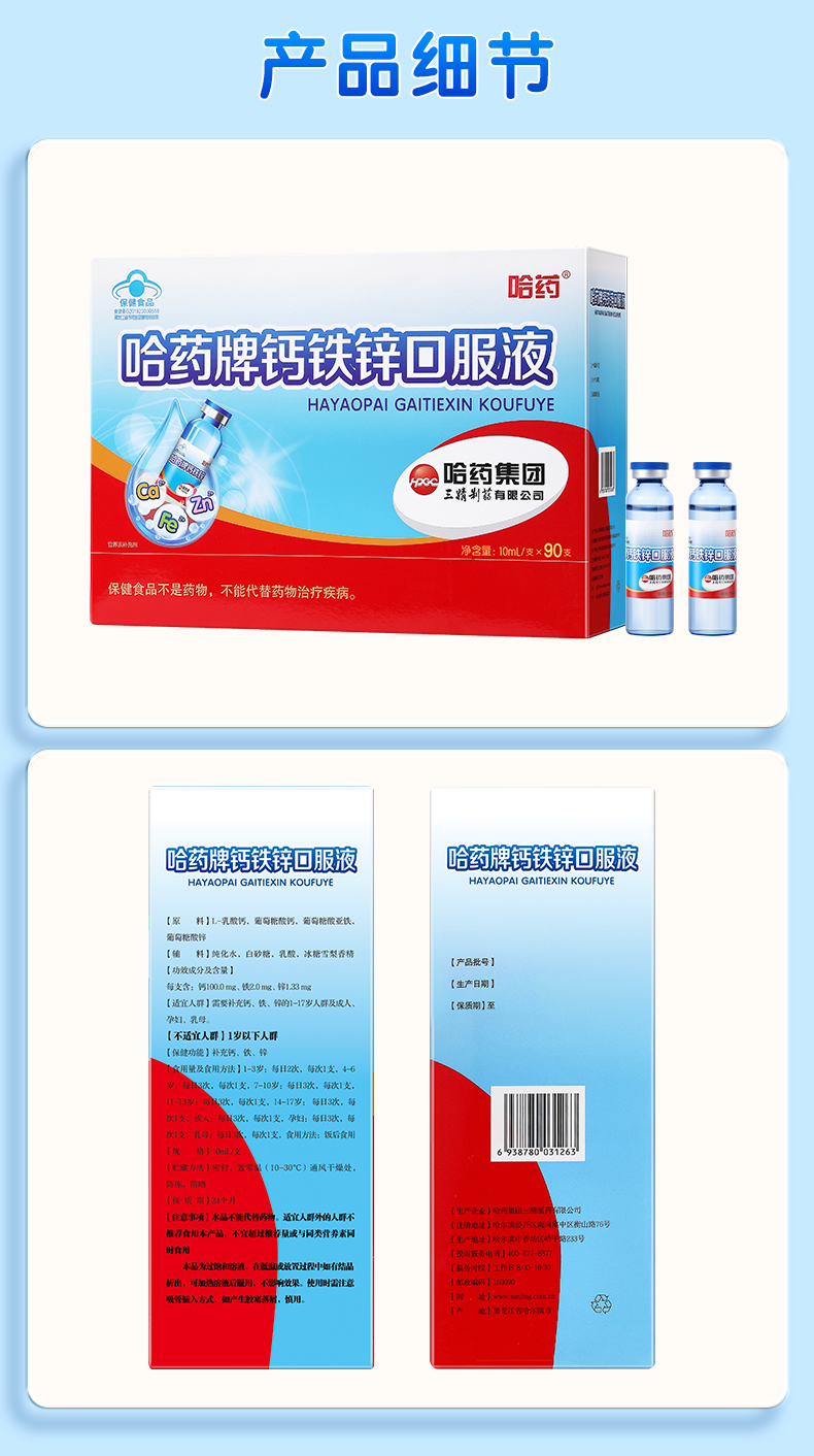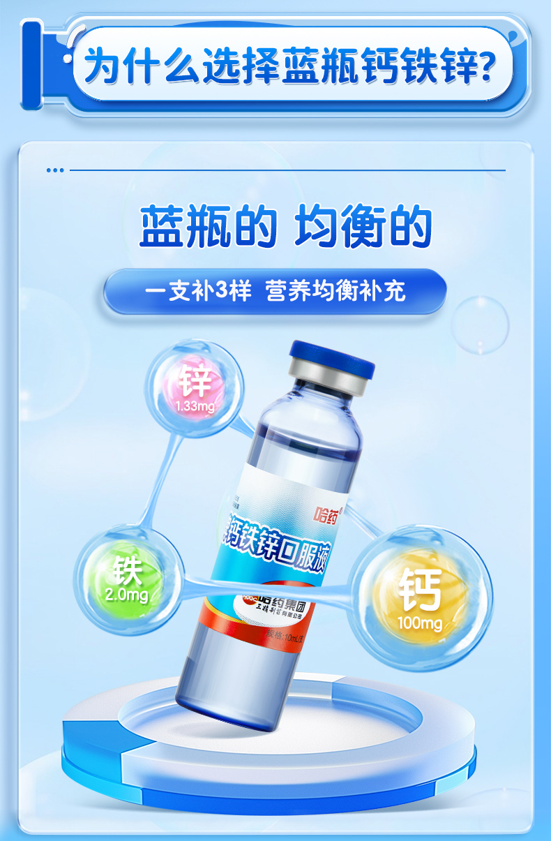 每支口服液含有钙100mg、铁2.0mg、锌1.33mg,科学配比满足宝宝成长所需。钙助力骨骼发育,铁支持血液健康,锌改善食欲,一支搞定三种营养!