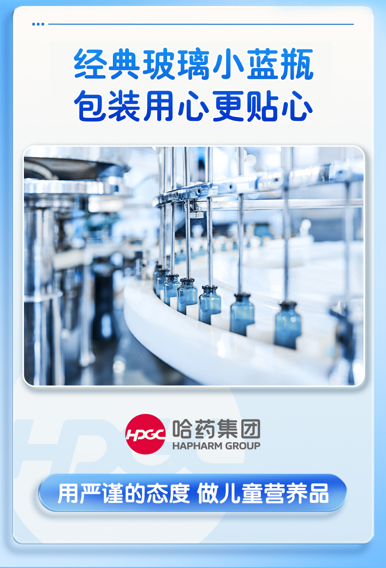 经典的蓝色玻璃瓶包装,每一支都独立密封。产品经过严格质量把控,还获得了国家的“蓝帽子”认证,给宝宝喝特别安心。