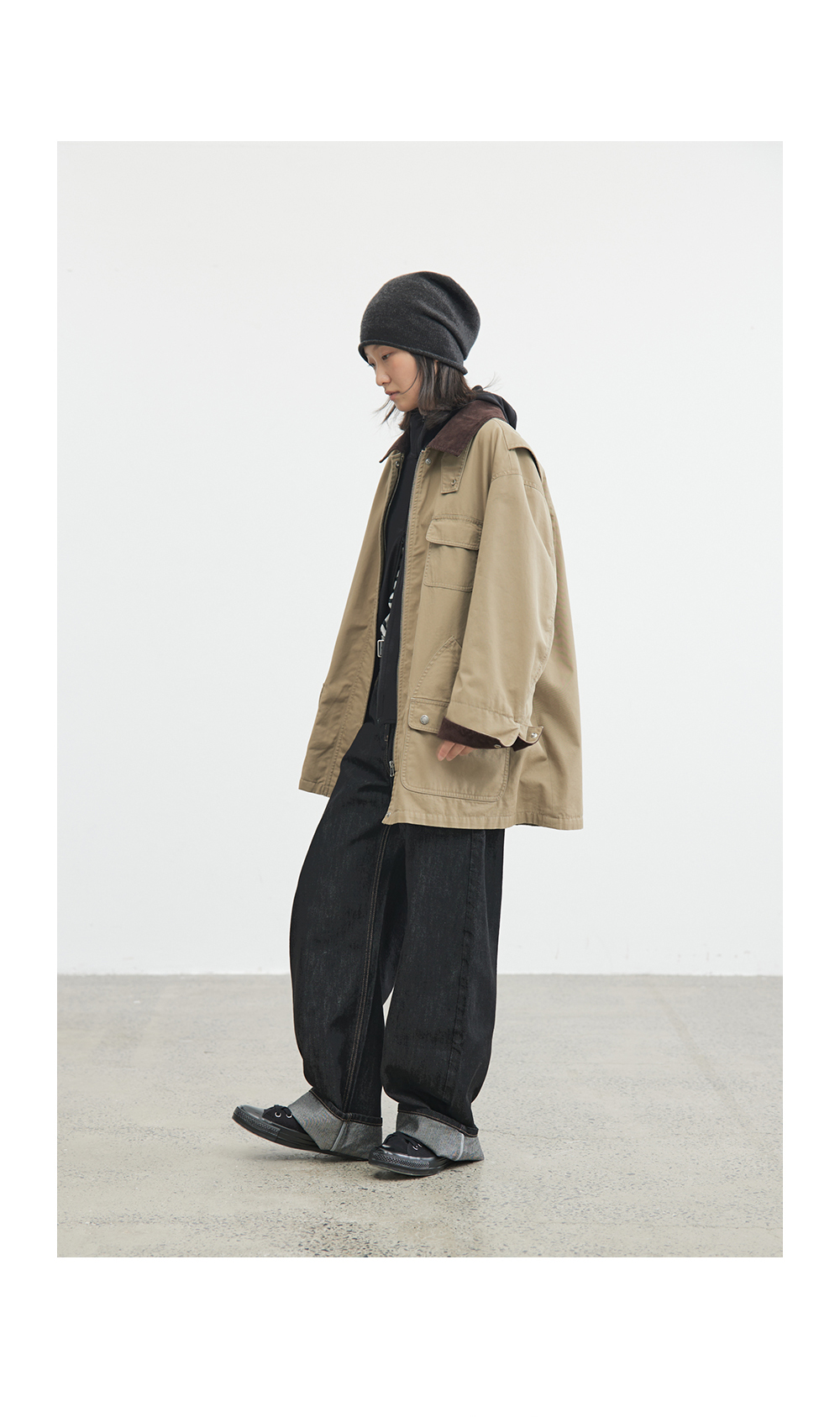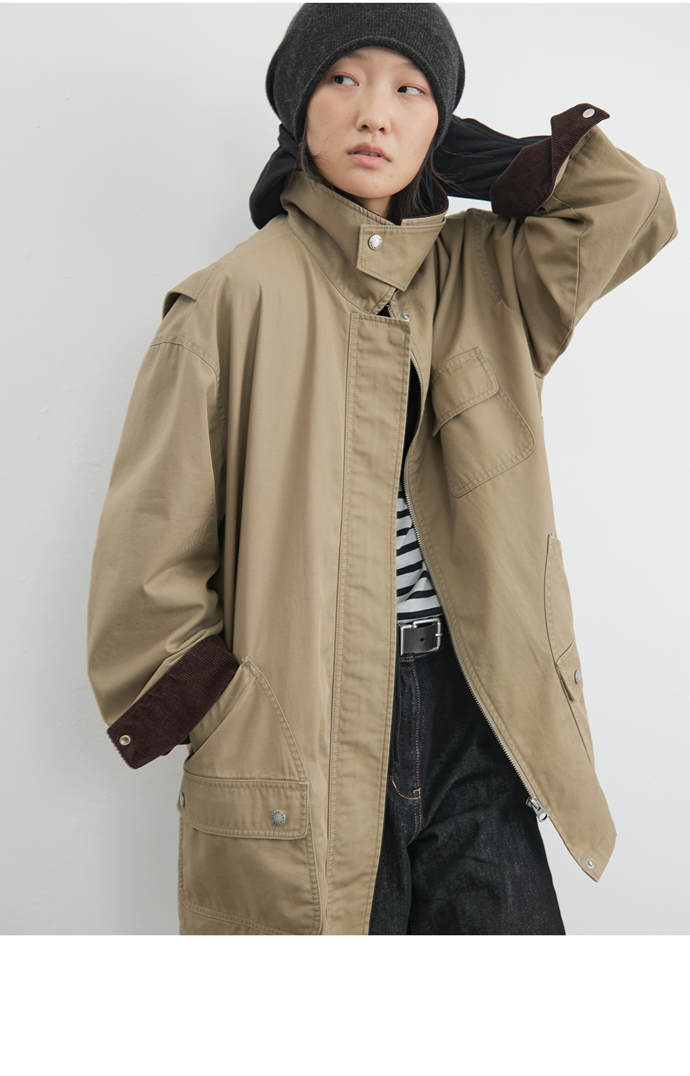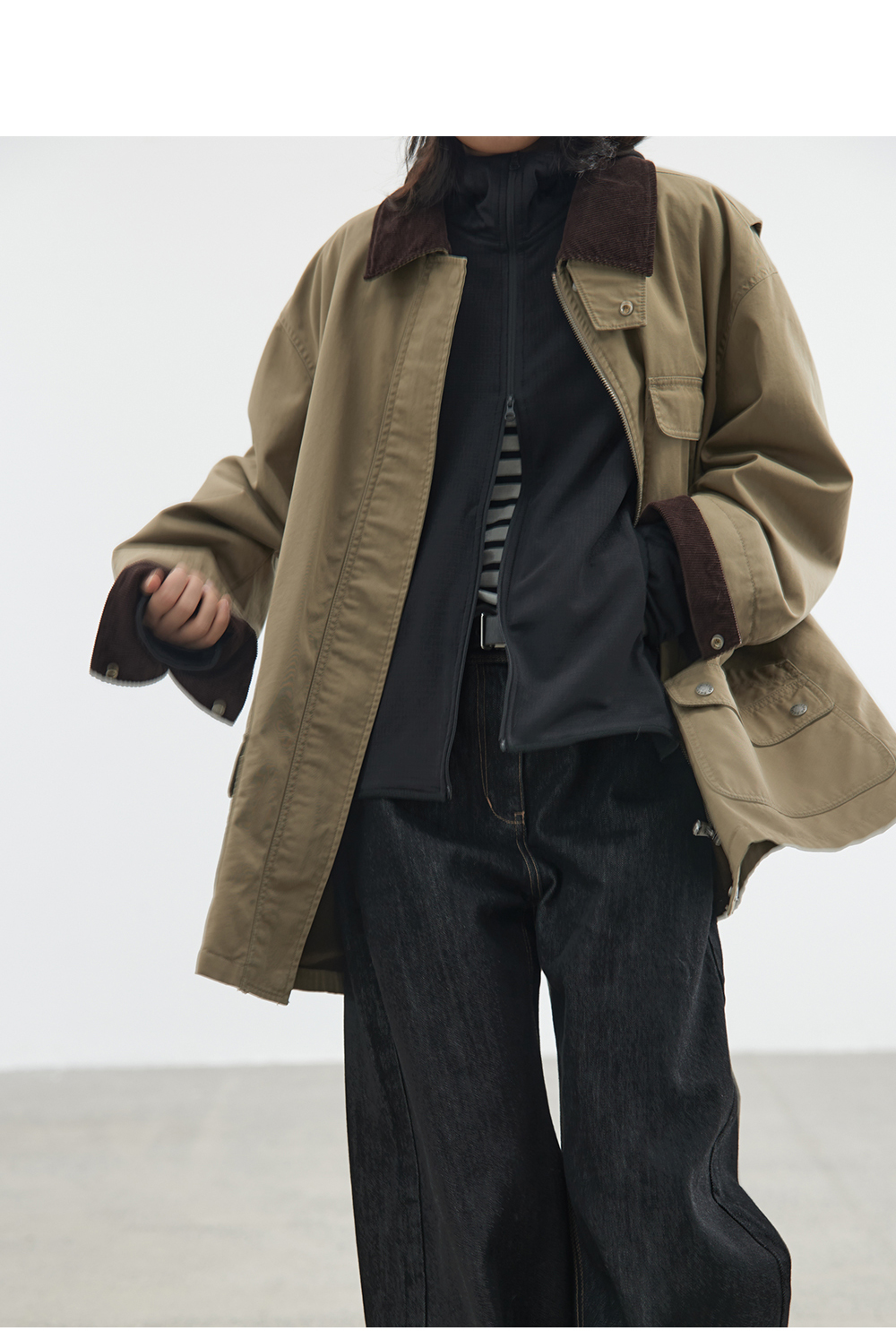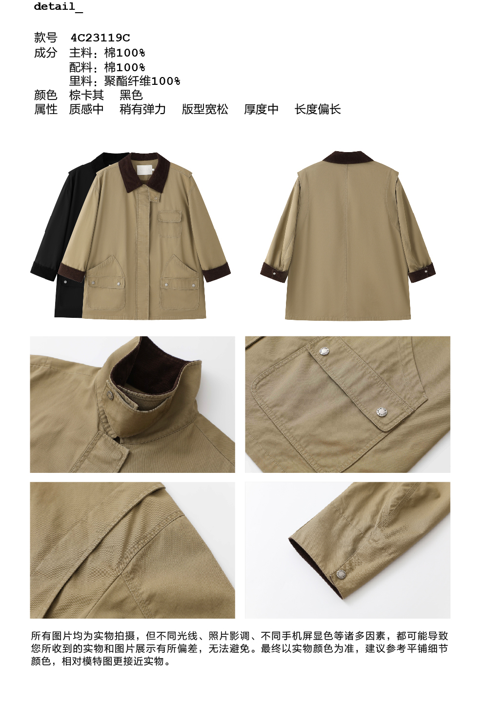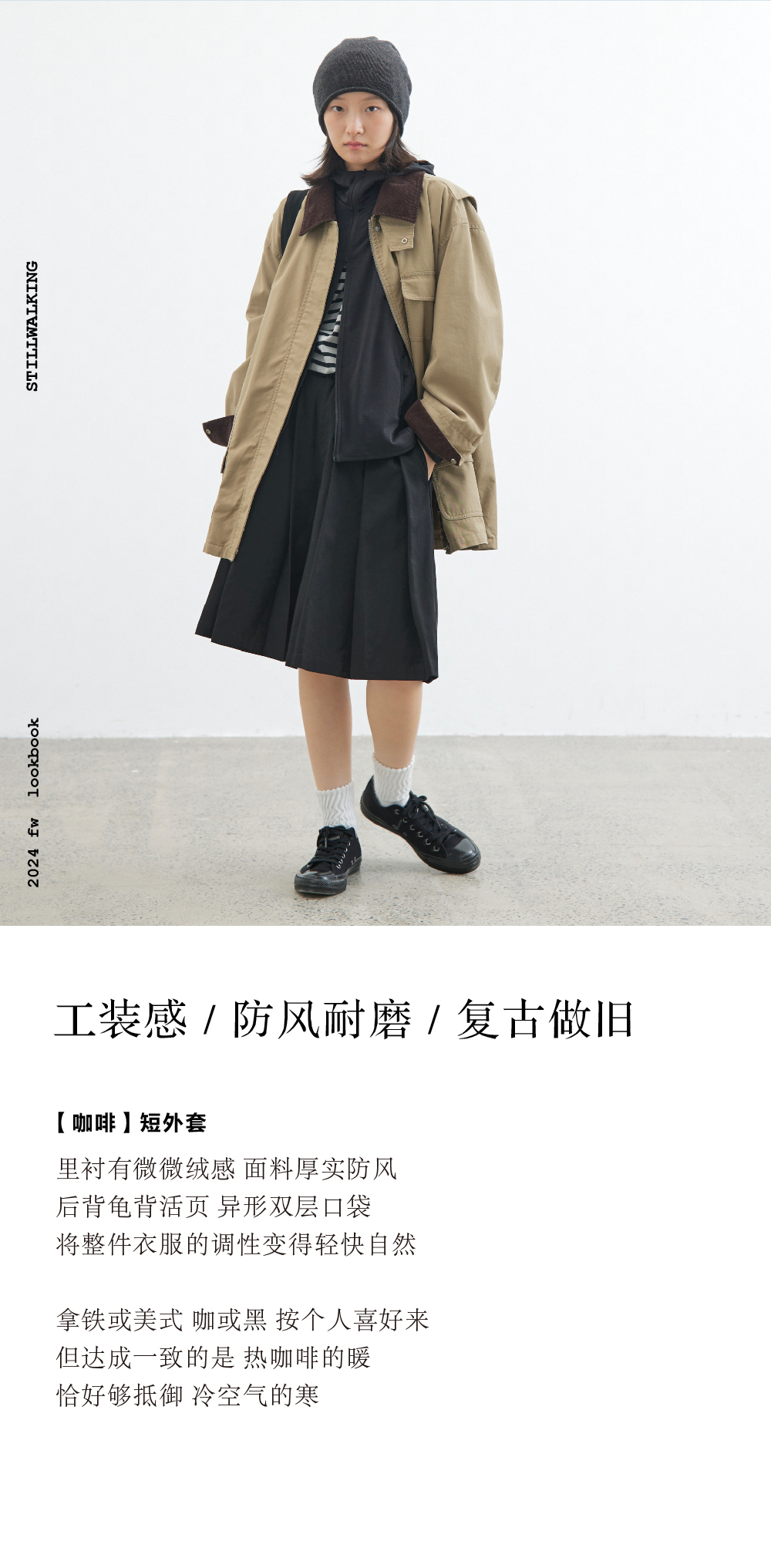 步履不停/4C23119C/复古翻领工装感棕色黑色纯棉风衣外套