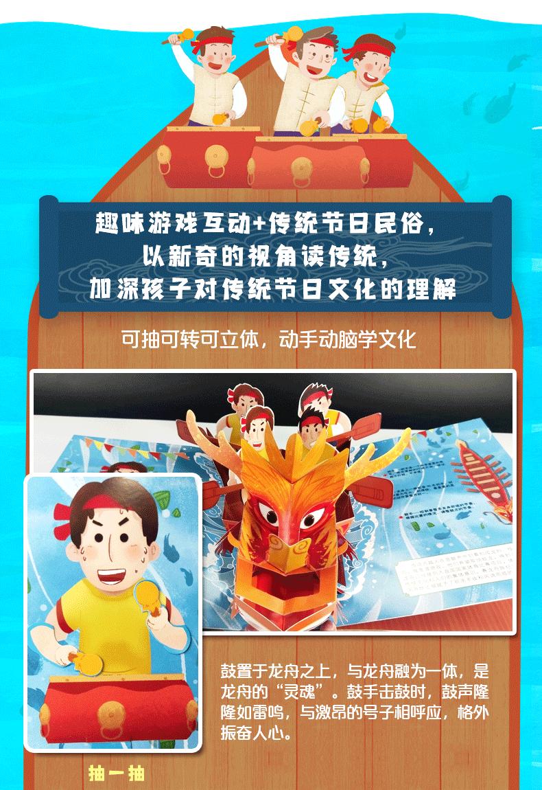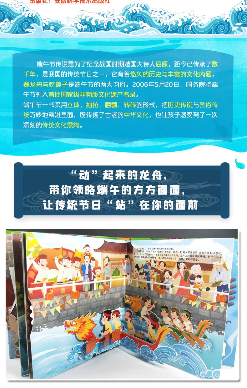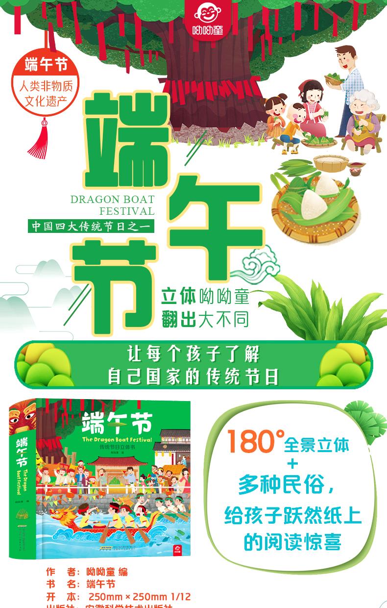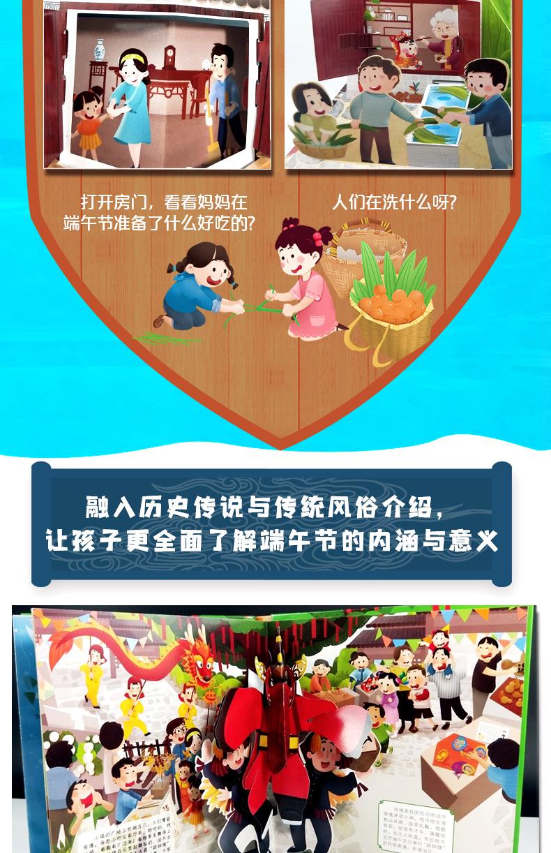 “五月五,是端阳;门插艾,香满堂。”端午节——中国四大传统节日之一,也是中国少有入选世界非物质文化遗产的节日,不仅承载着我国两千多年的文化传统,还寄托着人们怀古思今的历史情怀。《端午节》立体书采用三维立体的形式,将古老的传统与历史跃然纸上,让孩子从“玩中学、学中玩”,如身临其境般感受中国传统节日的魅力。