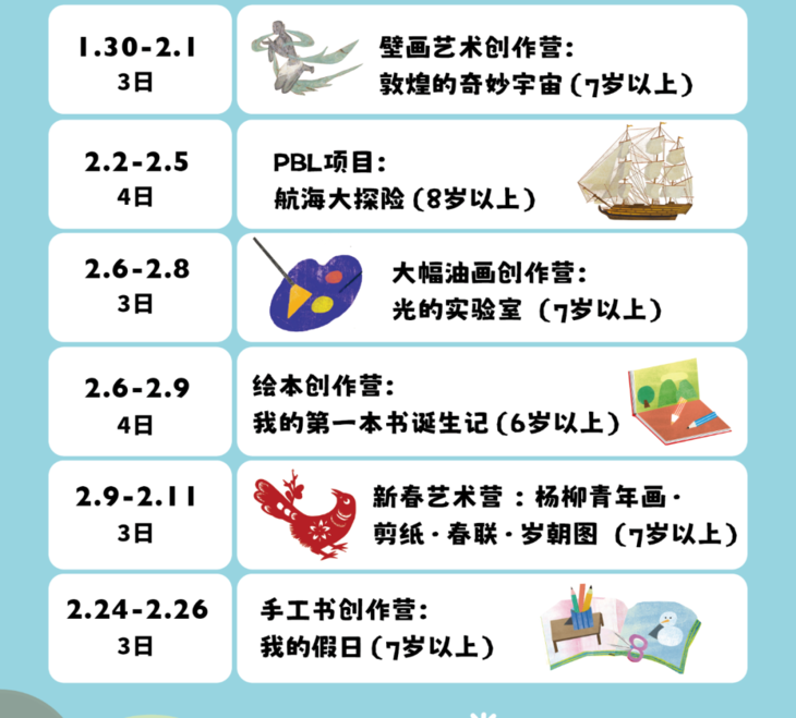 他们可以登上时光探险船,穿越波澜壮阔的“大航海时代”,也可以沉浸于敦煌艺术和古建筑之美,可以亲手创作人生第一本绘本;用艺术装点浓浓年味儿;也可以化身小小博物学家,在自然、天文与地质的奥秘中触摸真实的世界~承包孩子们整个寒假的美与趣!