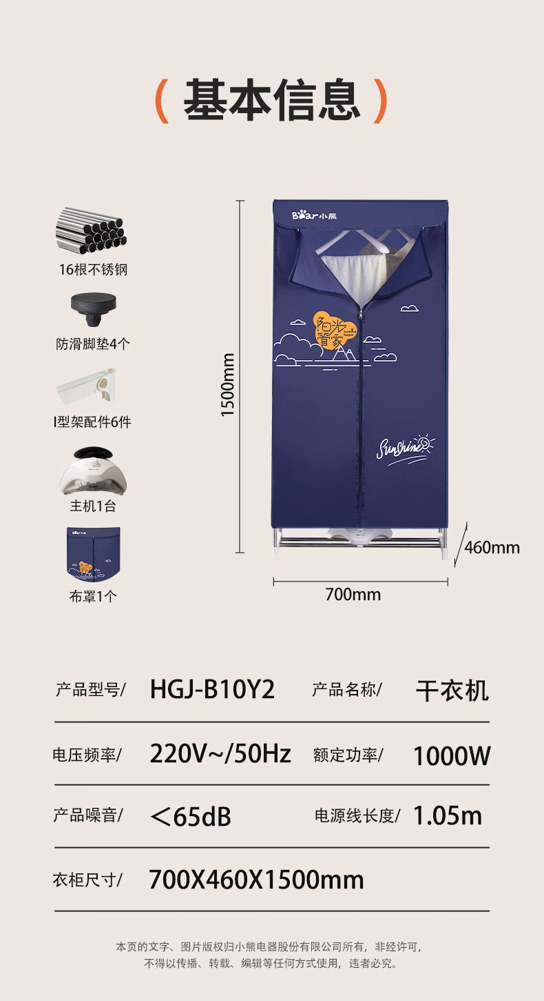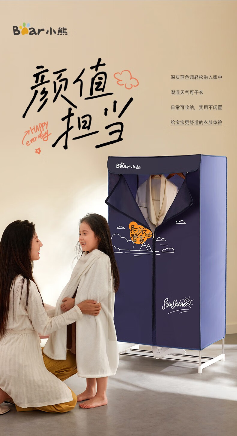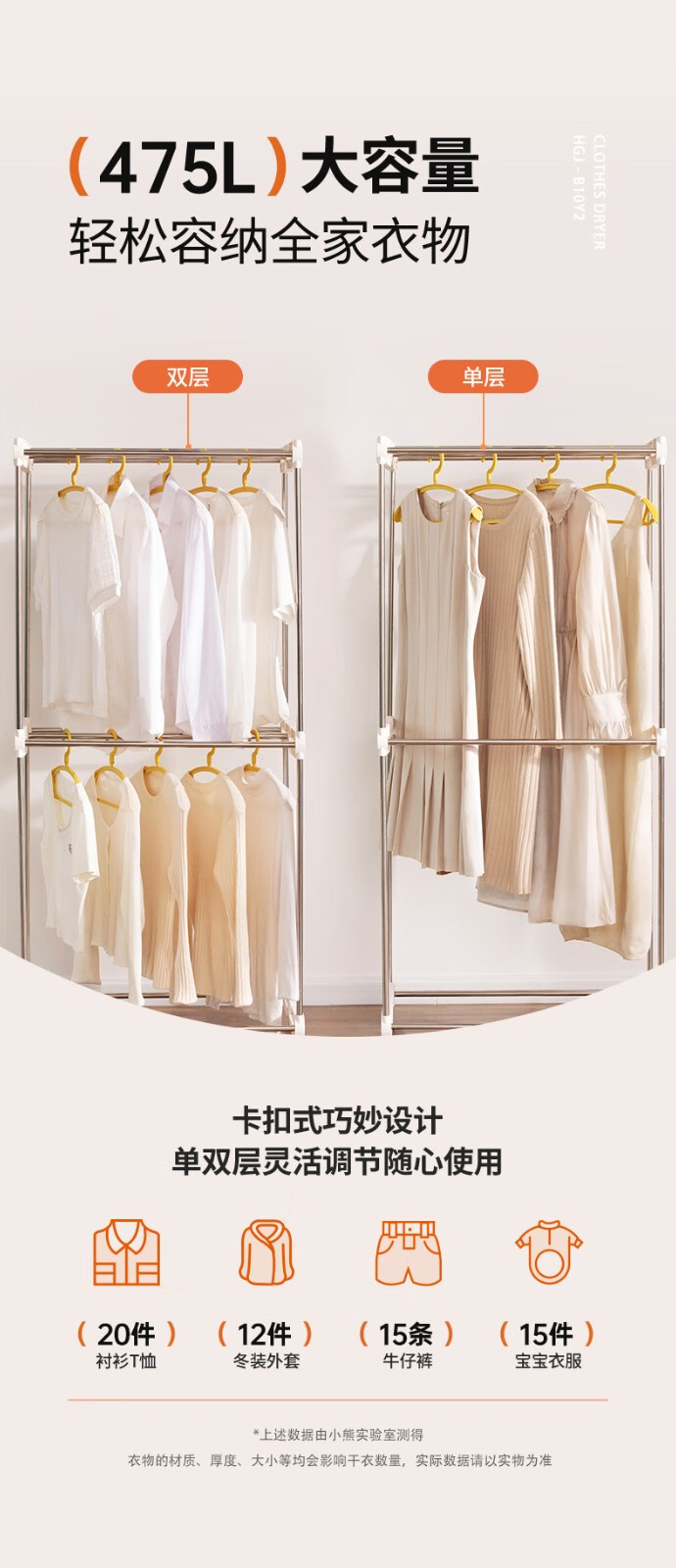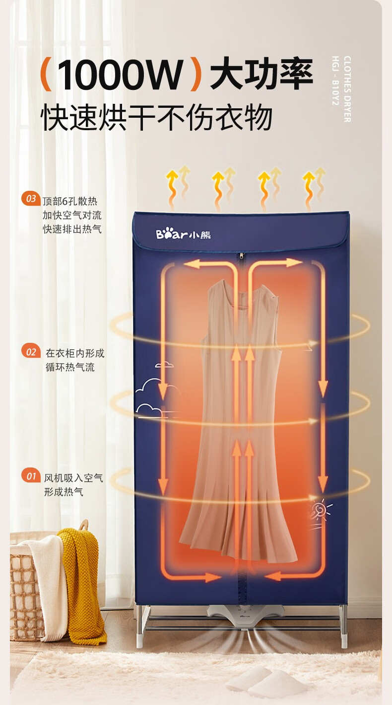 小熊(Bear) 烘干机家用 干衣机 烘衣机 小型烘干机 衣服家用烘干 衣柜内衣消毒机 风干机 15kg承重+99%杀菌+双层热风烘干