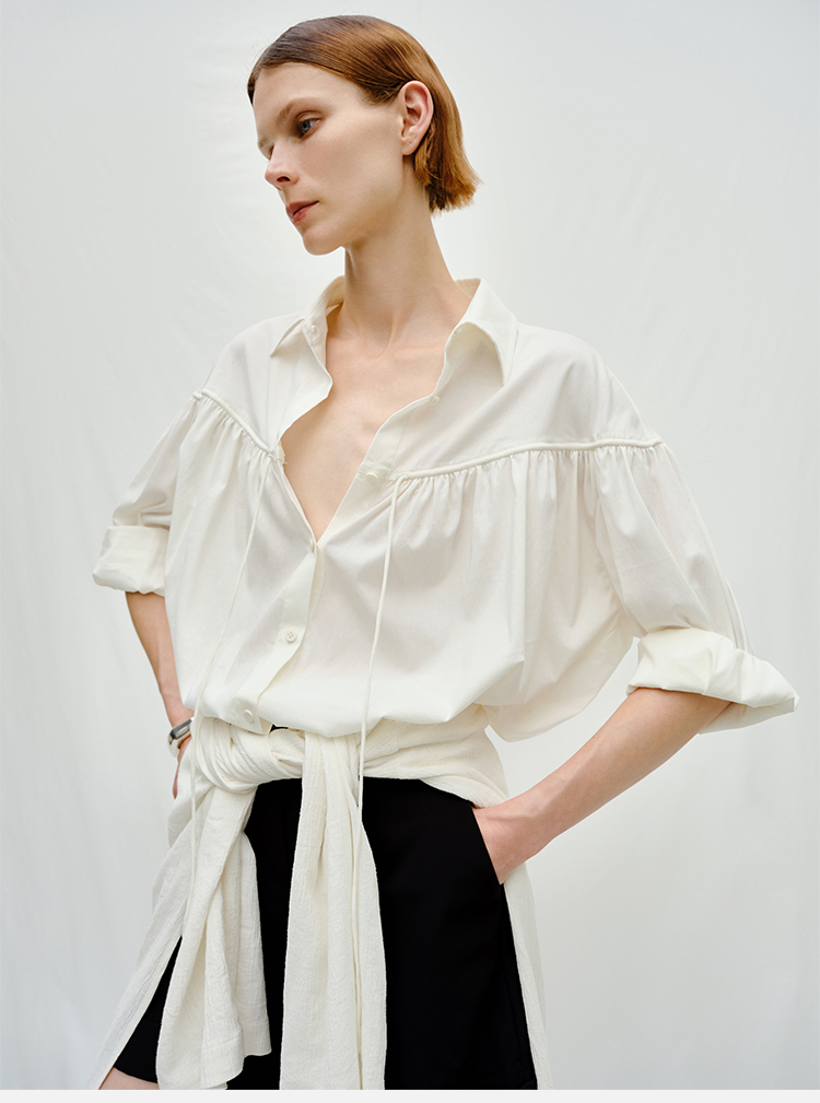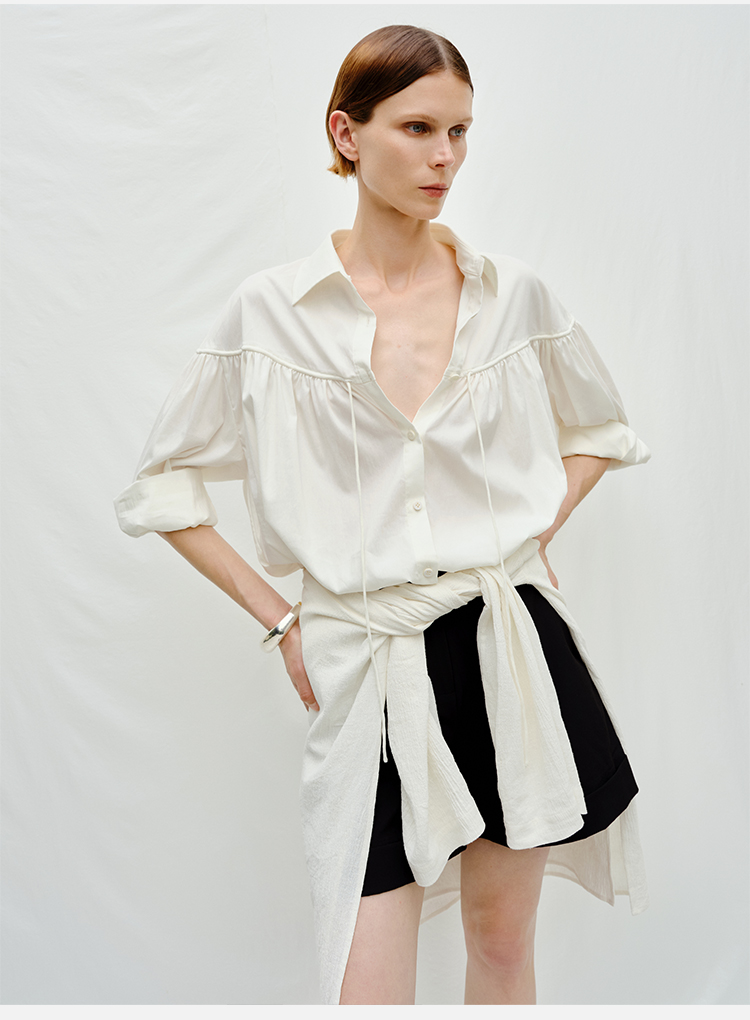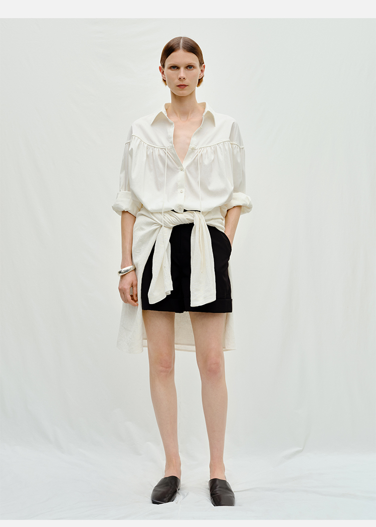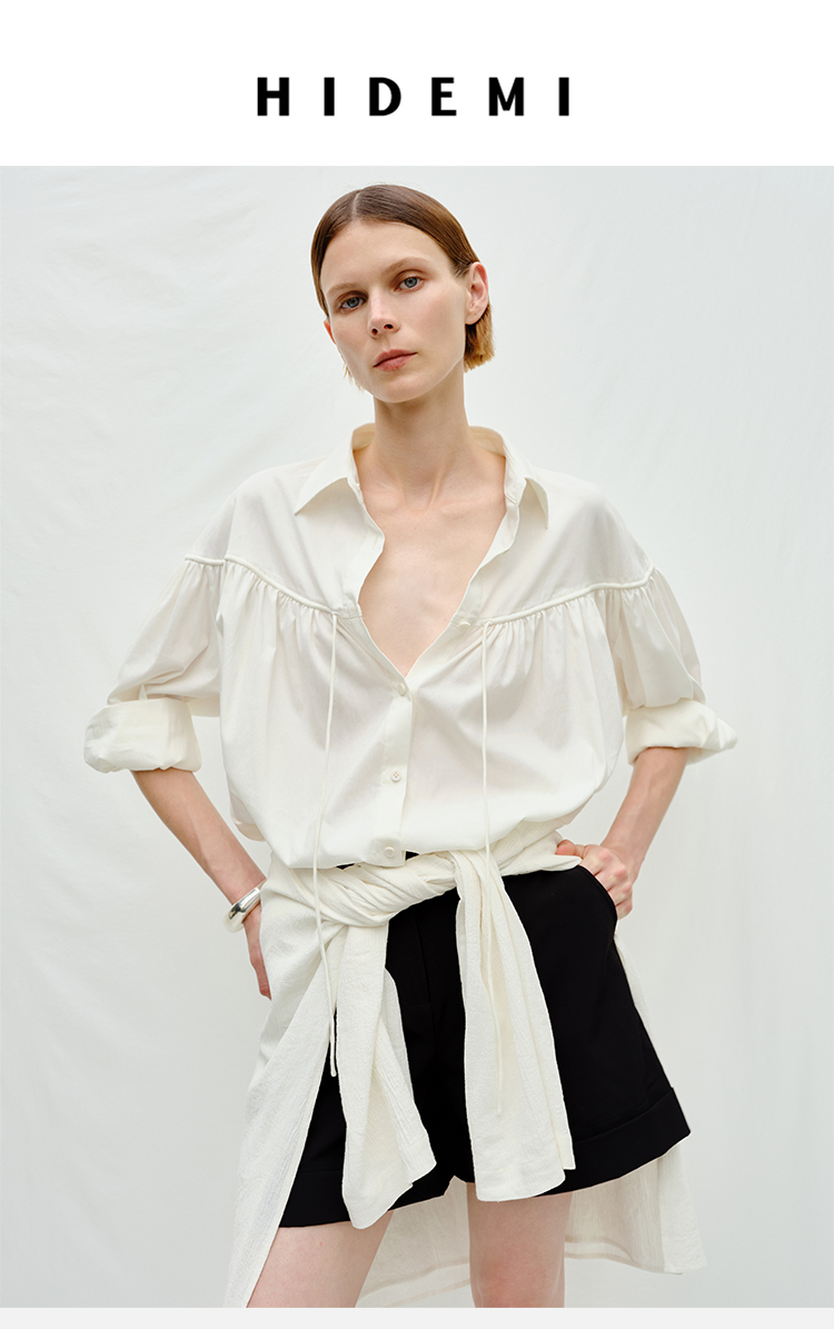 HIDEMI度假系列水洗亚麻褶皱细带极简款翻领衬衫