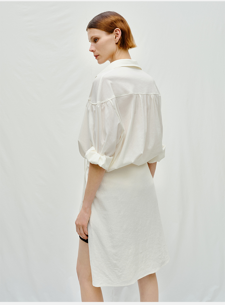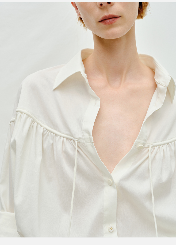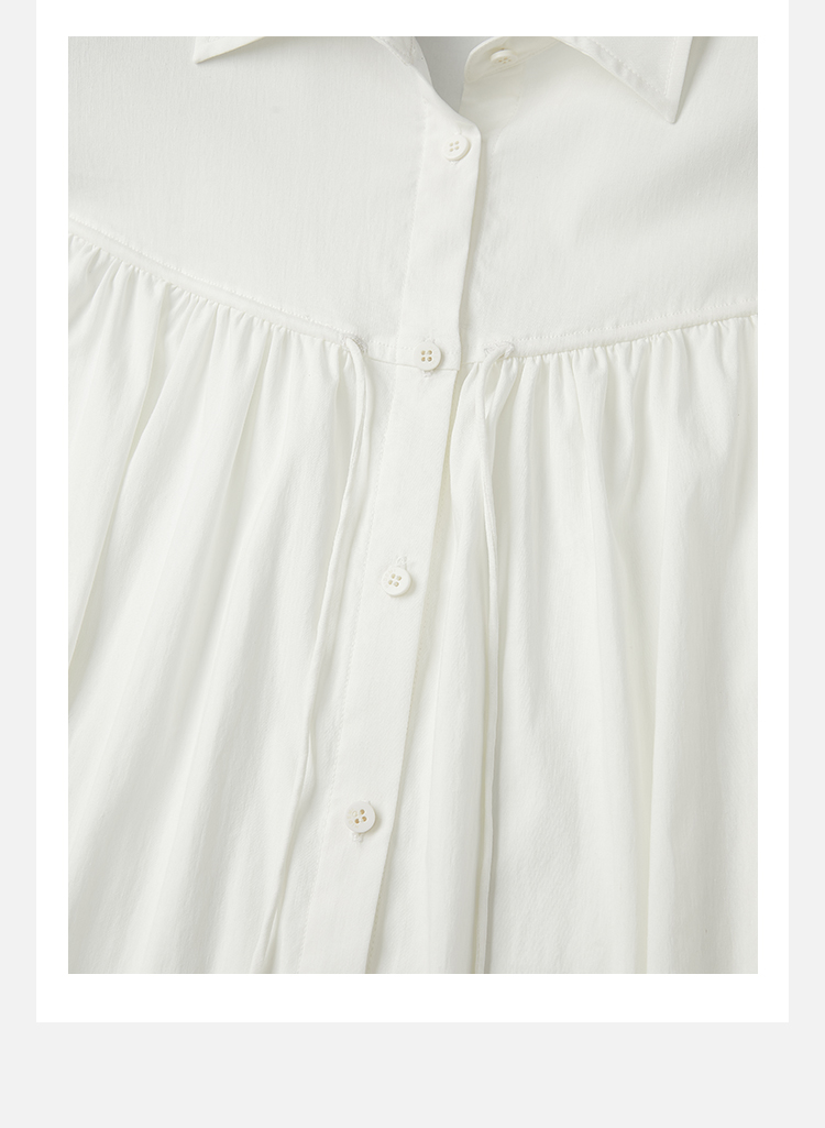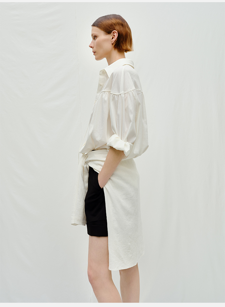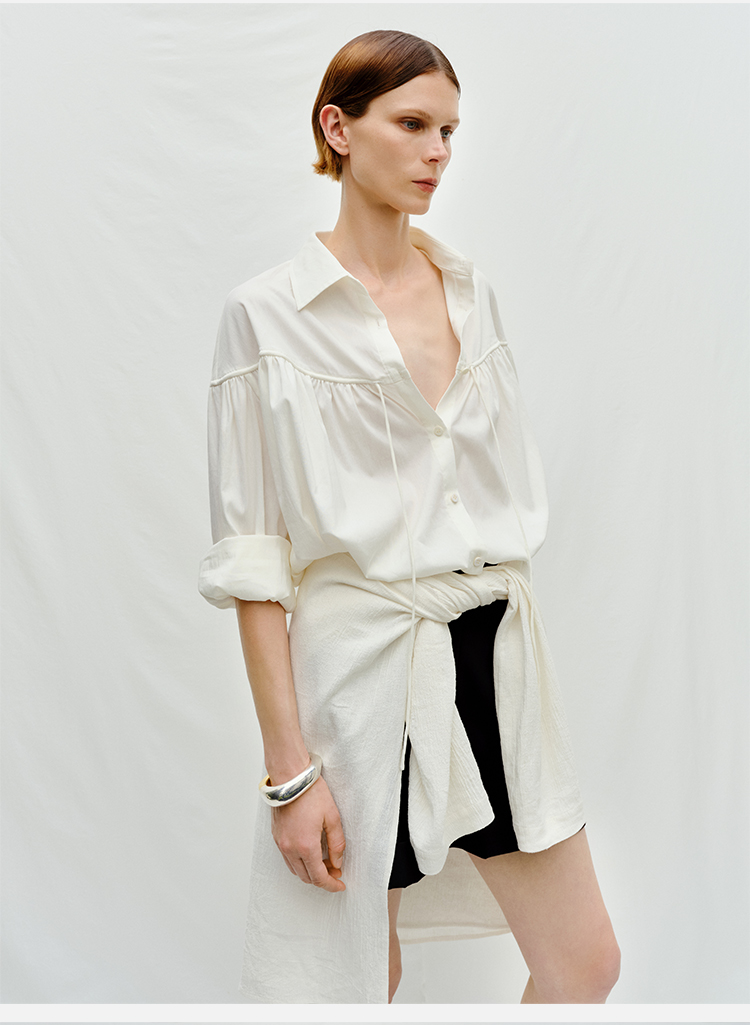 HIDEMI度假系列水洗亚麻褶皱细带极简款翻领衬衫