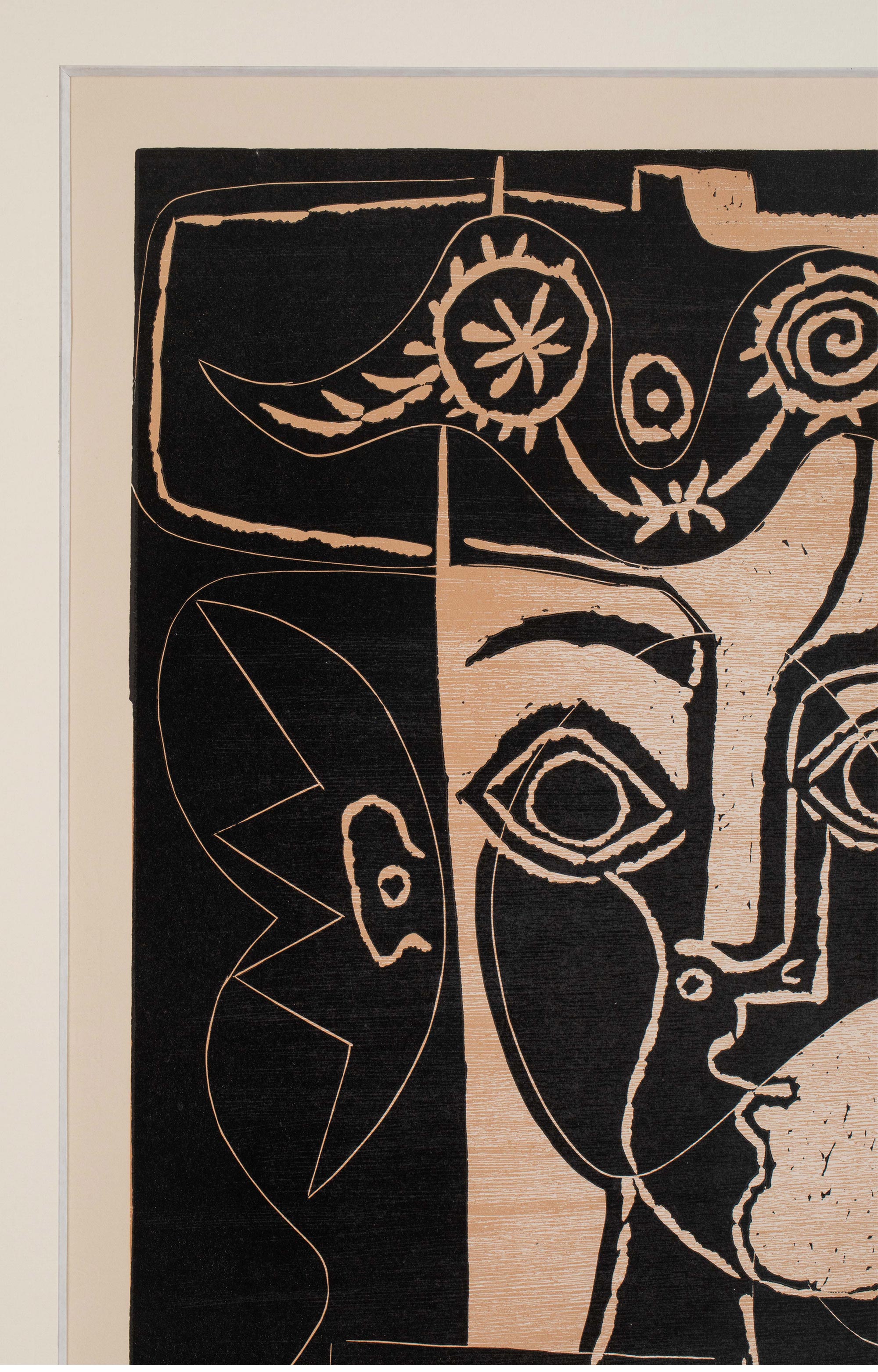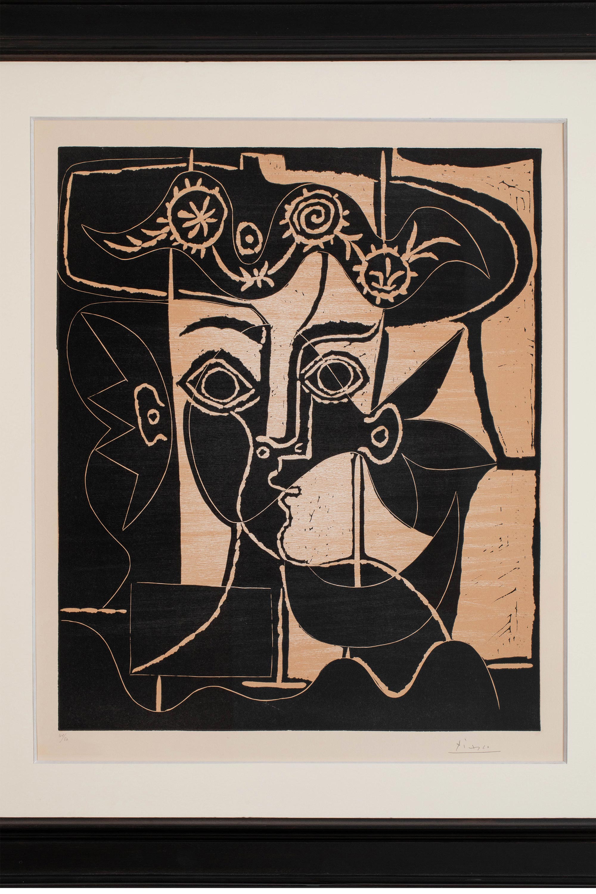1962年西班牙艺术大师签名创作出品限量麻胶版画作品《戴帽子的杰奎琳头像》