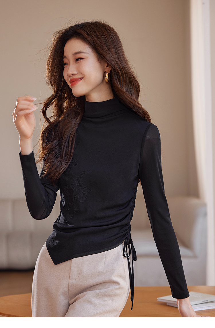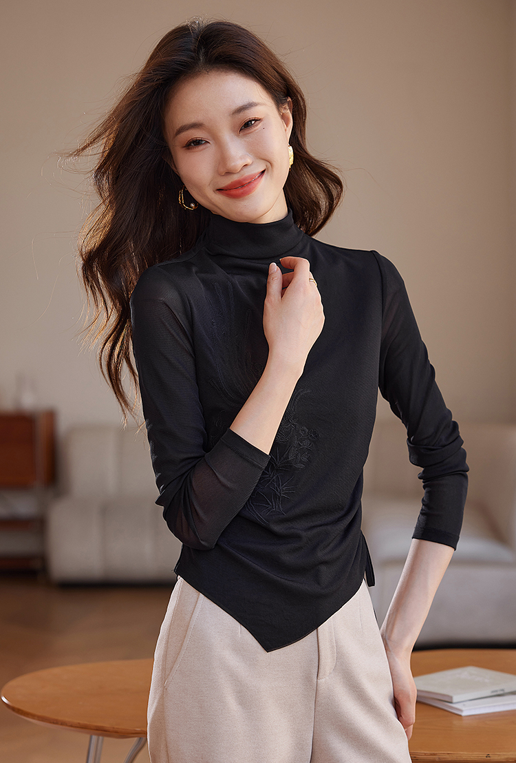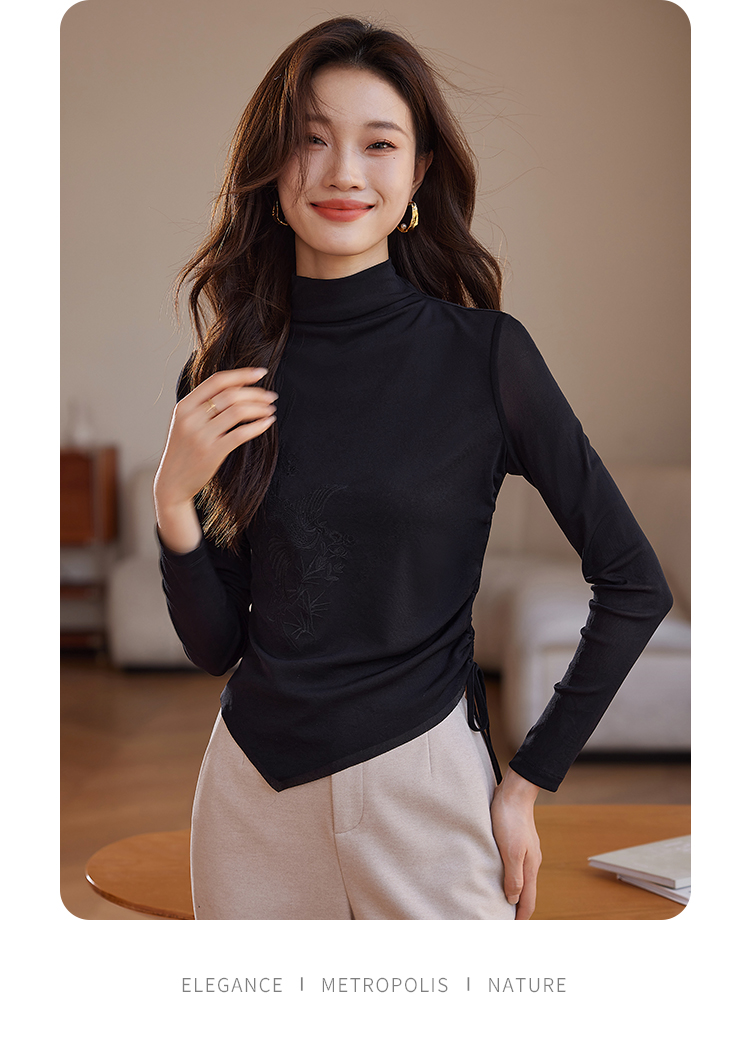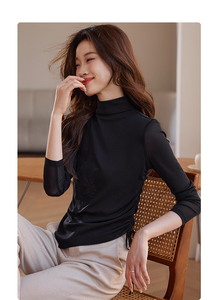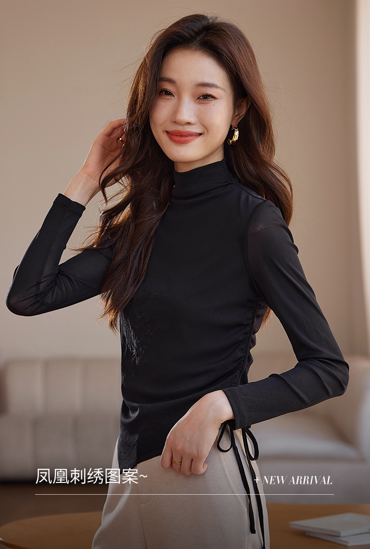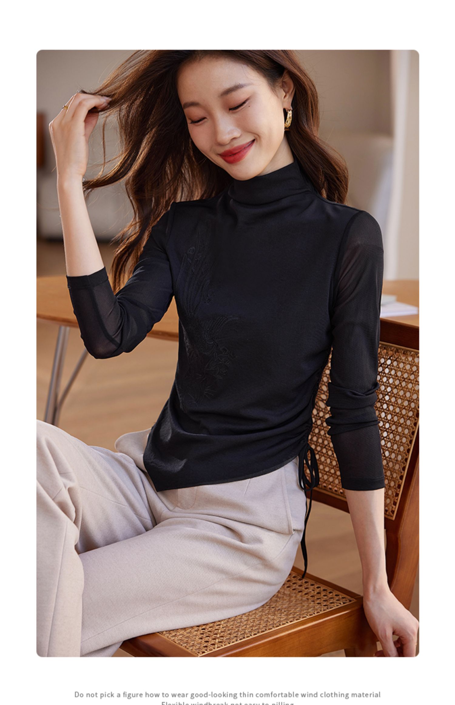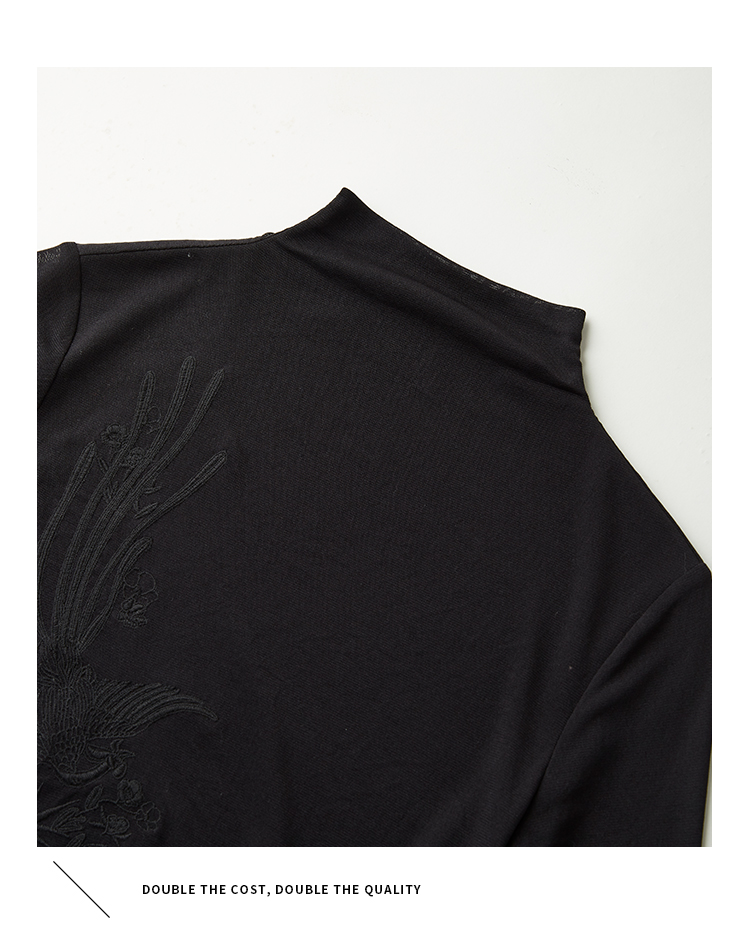【年终特卖】熙世界国风凤凰刺绣半高领打底衫秋冬内搭双层网纱别致修身上衣