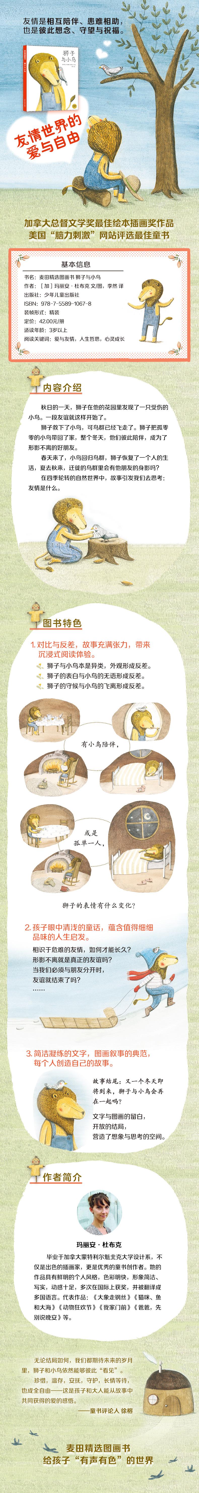 "•加拿大总督文学奖很好绘本插画奖作品 •美国“脑力刺激”网站评选很好童书 这是一本关于友谊的图画书,作者玛丽安•杜布克用简洁的文字和纯净的图画带着我们走进四季轮回中的自然世界,走进狮子与小鸟细腻的情感世界,激发我们去思索友谊的真谛。形影不离就是真正的友谊吗?当我们必须与朋友分离的时候,友谊就结束了吗? 这本书一如玛丽安•杜布克作品的一贯风格,图画是故事最重要的表现手段,娴熟的彩铅与水彩的综合运用营造出清新、温暖、和谐的意境之美,并通过细节的勾勒讲述故事。如果不看文字,只通过图画,孩子完全可以了解故事的内容。画面中大量的留白也为读者预留了想象与思考的空间。 简简单单的故事既是孩子眼中清浅的童话,也有我们人生可以慢慢品味的道理,具有直抵人心的力量。开放的故事结局,让每个人都能读出自己的故事,牵动出各自的感慨。 "