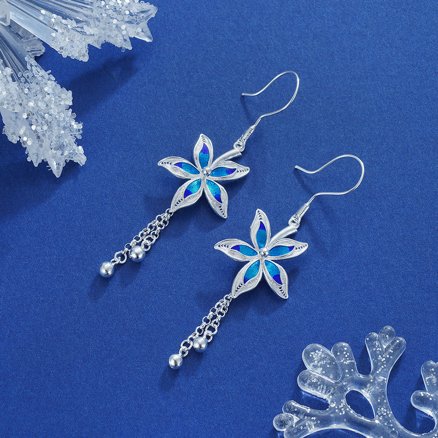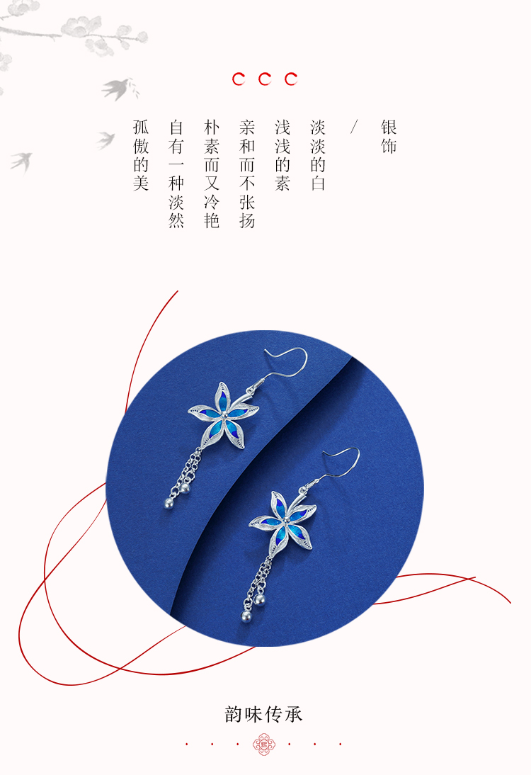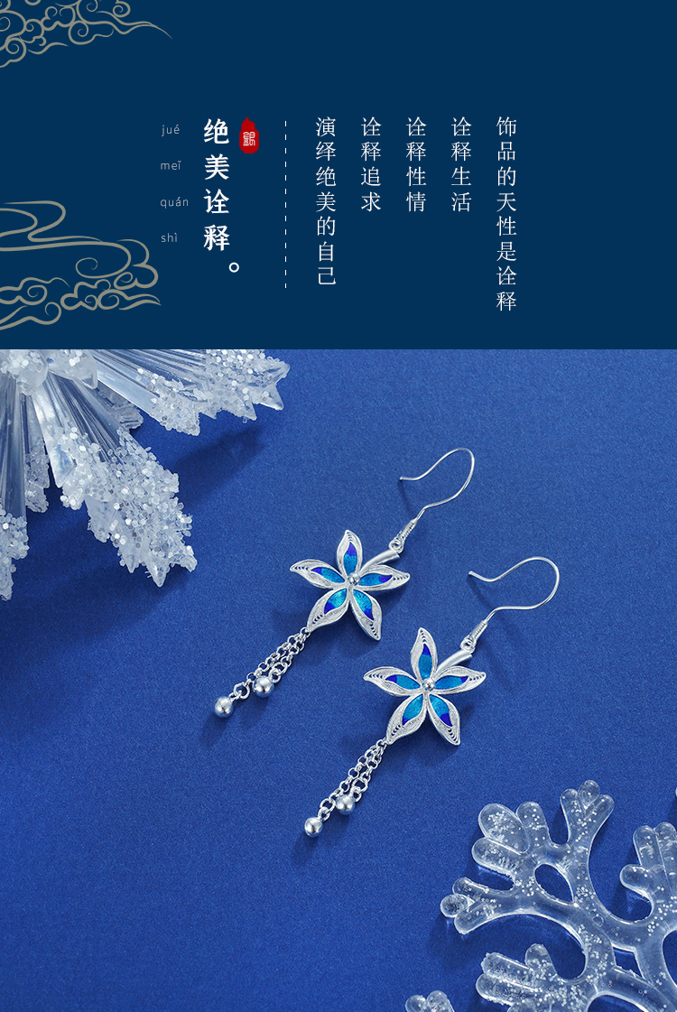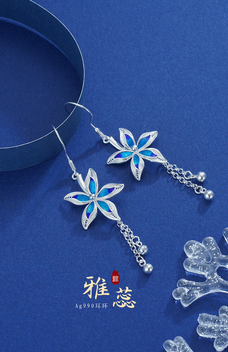 【寓意】:耳饰以随风飞舞的花朵为灵感原型,运用花丝工艺呈现花卉舒展之态。结合景泰蓝填色工艺,于纯白基底上点缀,在清冷质感中透出灵动生机。