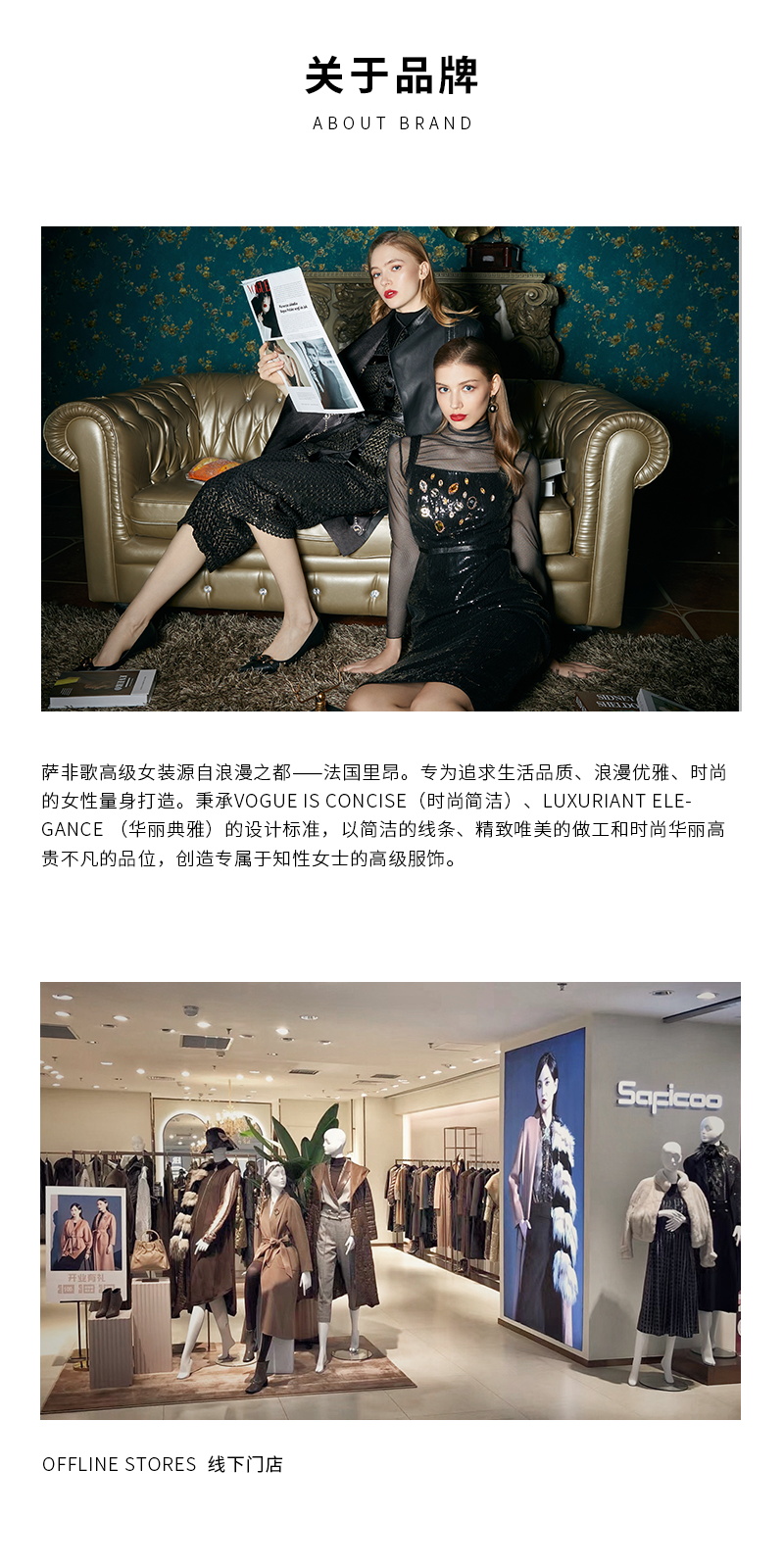 SAFICOO高级女装源自法国巴黎,专为追求品质生活、浪漫优雅的时尚女性量身打造。秉承时尚简洁、华丽典雅的设计标准,以简洁的线条、精精致唯美的做工和时尚华丽、高贵不凡的品位,创造专属知性女士的高级服饰