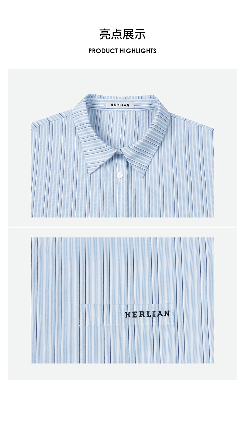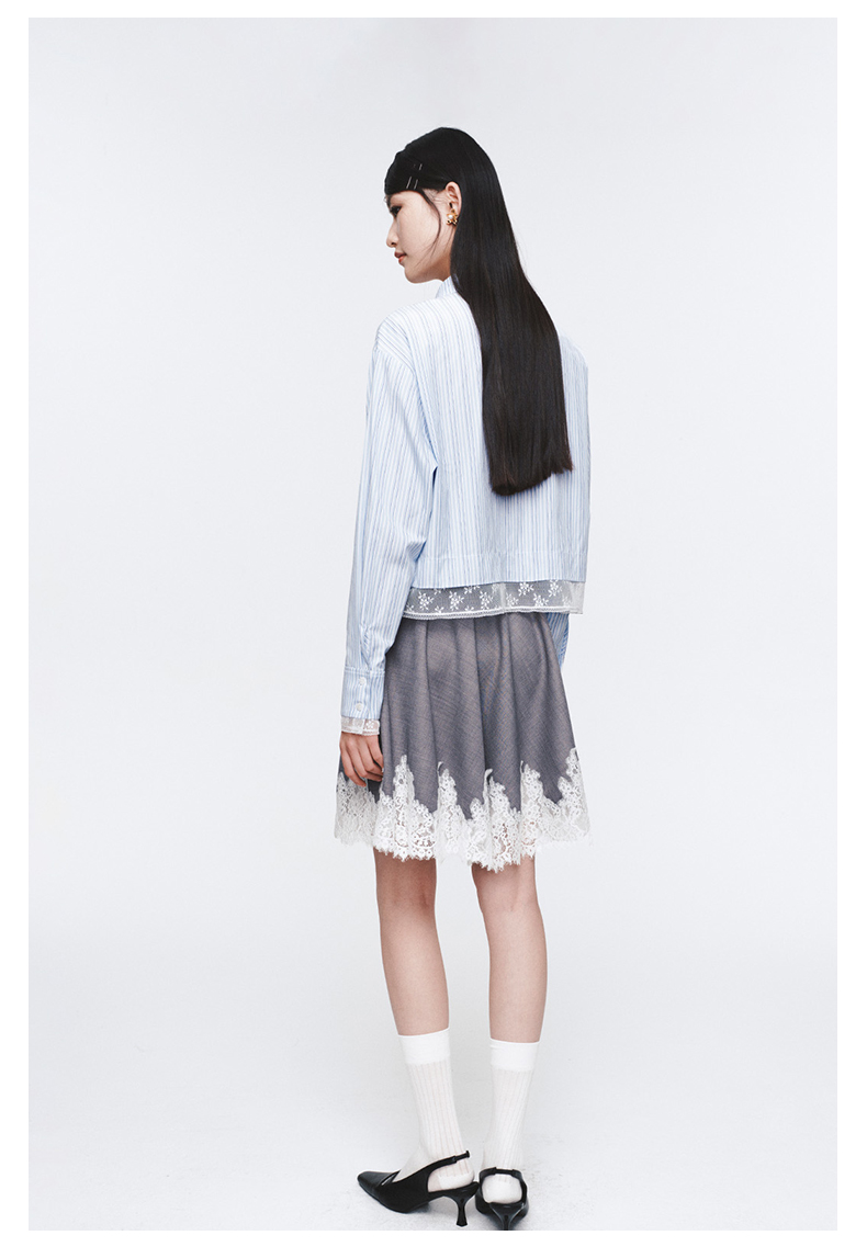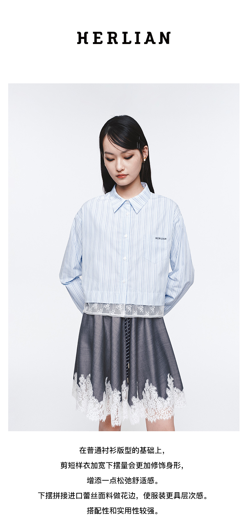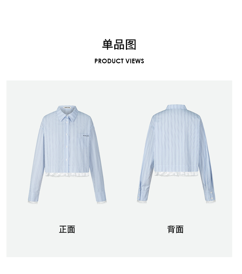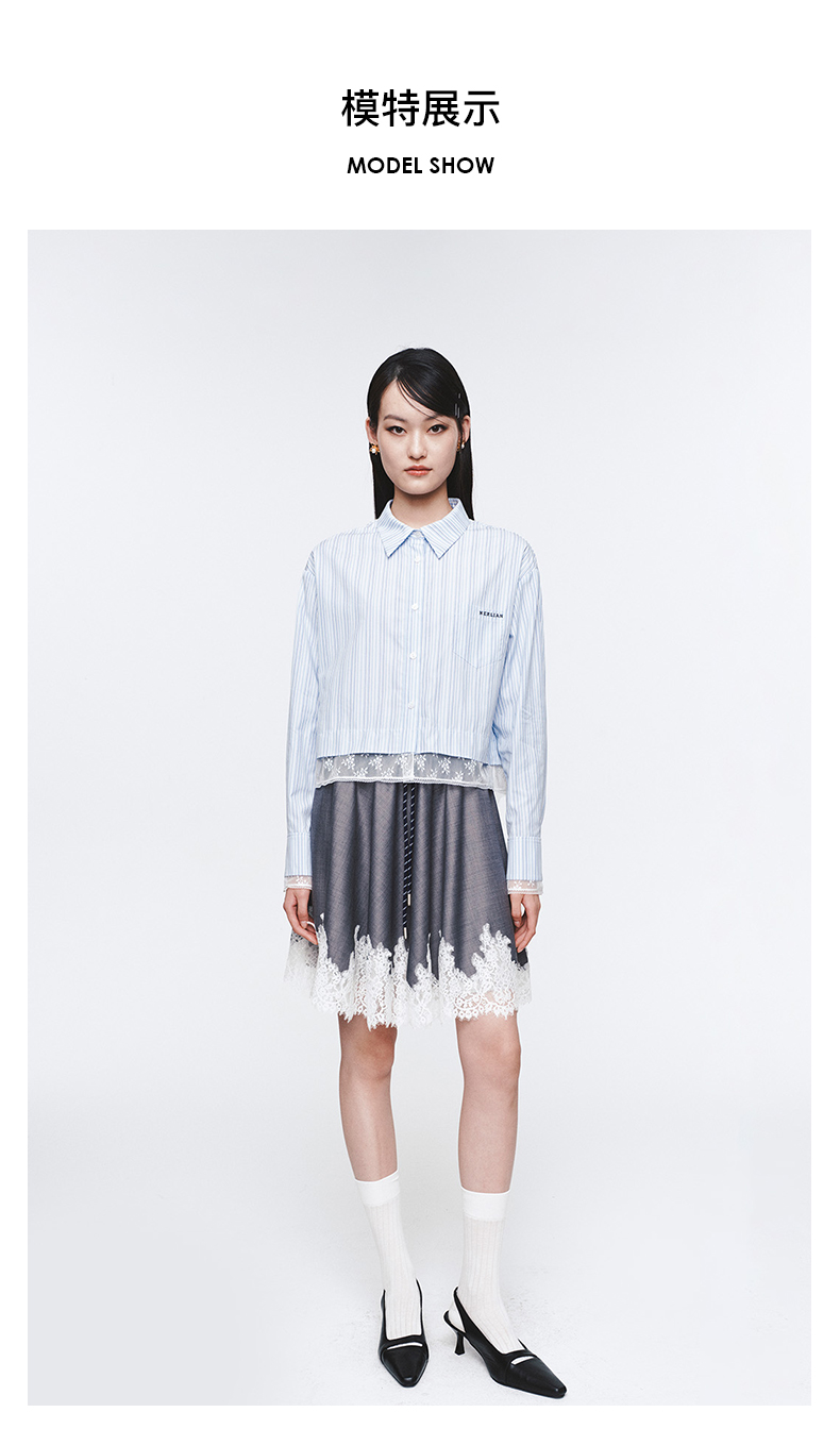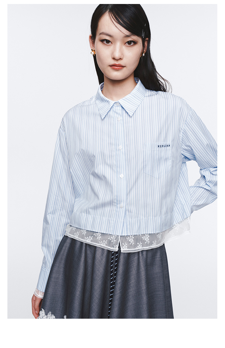 Herlian2025年蕾丝拼接条纹长袖衬衫女士花边衬衫polo上衣