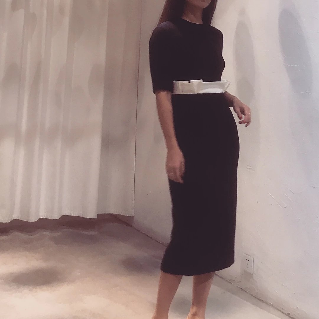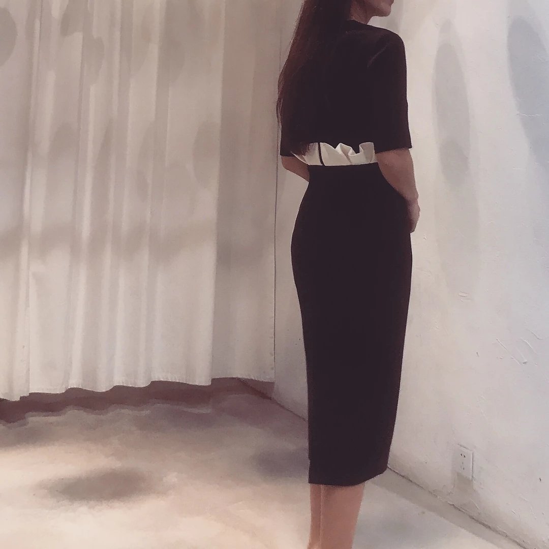 黑色腰带式装饰连身裙以白色荷叶边腰带式装饰为简洁的裙身廓形增加亮点,注入优雅女人味。中袖长度,中长裙身,一切都优雅迷人得恰到好处,尽显高贵格调。裙身已内附胸垫,勾勒曲线的同时令穿着更加舒适⾃如。