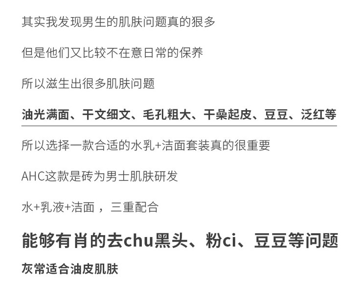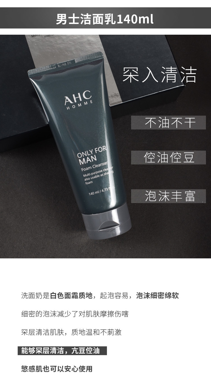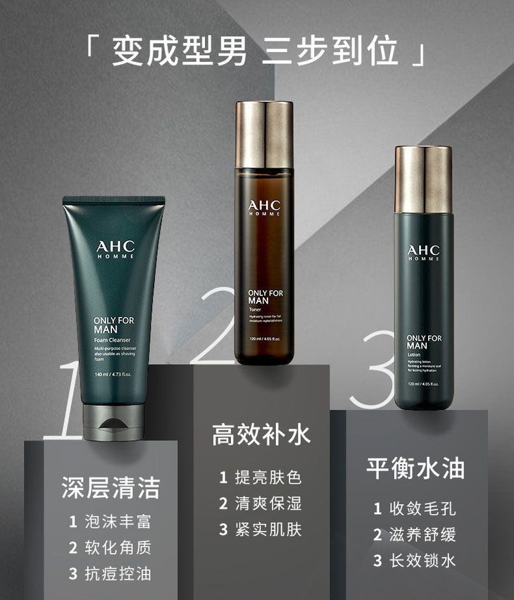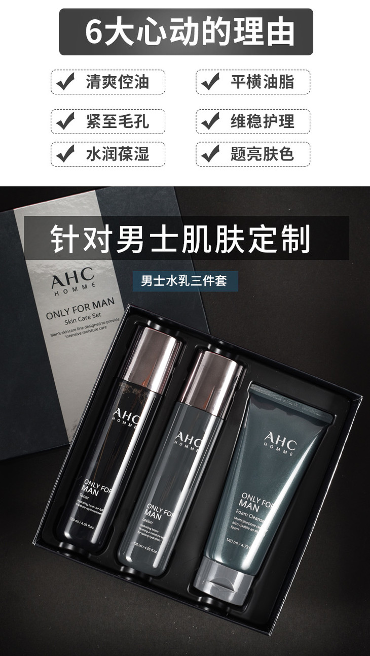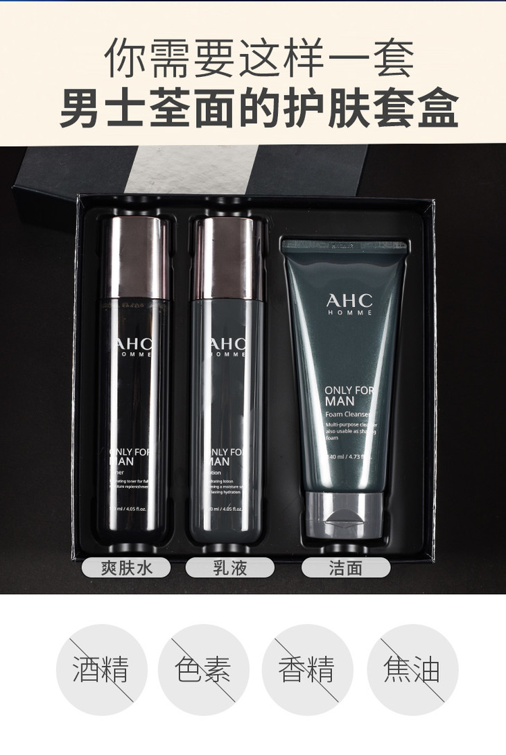 韩国 AHC男士水乳洗面奶三件套装 全套护理祛痘深层清洁控油补水保湿
