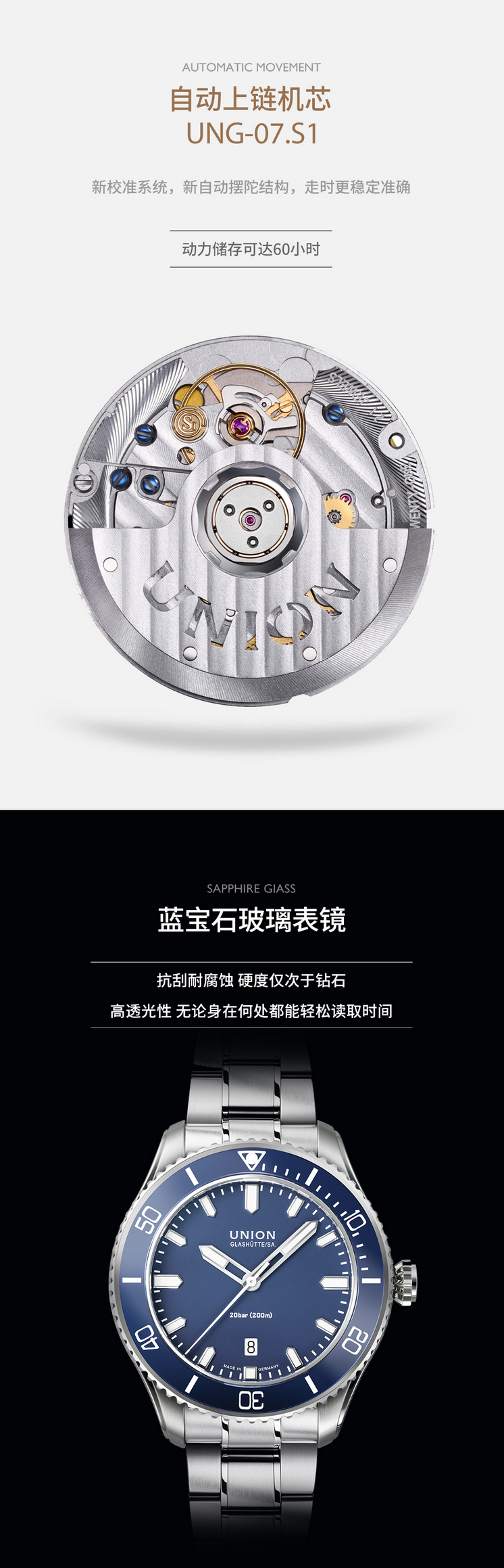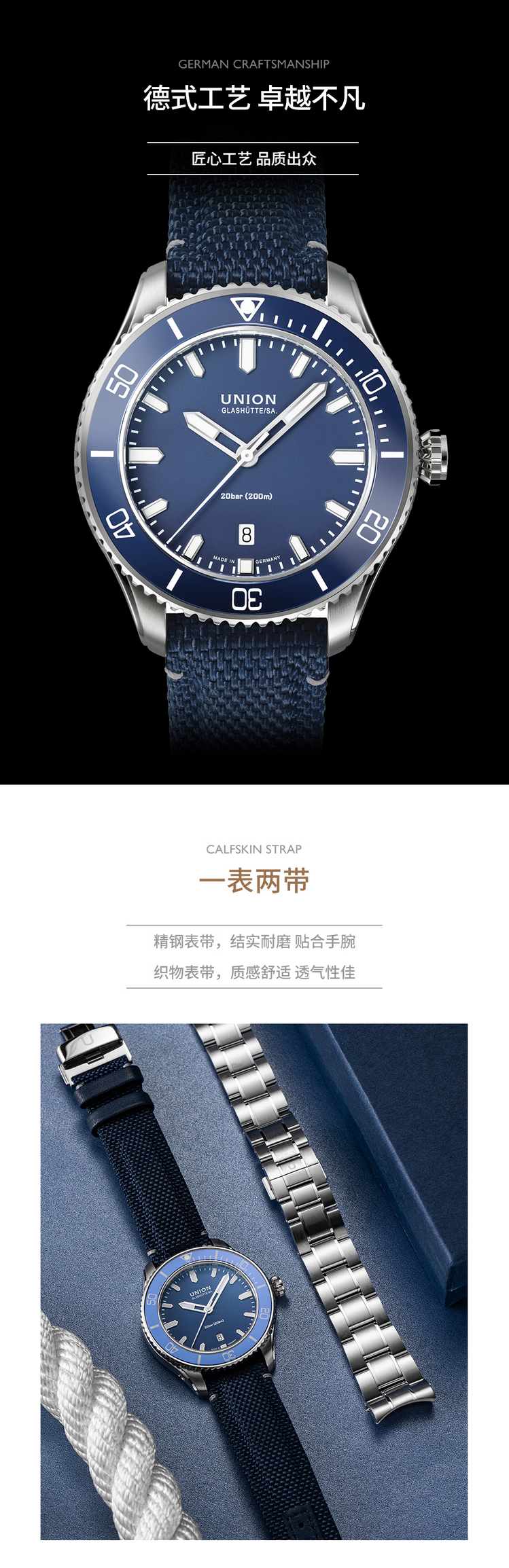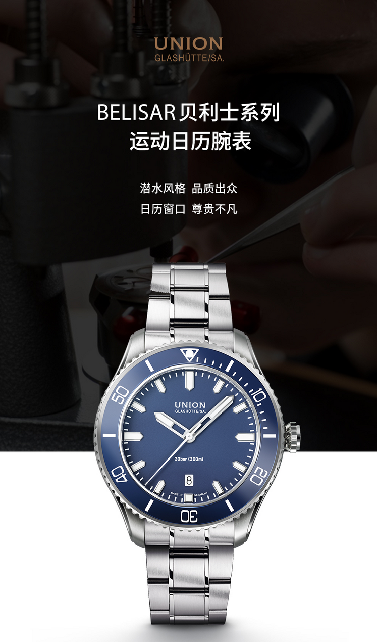 宇联(UNION GLASHÜTTE)德国手表 贝利士系列 一表两带男士运动机械腕表 D009.907.11.047.00