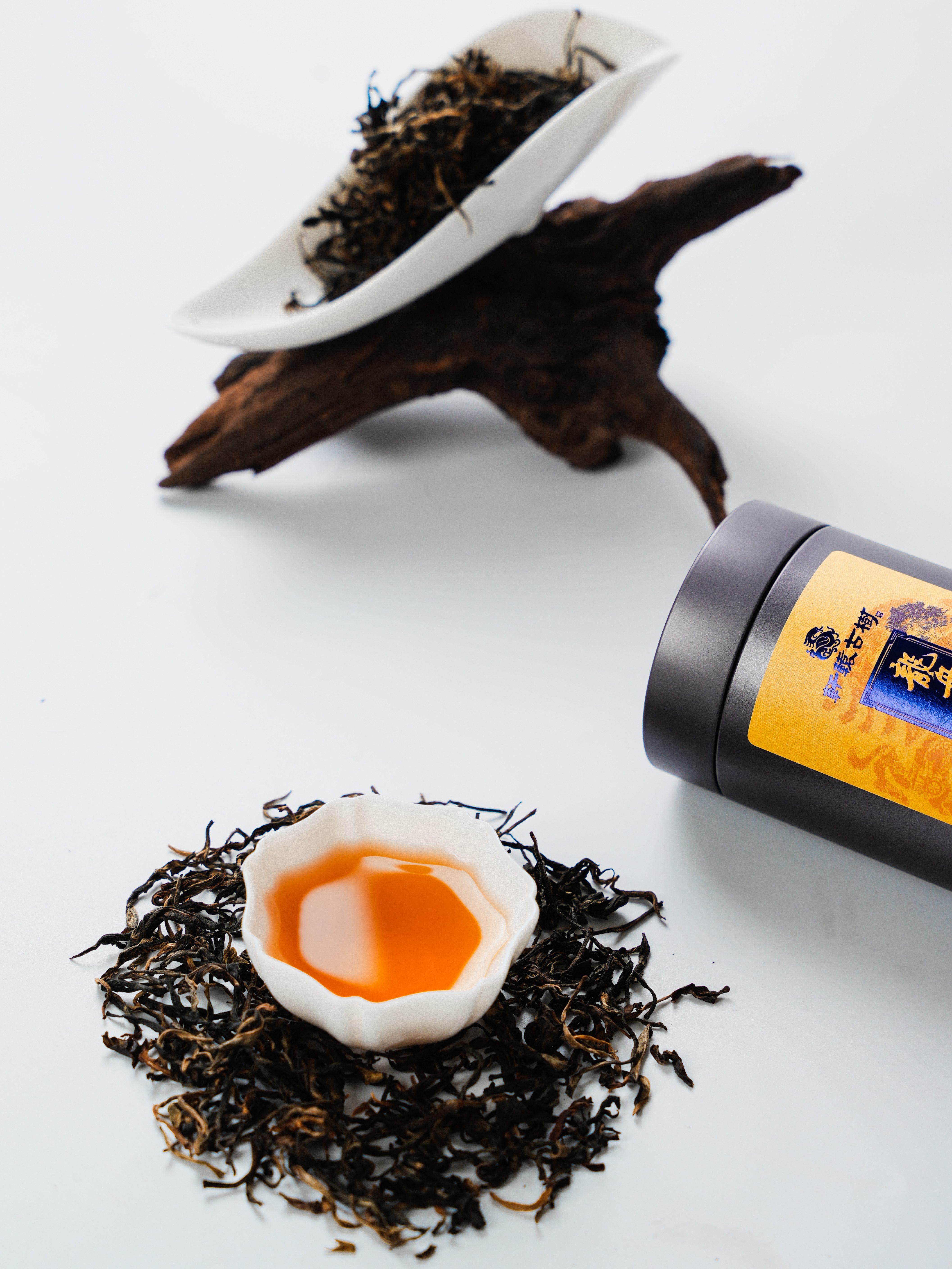 冲泡后汤色红浓透亮,如琥珀般温润,茶汤表面泛着细腻油光,逆光可见茶毫悬浮,稠润感十足,是古树红茶才有的胶质质感。
