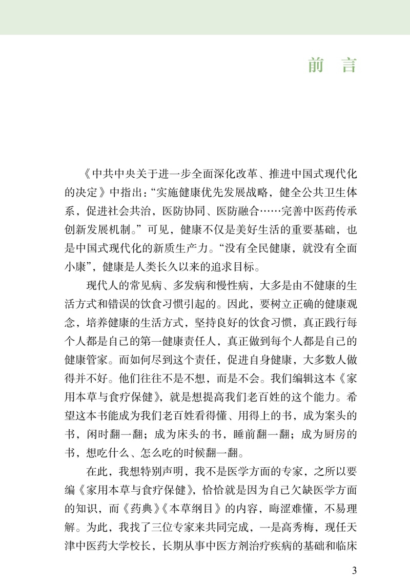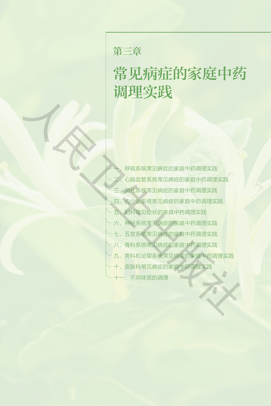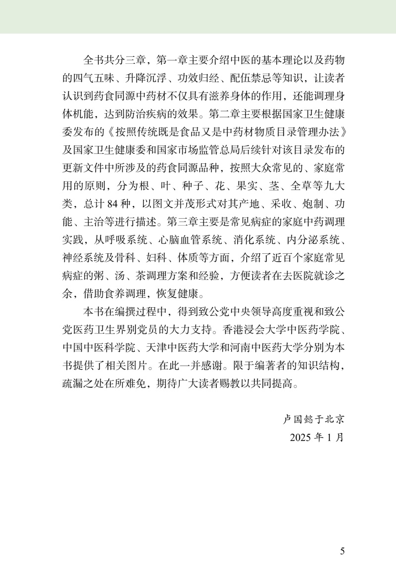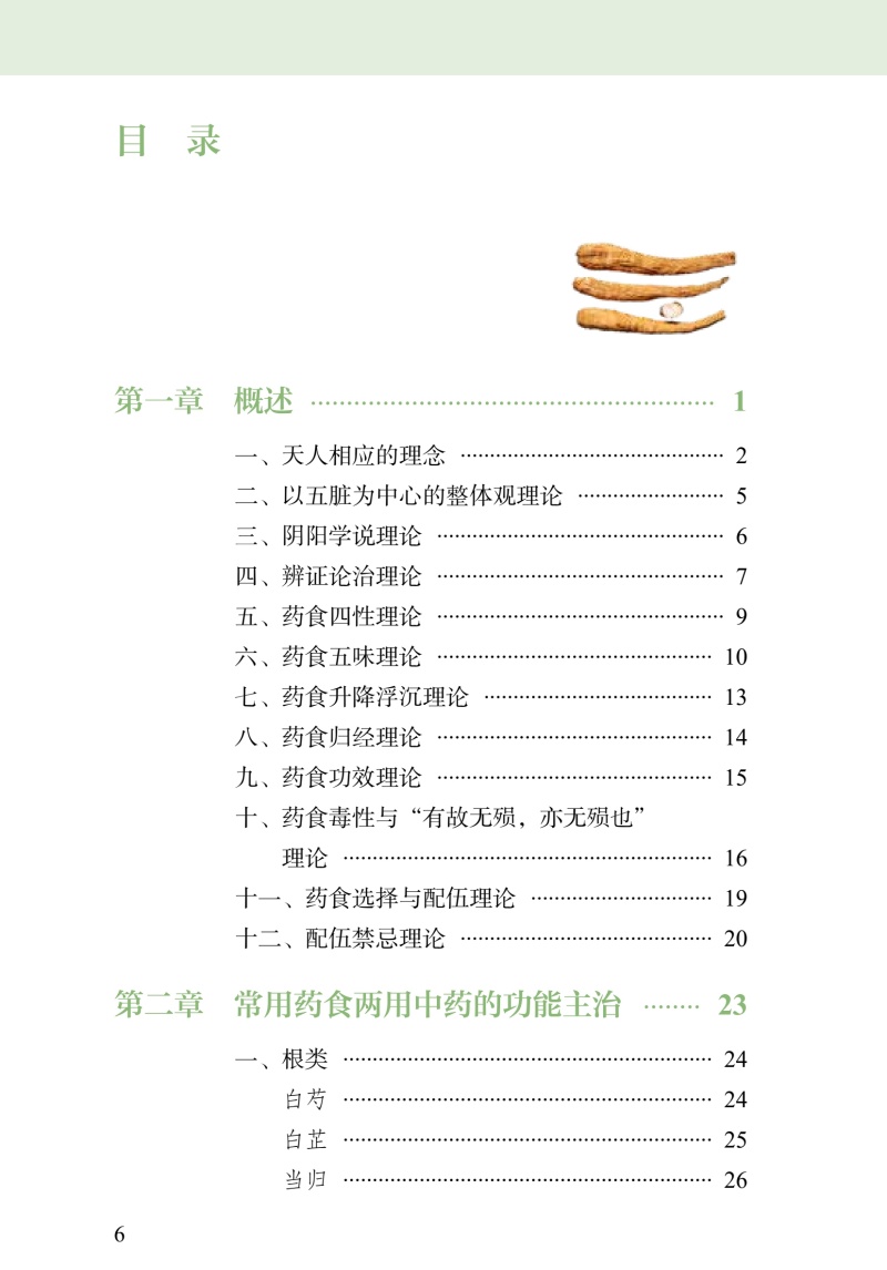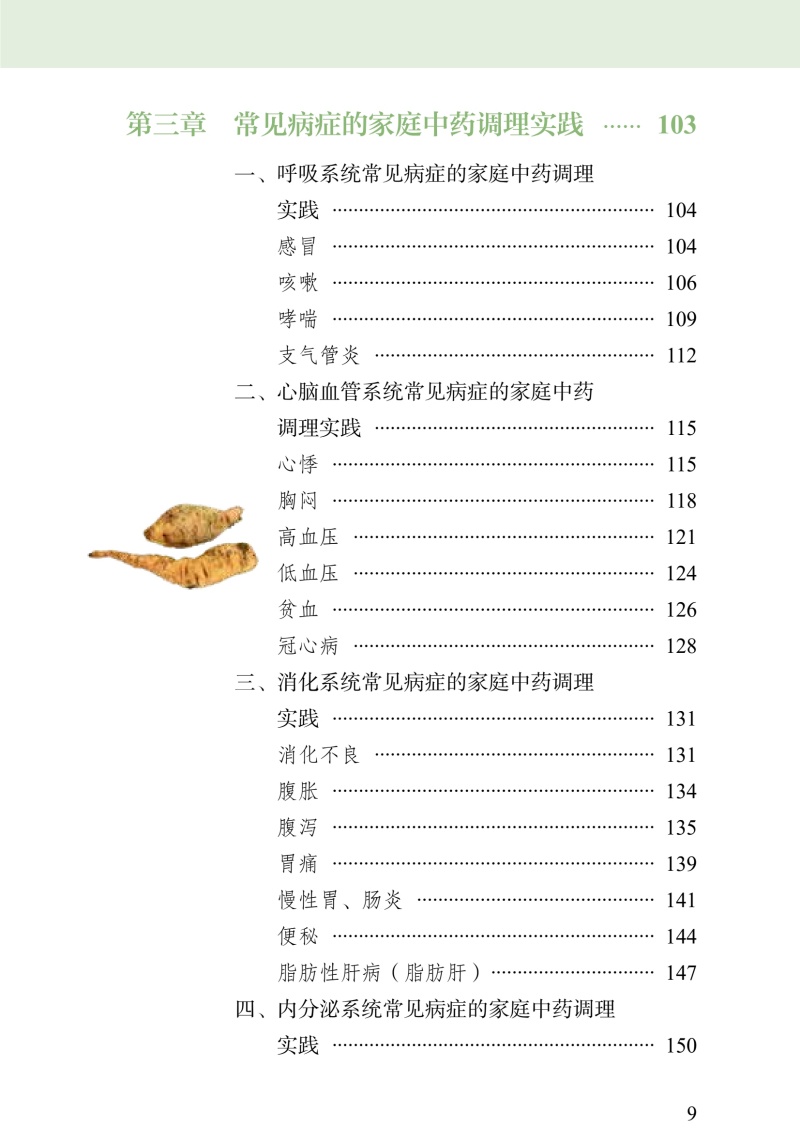全书共分三章,第一章主要介绍中医的阴阳、五行、脏腑、经络、病因、病机、治则、治法、整体观念和辨证论治理论以及药物的四气五味、升降沉浮、功效归经、配伍禁忌等知识,让读者认识到药食同源中药材不仅具有滋养身体的作用,还能调理身体机能,达到防治疾病的效果。第二章主要针对该目录发布的更新文件中所涉及的药食同源品种,按照根、叶、种子、花、果实、茎、全草等十七大类,以补益药、解表药、清热药、温里药、理气药、消食药、止咳平喘药为主,总计约100种,以图文并茂形式对其产地、采收、炮制、功能、主治等进行详细讲述。第三章主要是常见症状的家庭中药调理实践,从呼吸、心脑血管、消化、内分泌、神经、皮肤、骨科、妇科等系统、科别和体质方面的近百个家庭常见病症中,介绍了药食同源的粥、汤、茶等调理方案和经验,帮助大家食养调理,恢复健康。